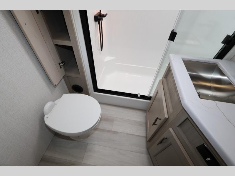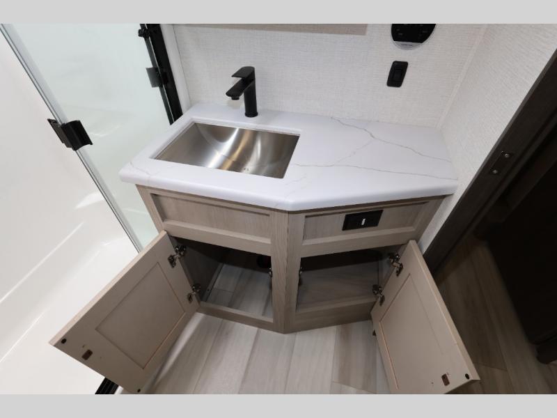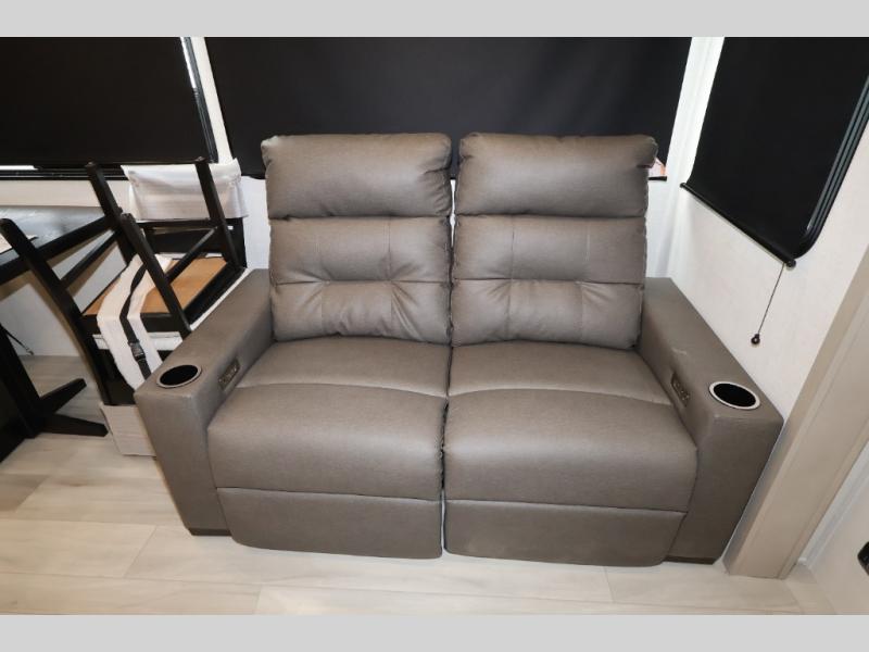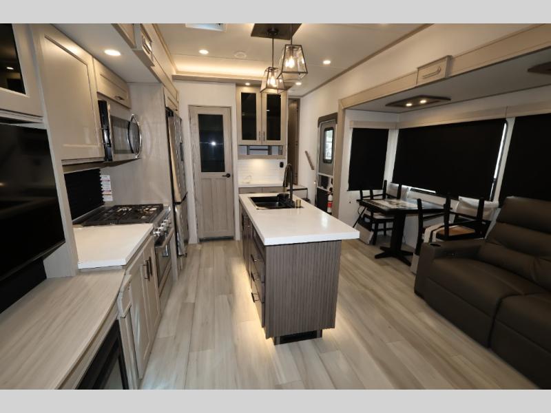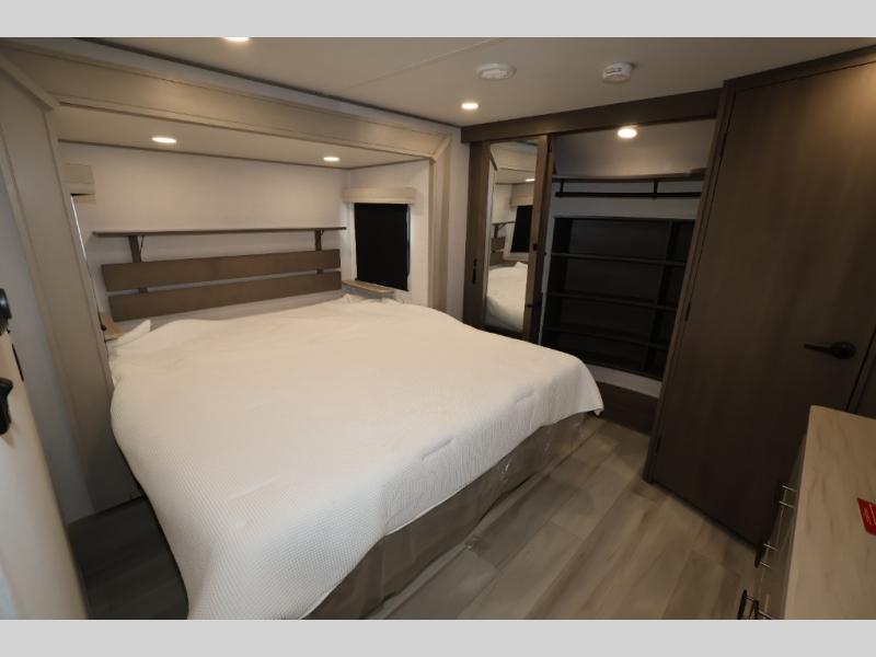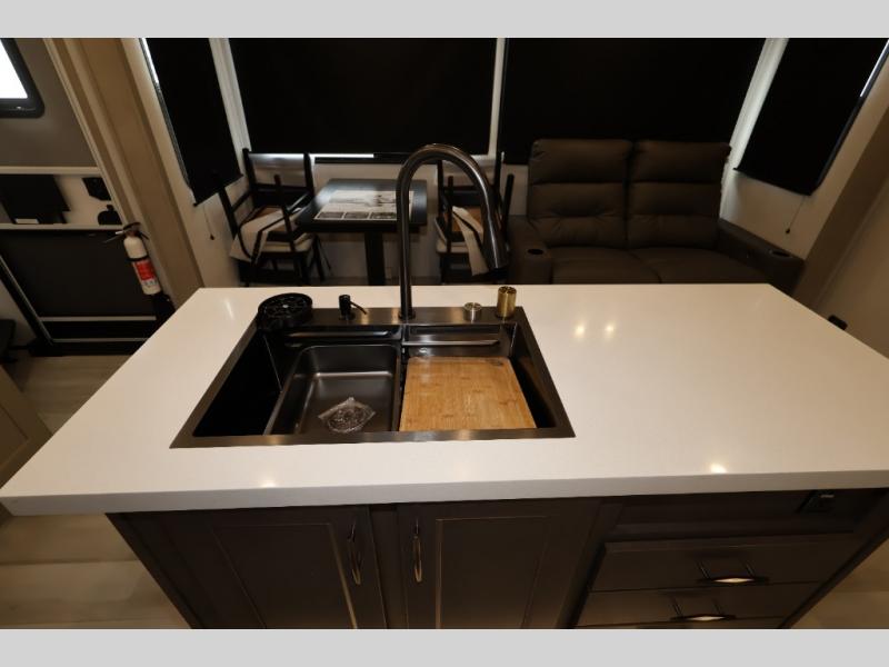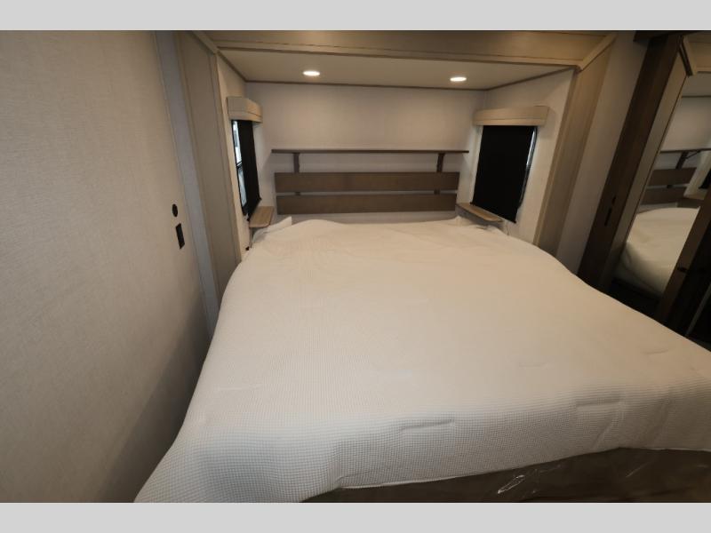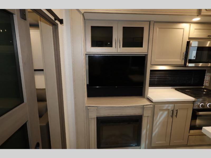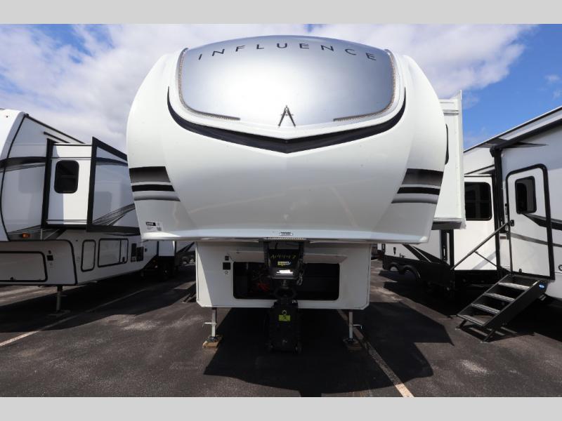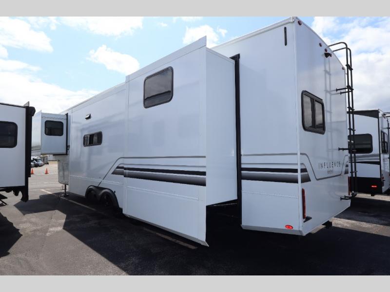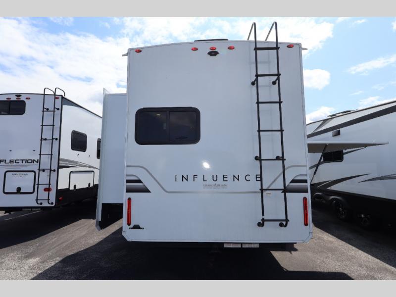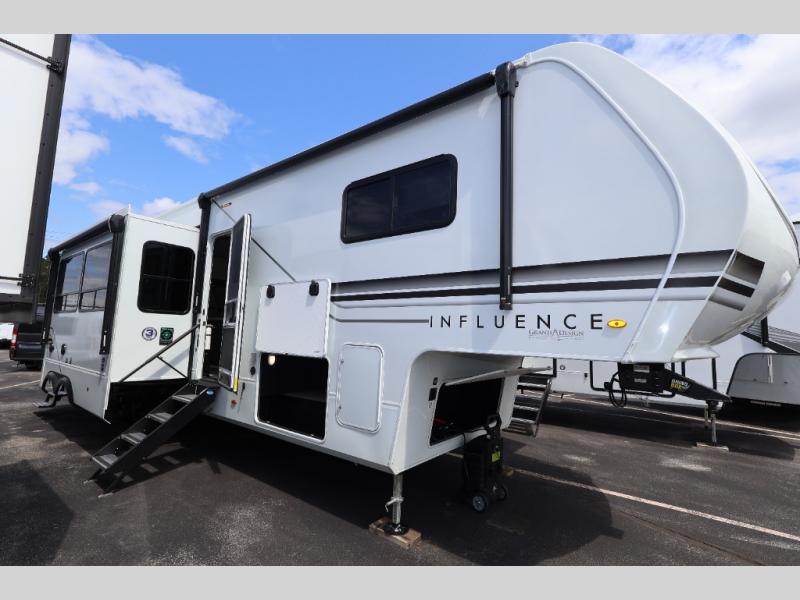 Any Grand Design Influence fifth wheel features five-sided aluminum cage construction with a walk-on roof and a fully enclosed underbelly with heated tanks and storage for all weather camping. For peace of mind, the MORryde CRE3000 Suspension system and ABS braking system will provide safe and smooth towing, and the 101" widebody construction offers all the room you need and that is before multiple slides are fully engaged. You will appreciate the keyed alike locks, slam-latch baggage doors with magnetic door catches, exterior security light, and solid surface entry steps. On the inside, Congoleum flooring, premium roller shades for privacy, a hallway handrail for safety, and nightstands with USB ports to keep all of your electronics fully charged. You will also love the On Demand tankless water heater when showering, plus the added heat and ambiance from an electric fireplace, and so much more!