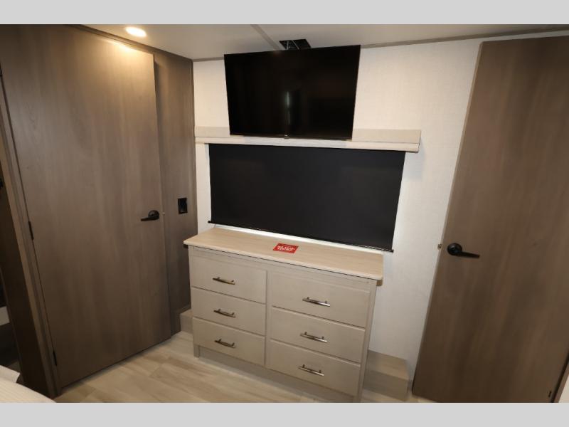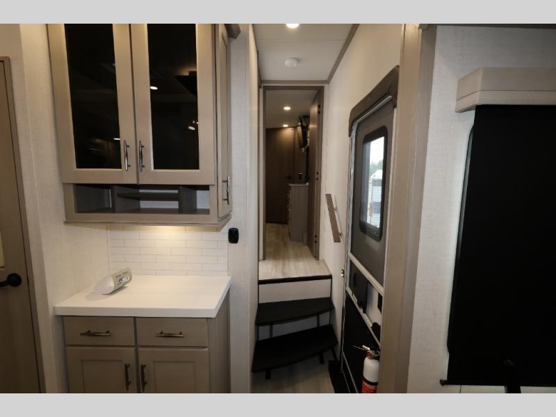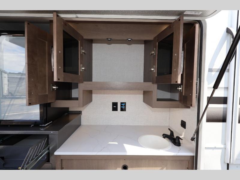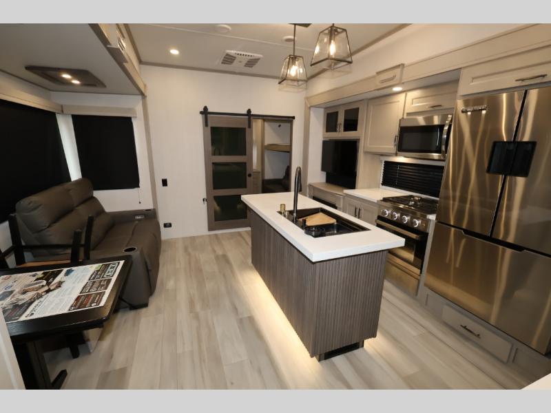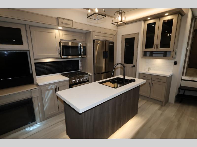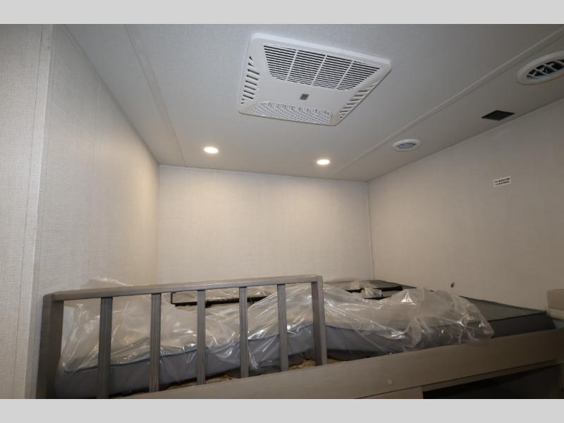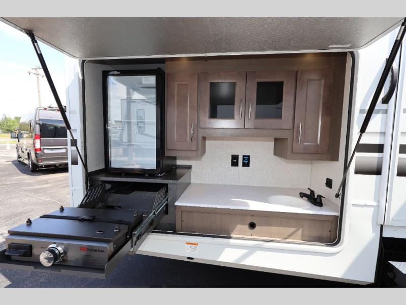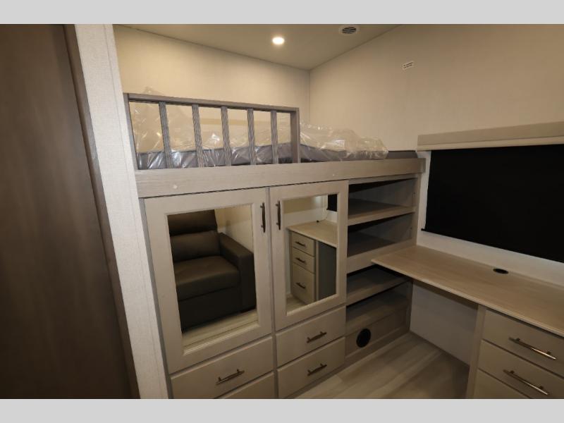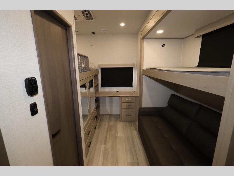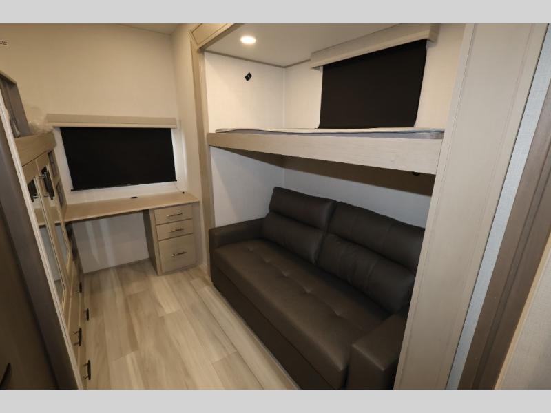 Grab the whole gang and head out in this fifth wheel featuring a private bunkhouse that sleeps five. This unit also features dual entry doors for added convenience with one set leading into a half bath, and quad slides for even more space in this widebody layout. The combined kitchen and living area featuring dual opposing slides offer space to dine and relax including theater seating for two opposite the entertainment center and fireplace. The chef in your group will appreciate the amenities for dreaming up dishes to feed everyone, and the outside griddle, sink and beverage cooler provides even more options. In front, a private bedroom and full bath with a queen bed or optional king, your choice. You can even add a washer and dryer with a space in front prepped for both if you like.