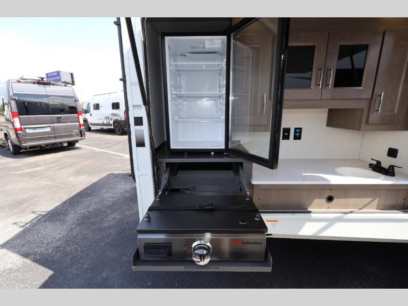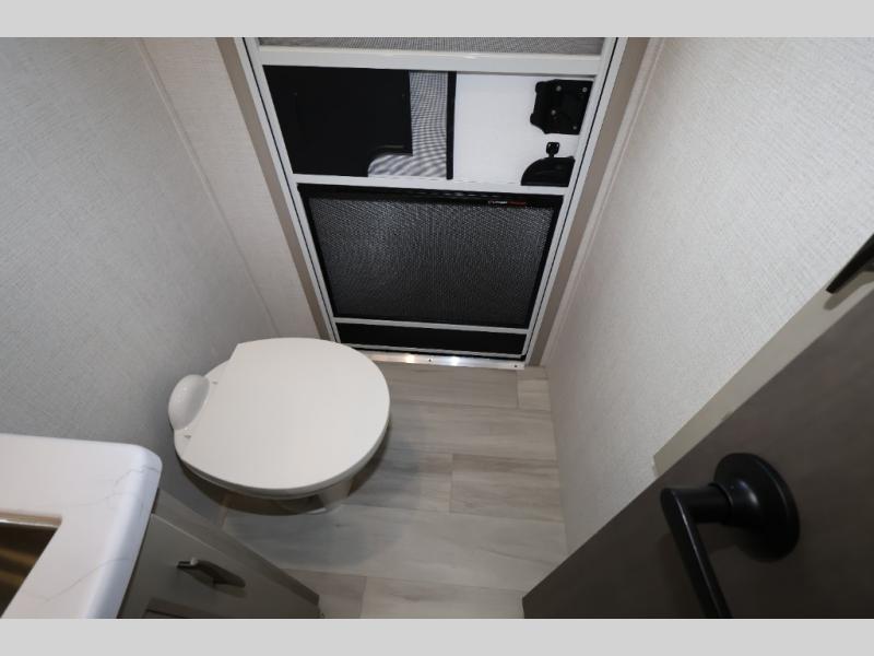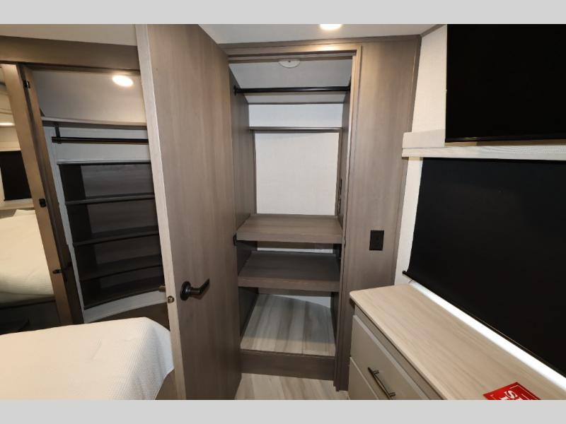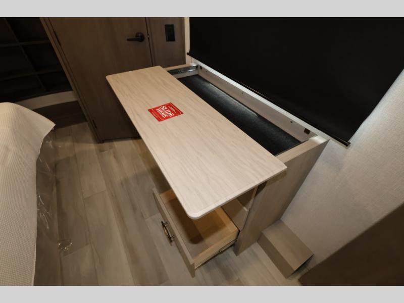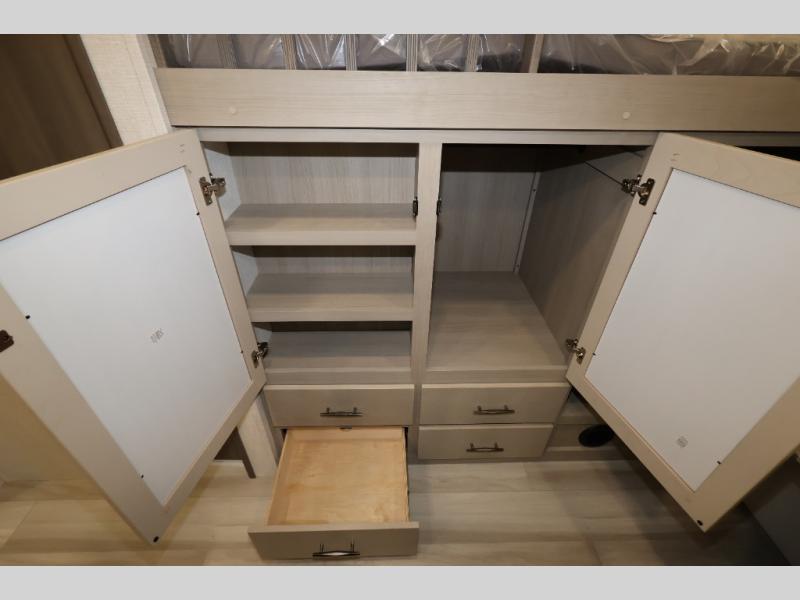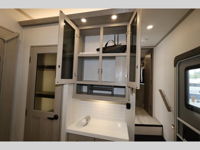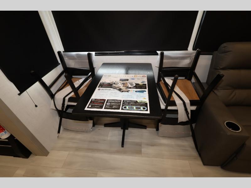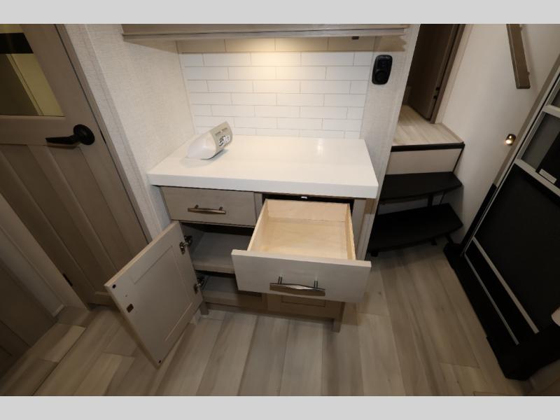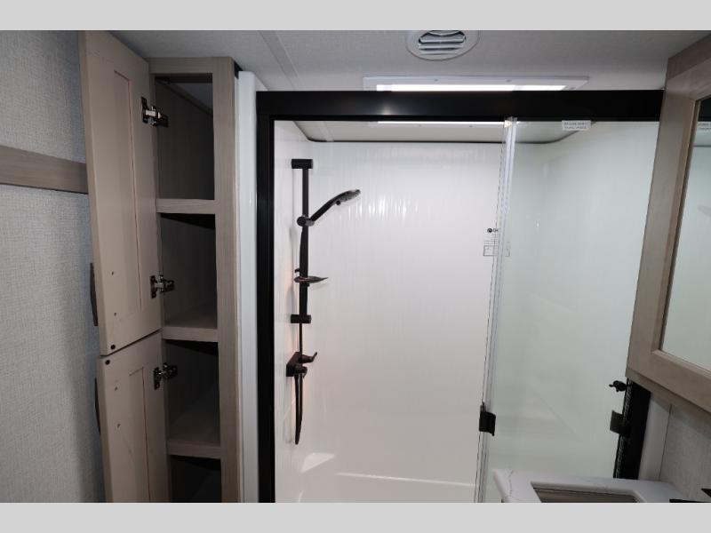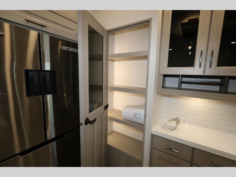 Grab the whole gang and head out in this fifth wheel featuring a private bunkhouse that sleeps five. This unit also features dual entry doors for added convenience with one set leading into a half bath, and quad slides for even more space in this widebody layout. The combined kitchen and living area featuring dual opposing slides offer space to dine and relax including theater seating for two opposite the entertainment center and fireplace. The chef in your group will appreciate the amenities for dreaming up dishes to feed everyone, and the outside griddle, sink and beverage cooler provides even more options. In front, a private bedroom and full bath with a queen bed or optional king, your choice. You can even add a washer and dryer with a space in front prepped for both if you like.