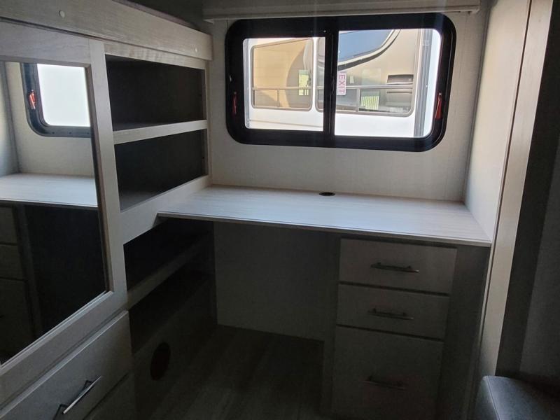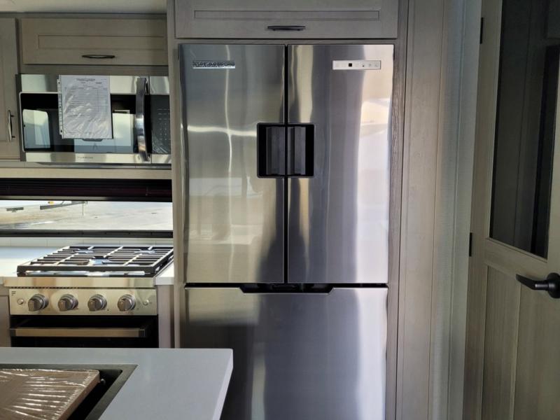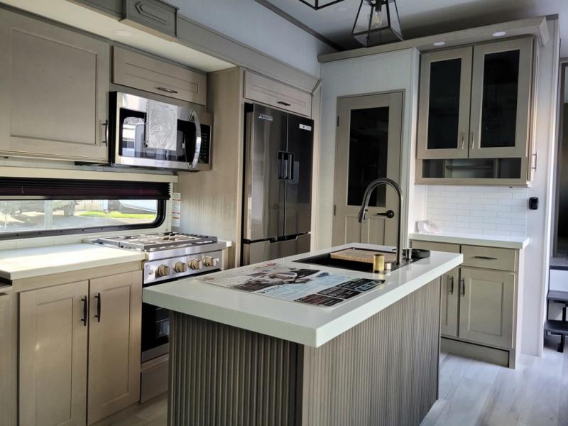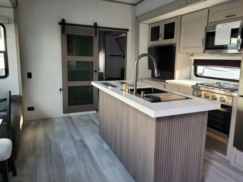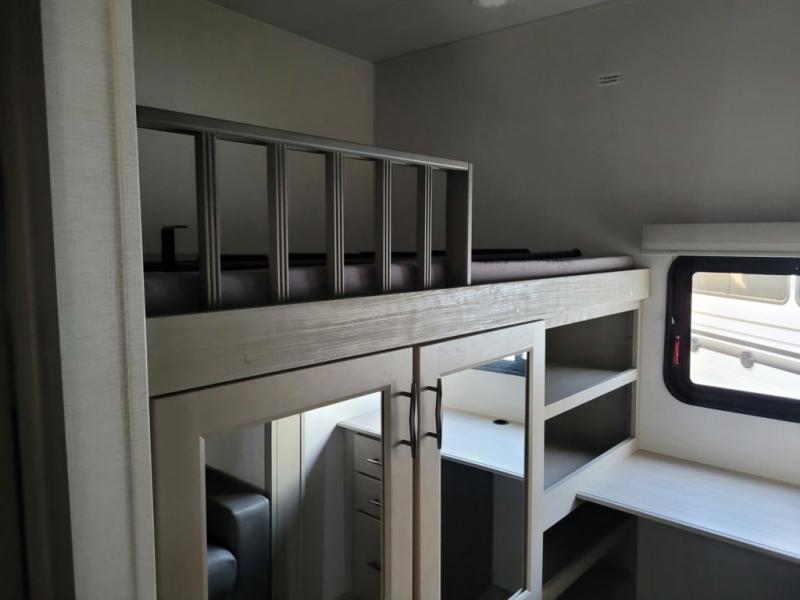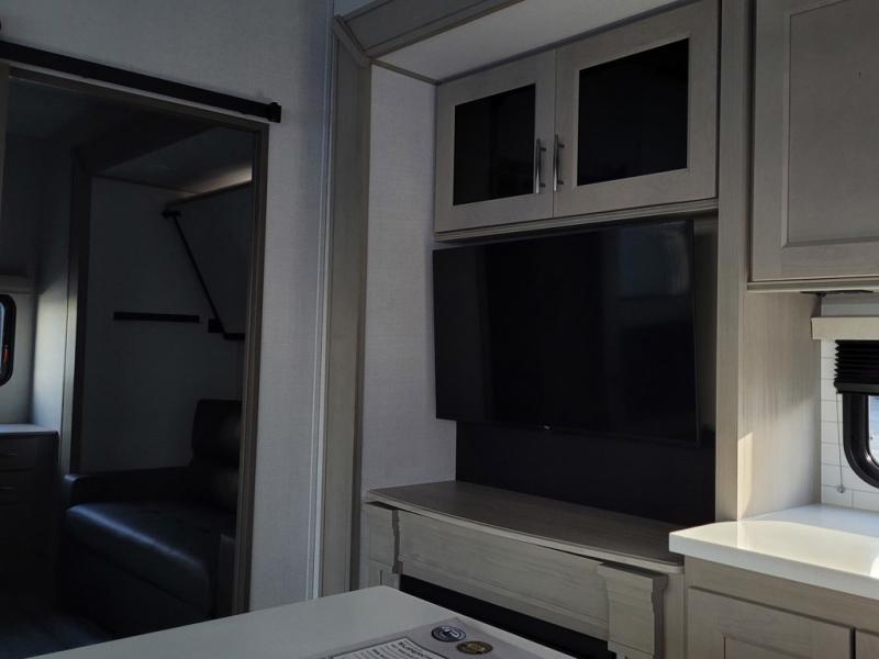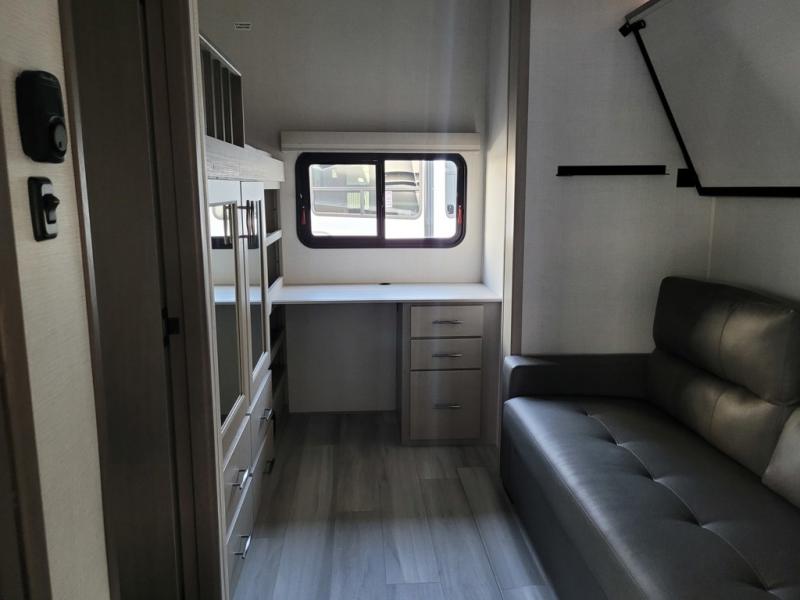 Grab the whole gang and head out in this fifth wheel featuring a private bunkhouse that sleeps five. This unit also features dual entry doors for added convenience with one set leading into a half bath, and quad slides for even more space in this widebody layout. The combined kitchen and living area featuring dual opposing slides offer space to dine and relax including theater seating for two opposite the entertainment center and fireplace. The chef in your group will appreciate the amenities for dreaming up dishes to feed everyone, and the outside griddle, sink and beverage cooler provides even more options. In front, a private bedroom and full bath with a queen bed or optional king, your choice. You can even add a washer and dryer with a space in front prepped for both if you like.
