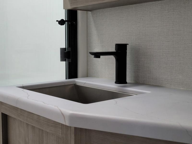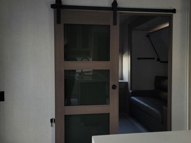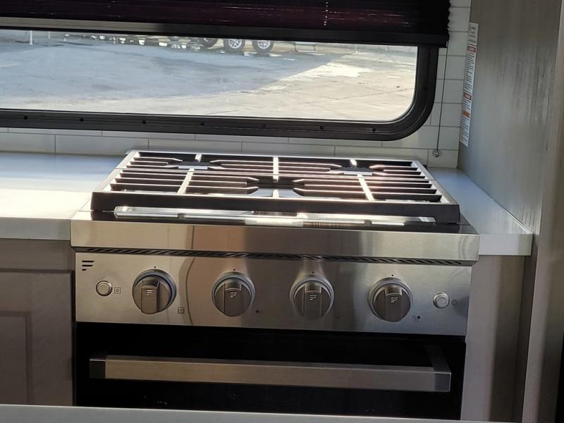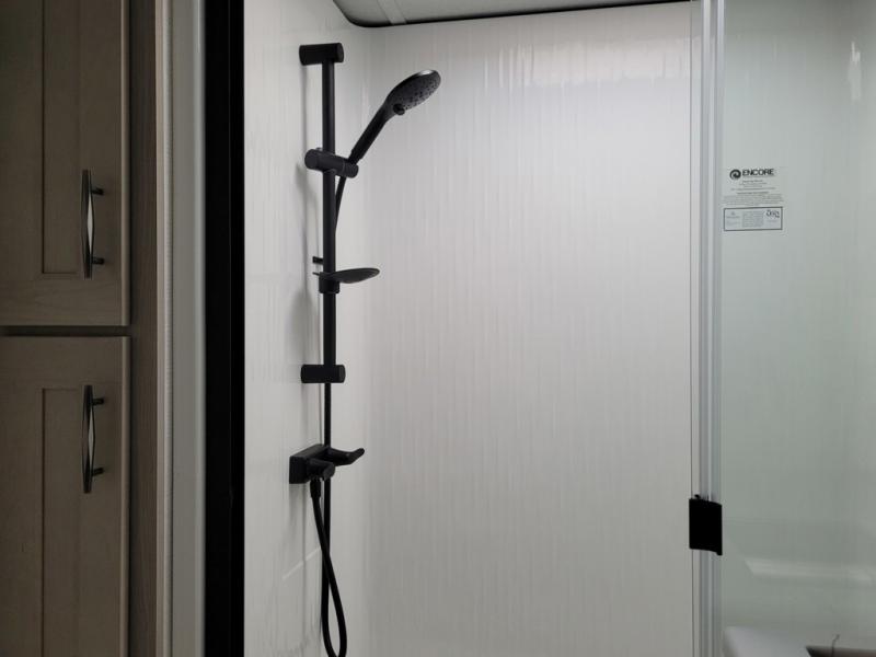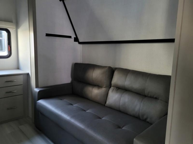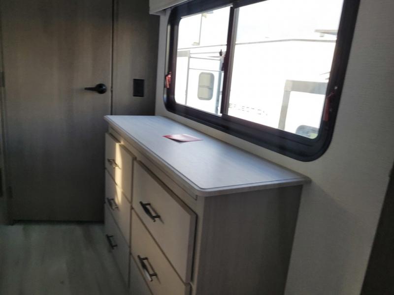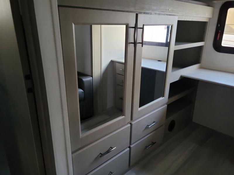 Grab the whole gang and head out in this fifth wheel featuring a private bunkhouse that sleeps five. This unit also features dual entry doors for added convenience with one set leading into a half bath, and quad slides for even more space in this widebody layout. The combined kitchen and living area featuring dual opposing slides offer space to dine and relax including theater seating for two opposite the entertainment center and fireplace. The chef in your group will appreciate the amenities for dreaming up dishes to feed everyone, and the outside griddle, sink and beverage cooler provides even more options. In front, a private bedroom and full bath with a queen bed or optional king, your choice. You can even add a washer and dryer with a space in front prepped for both if you like.