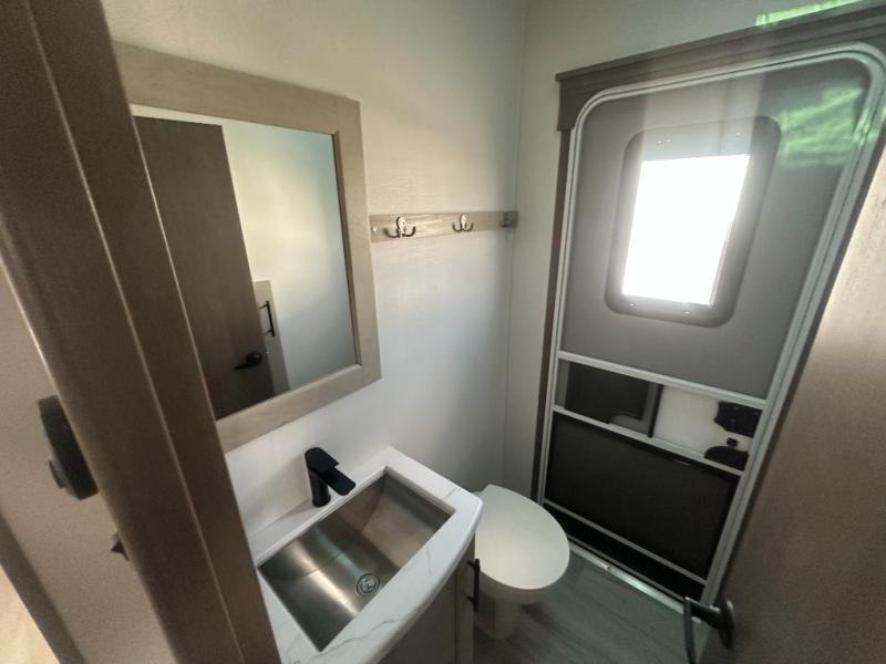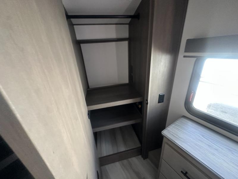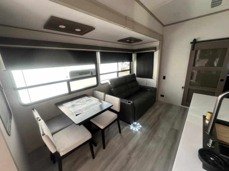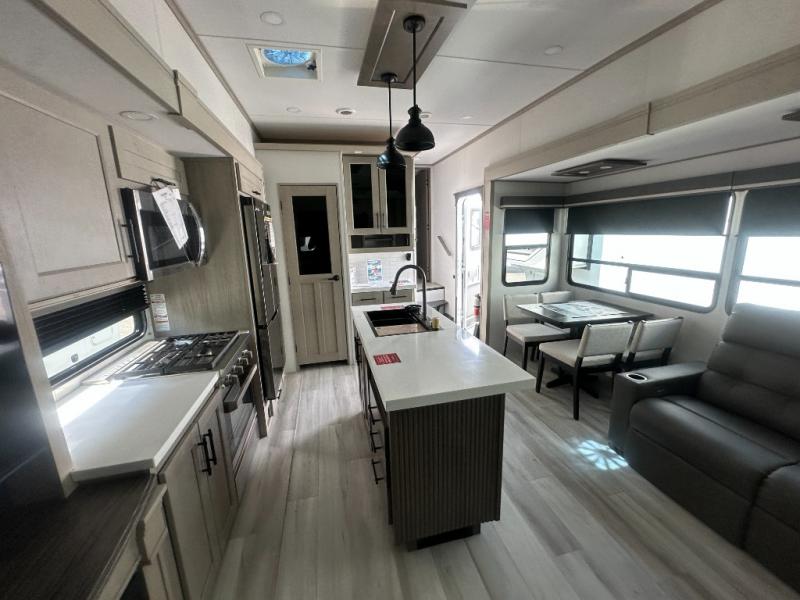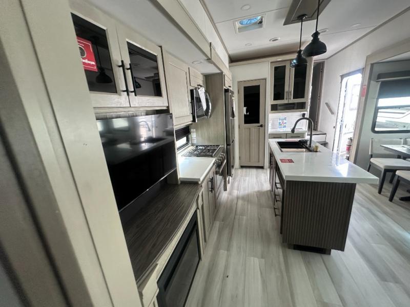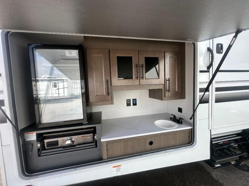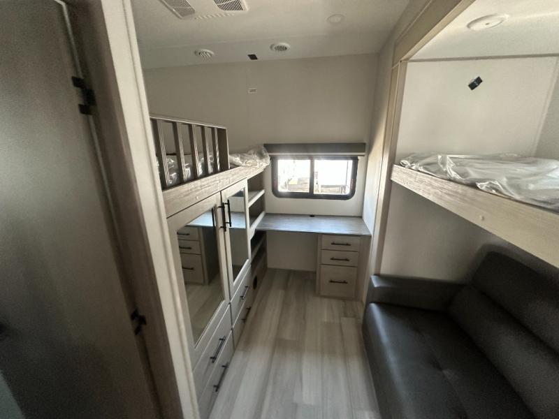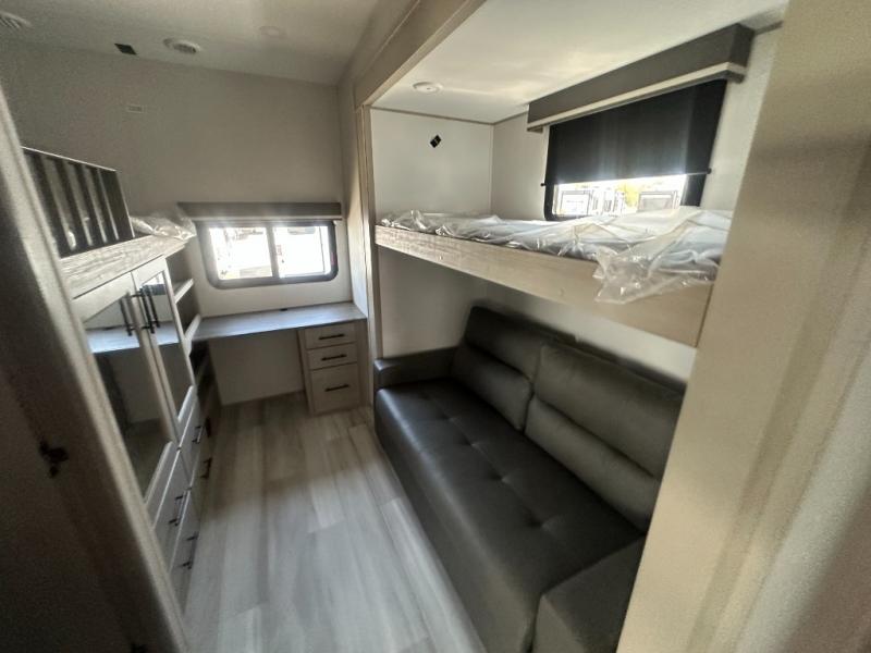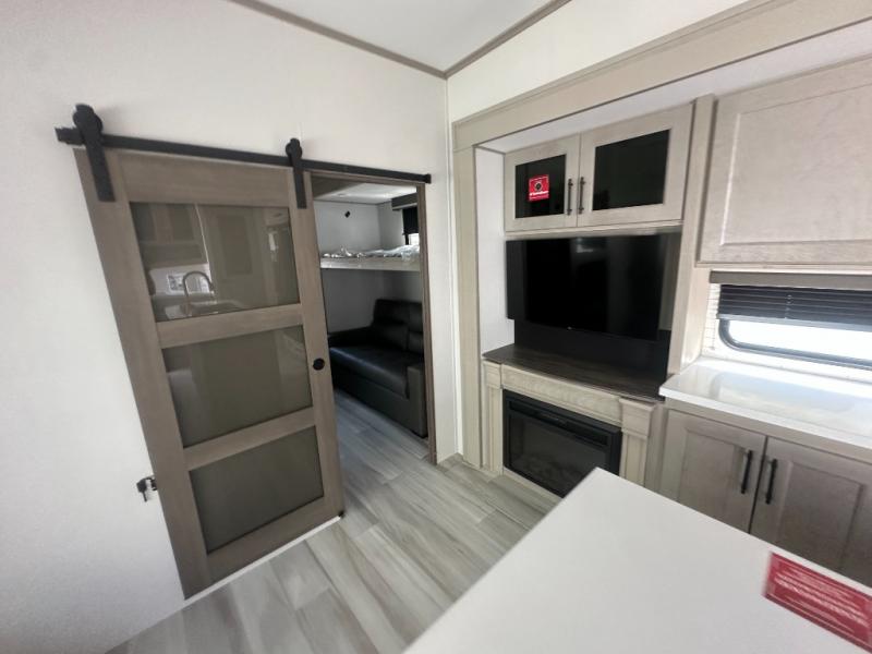 Grab the whole gang and head out in this fifth wheel featuring a private bunkhouse that sleeps five. This unit also features dual entry doors for added convenience with one set leading into a half bath, and quad slides for even more space in this widebody layout. The combined kitchen and living area featuring dual opposing slides offer space to dine and relax including theater seating for two opposite the entertainment center and fireplace. The chef in your group will appreciate the amenities for dreaming up dishes to feed everyone, and the outside griddle, sink and beverage cooler provides even more options. In front, a private bedroom and full bath with a queen bed or optional king, your choice. You can even add a washer and dryer with a space in front prepped for both if you like.
