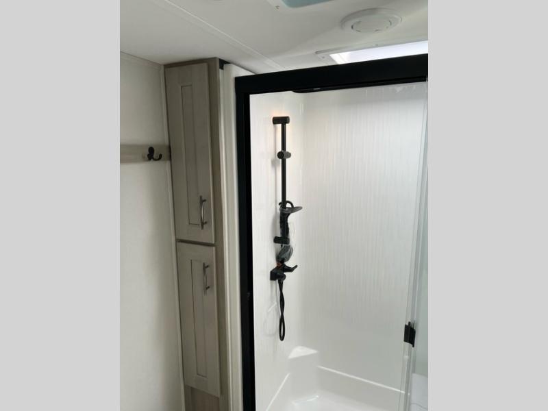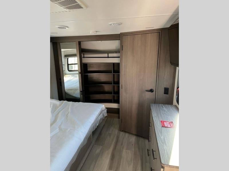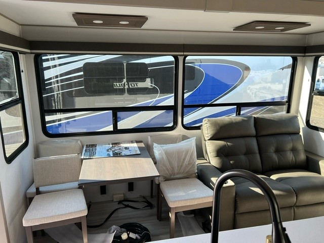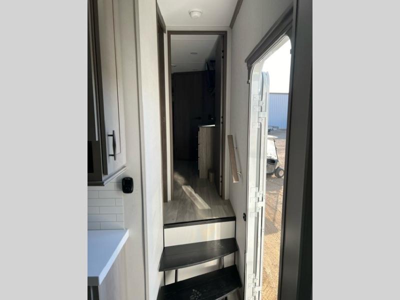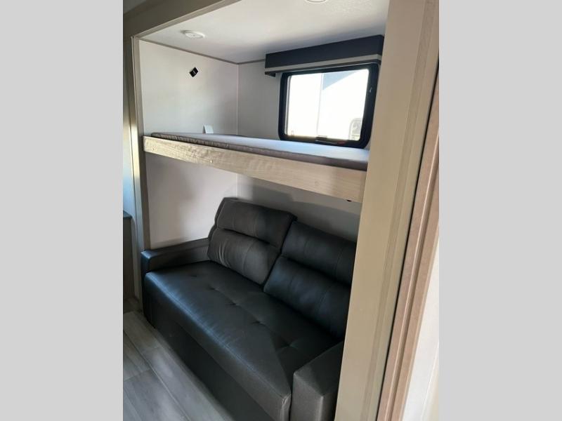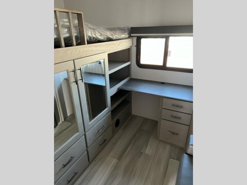 Grab the whole gang and head out in this fifth wheel featuring a private bunkhouse that sleeps five. This unit also features dual entry doors for added convenience with one set leading into a half bath, and quad slides for even more space in this widebody layout. The combined kitchen and living area featuring dual opposing slides offer space to dine and relax including theater seating for two opposite the entertainment center and fireplace. The chef in your group will appreciate the amenities for dreaming up dishes to feed everyone, and the outside griddle, sink and beverage cooler provides even more options. In front, a private bedroom and full bath with a queen bed or optional king, your choice. You can even add a washer and dryer with a space in front prepped for both if you like.