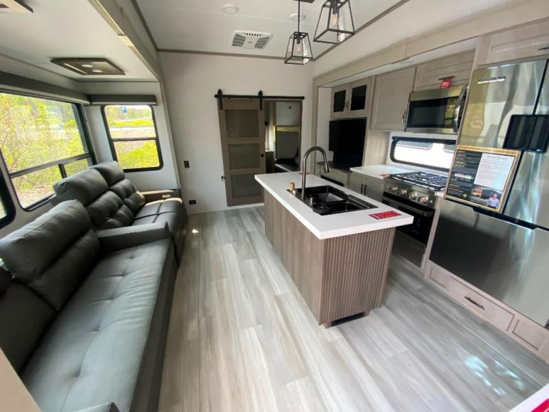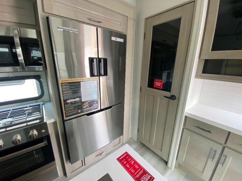 Any Grand Design Influence fifth wheel features five-sided aluminum cage construction with a walk-on roof and a fully enclosed underbelly with heated tanks and storage for all weather camping. For peace of mind, the MORryde CRE3000 Suspension system will provide safe and smooth towing, and the 101" widebody construction offers all the room you need and that is before multiple slides are fully engaged. You will appreciate the Keyed-Alike locks, slam-latch baggage doors with magnetic door catches, exterior security light, and SolidStep entry steps. On the inside, Congoleum flooring, premium roller shades for privacy, a hallway handrail for safety, and nightstands with USB ports to keep all of your electronics fully charged. You will also love the On Demand tankless water heater when showering, plus the added heat and ambiance from an electric fireplace, and so much more!