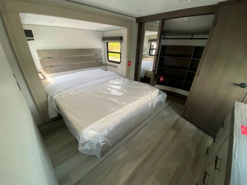 Grab the whole gang and head out in this fifth wheel featuring a private bunkhouse that sleeps five. This unit also features dual entry doors for added convenience with one set leading into a half bath, and quad slides for even more space in this widebody layout. The combined kitchen and living area featuring dual opposing slides offer space to dine and relax including theater seating for two opposite the entertainment center and fireplace. The chef in your group will appreciate the amenities for dreaming up dishes to feed everyone, and the outside griddle, sink and beverage cooler provides even more options. In front, a private bedroom and full bath with a queen bed or optional king, your choice. You can even add a washer and dryer with a space in front prepped for both if you like.