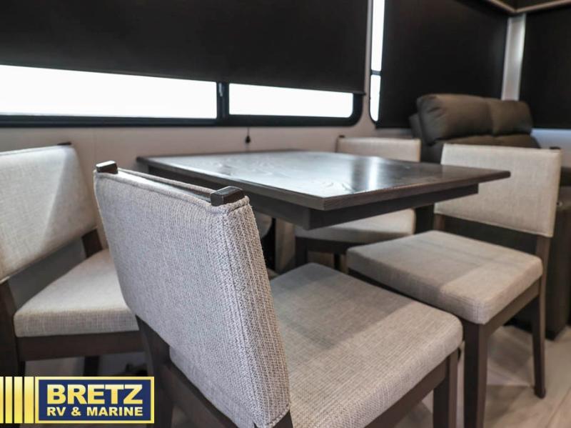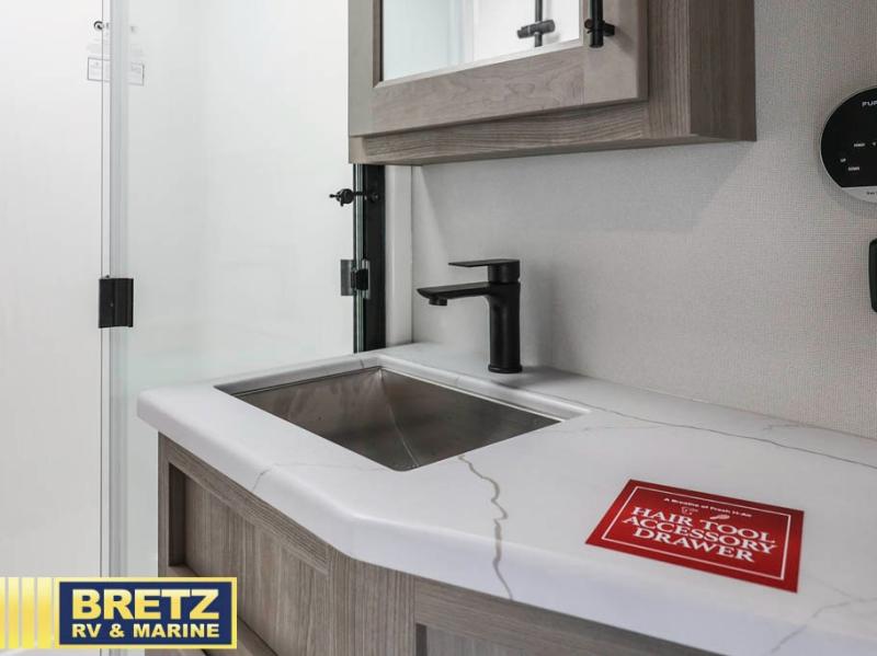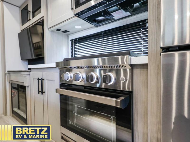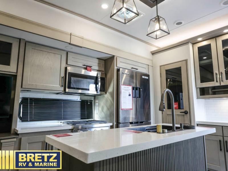 Grab the whole gang and head out in this fifth wheel featuring a private bunkhouse that sleeps five. This unit also features dual entry doors for added convenience with one set leading into a half bath, and quad slides for even more space in this widebody layout. The combined kitchen and living area featuring dual opposing slides offer space to dine and relax including theater seating for two opposite the entertainment center and fireplace. The chef in your group will appreciate the amenities for dreaming up dishes to feed everyone, and the outside griddle, sink and beverage cooler provides even more options. In front, a private bedroom and full bath with a queen bed or optional king, your choice. You can even add a washer and dryer with a space in front prepped for both if you like.