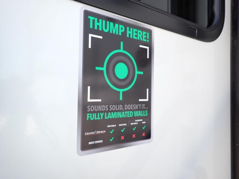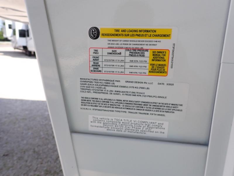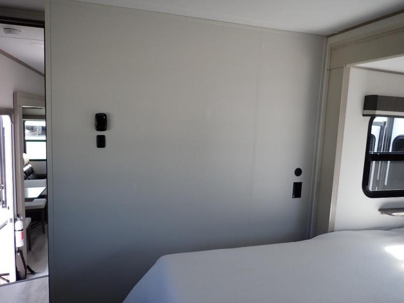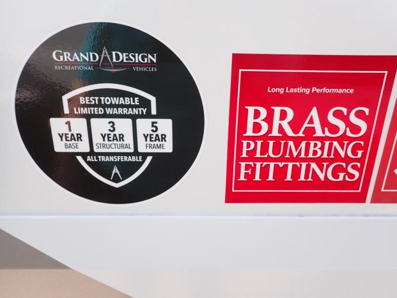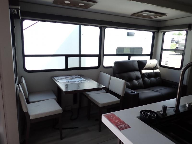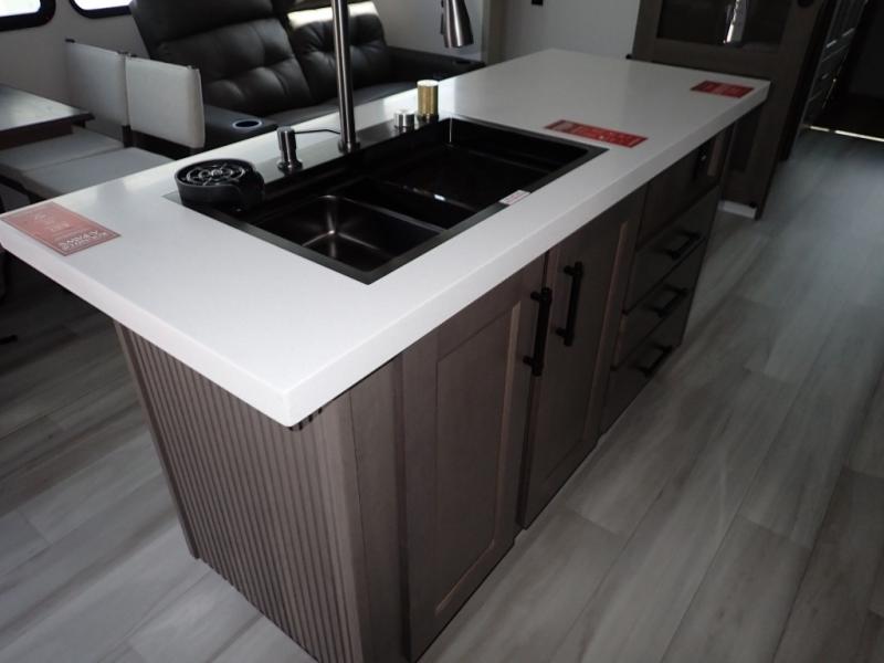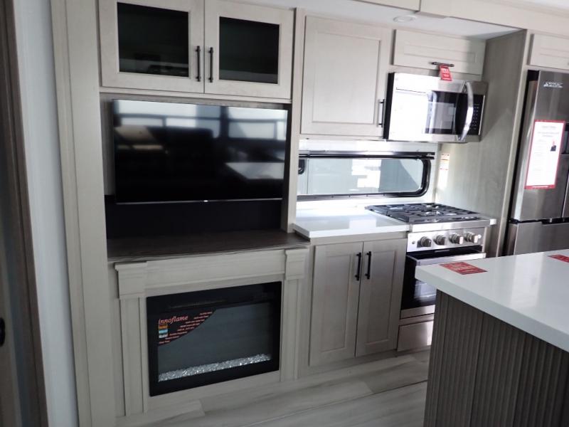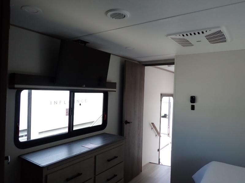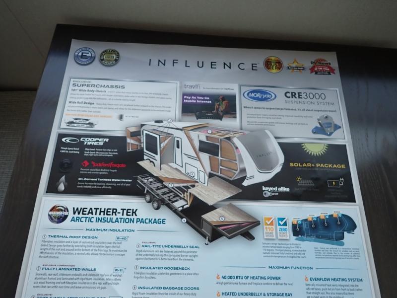 Any Grand Design Influence fifth wheel features five-sided aluminum cage construction with a walk-on roof and a fully enclosed underbelly with heated tanks and storage for all weather camping. For peace of mind, the MORryde CRE3000 Suspension system will provide safe and smooth towing, and the 101" widebody construction offers all the room you need and that is before multiple slides are fully engaged. You will appreciate the Keyed-Alike locks, slam-latch baggage doors with magnetic door catches, exterior security light, and SolidStep entry steps. On the inside, Congoleum flooring, premium roller shades for privacy, a hallway handrail for safety, and nightstands with USB ports to keep all of your electronics fully charged. You will also love the On Demand tankless water heater when showering, plus the added heat and ambiance from an electric fireplace, and so much more!