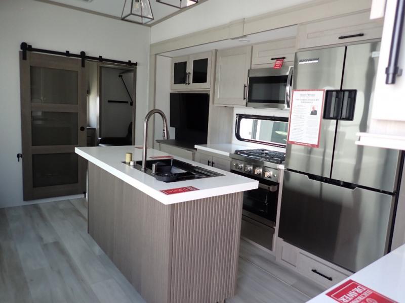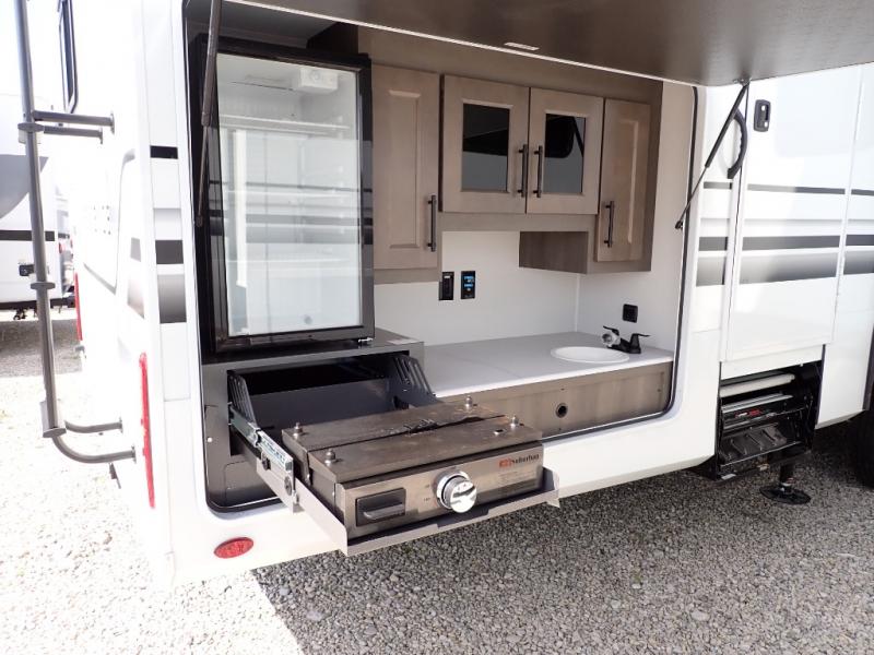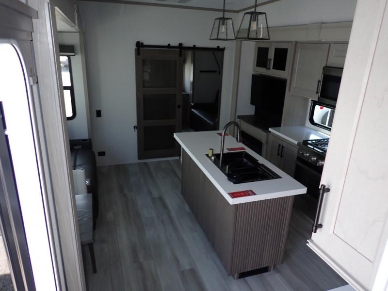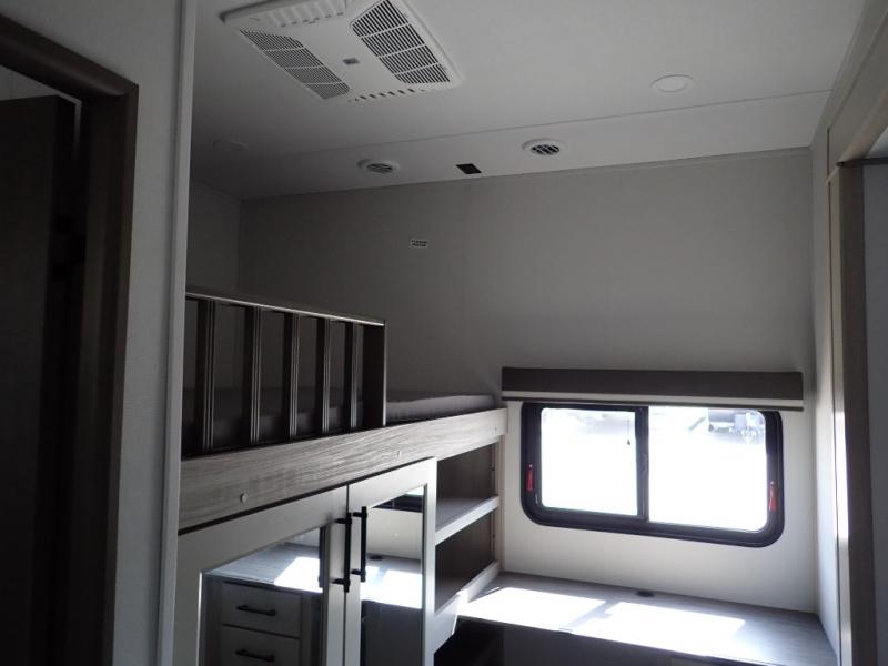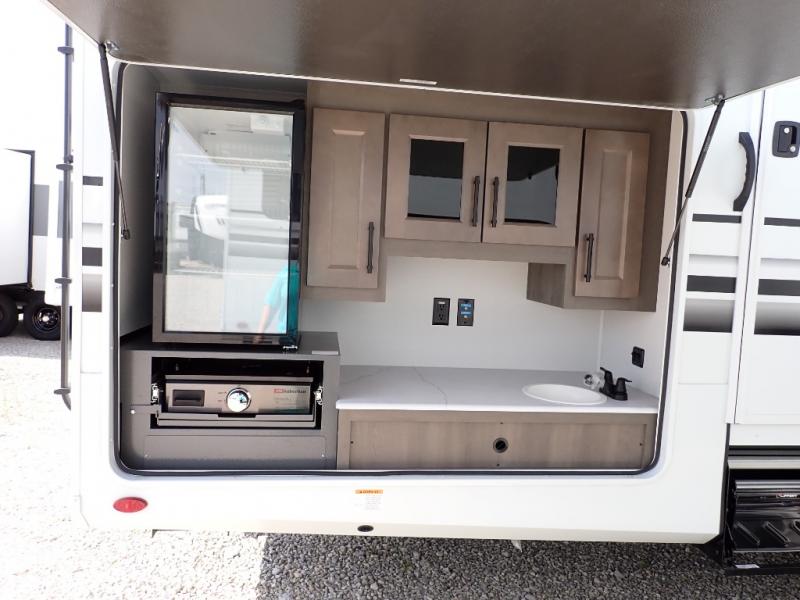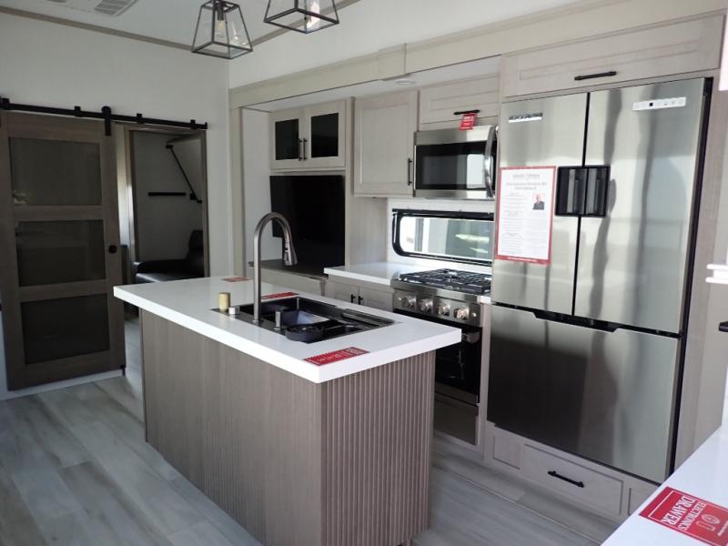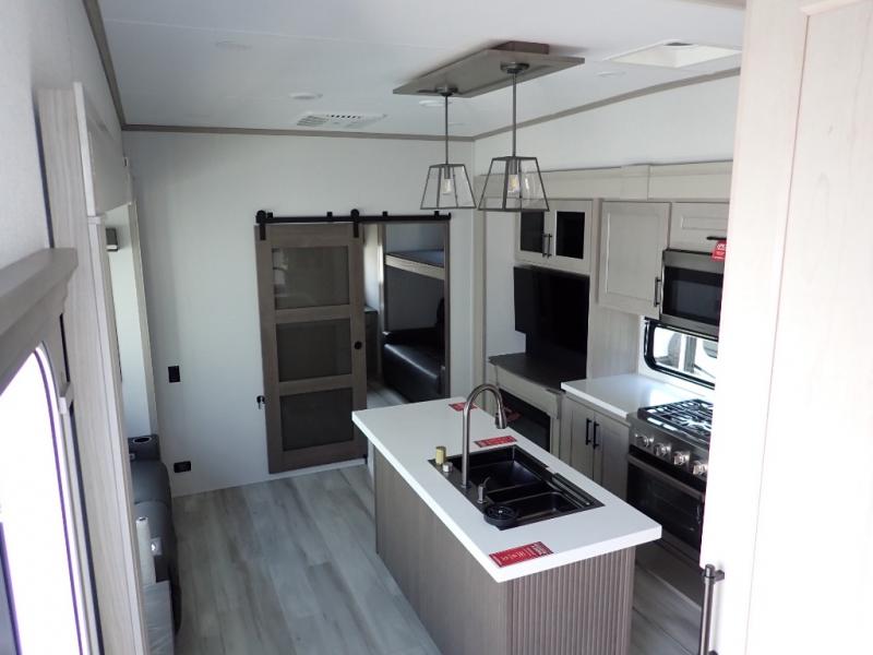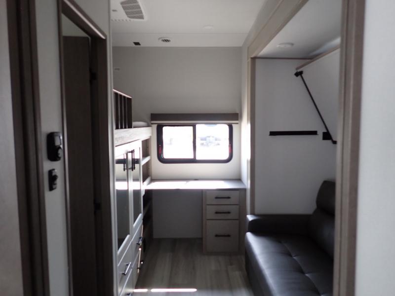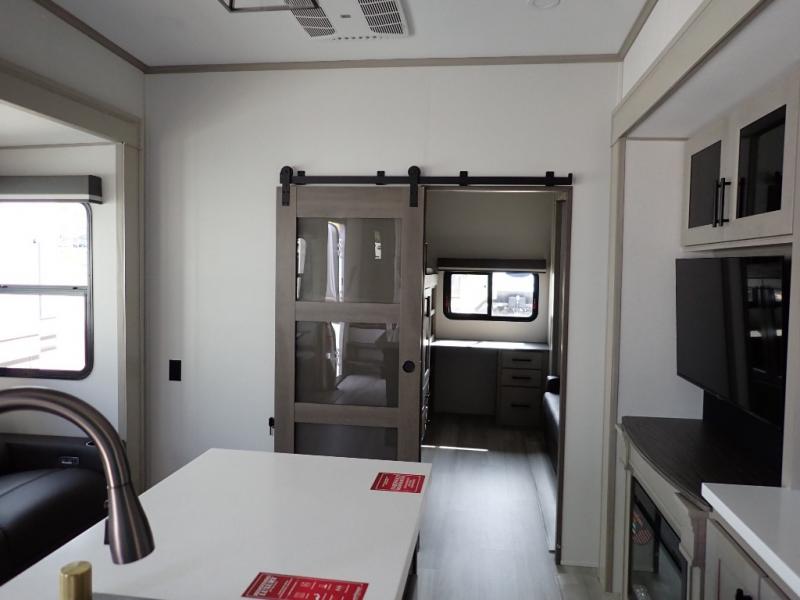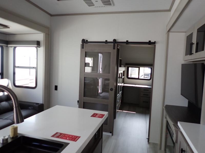 Grab the whole gang and head out in this fifth wheel featuring a private bunkhouse that sleeps five. This unit also features dual entry doors for added convenience with one set leading into a half bath, and quad slides for even more space in this widebody layout. The combined kitchen and living area featuring dual opposing slides offer space to dine and relax including theater seating for two opposite the entertainment center and fireplace. The chef in your group will appreciate the amenities for dreaming up dishes to feed everyone, and the outside griddle, sink and beverage cooler provides even more options. In front, a private bedroom and full bath with a queen bed or optional king, your choice. You can even add a washer and dryer with a space in front prepped for both if you like.
