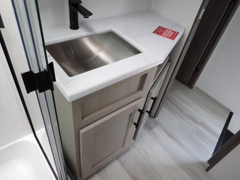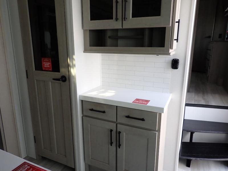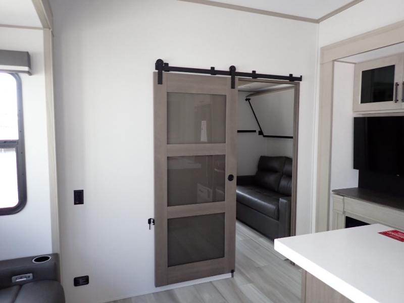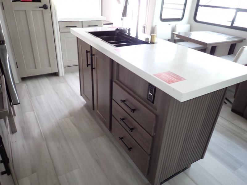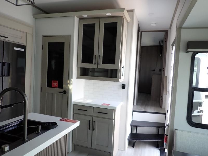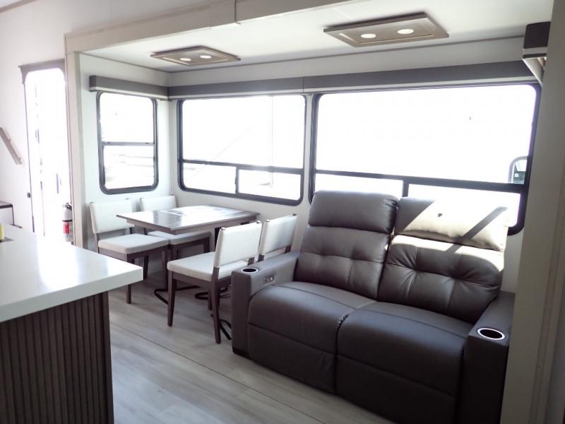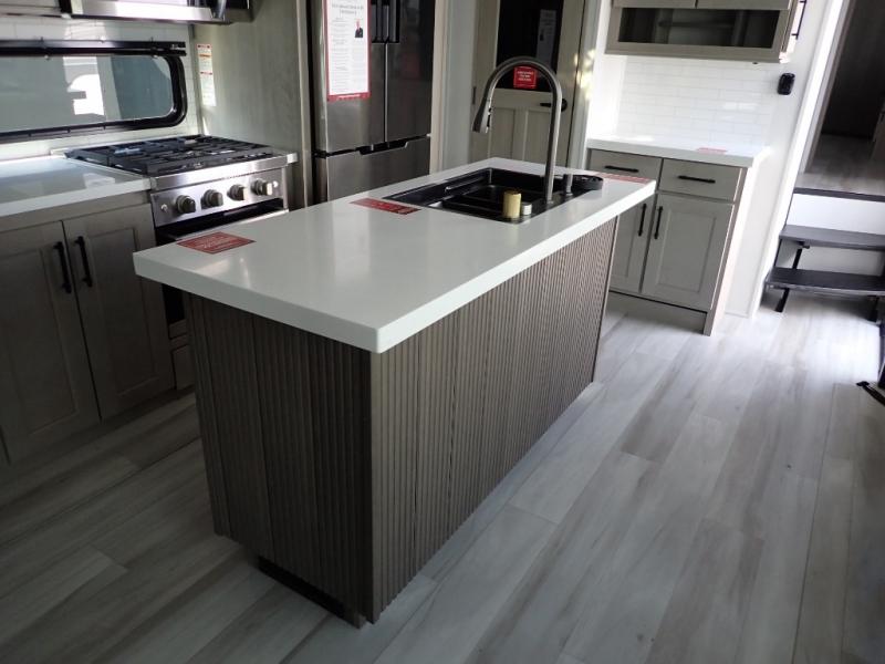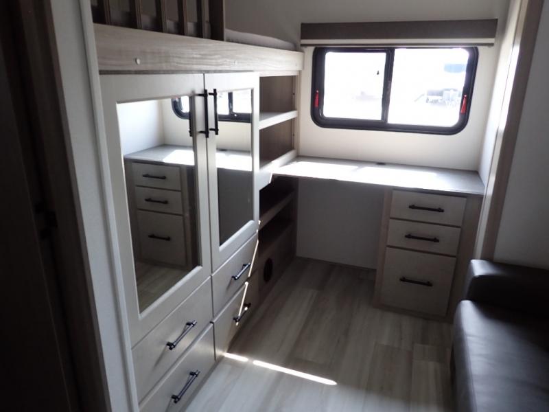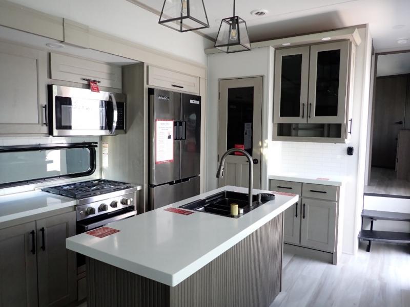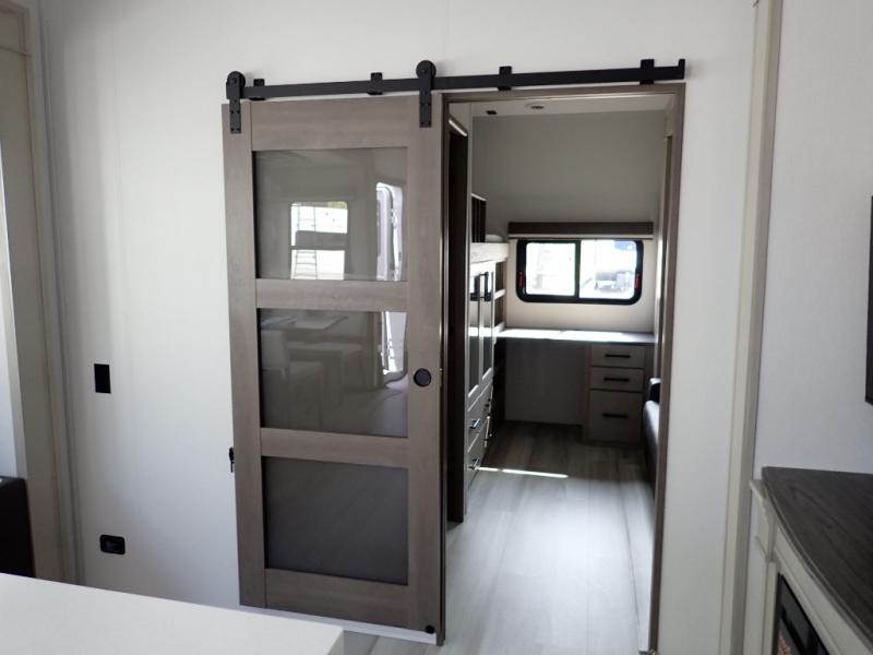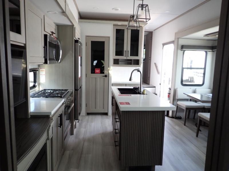 Grab the whole gang and head out in this fifth wheel featuring a private bunkhouse that sleeps five. This unit also features dual entry doors for added convenience with one set leading into a half bath, and quad slides for even more space in this widebody layout. The combined kitchen and living area featuring dual opposing slides offer space to dine and relax including theater seating for two opposite the entertainment center and fireplace. The chef in your group will appreciate the amenities for dreaming up dishes to feed everyone, and the outside griddle, sink and beverage cooler provides even more options. In front, a private bedroom and full bath with a queen bed or optional king, your choice. You can even add a washer and dryer with a space in front prepped for both if you like.