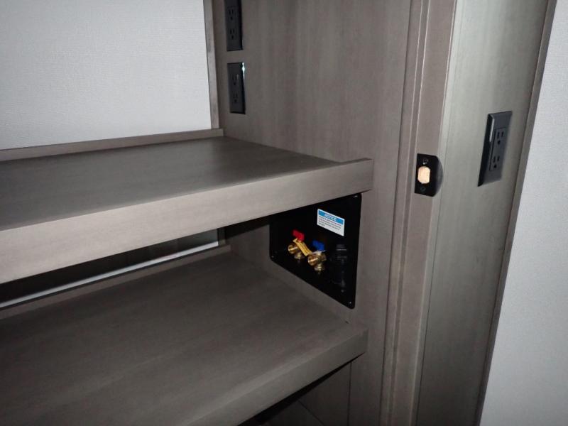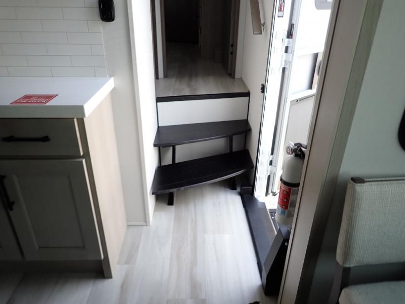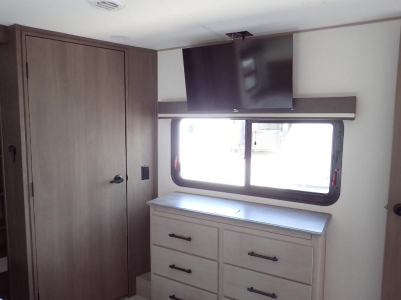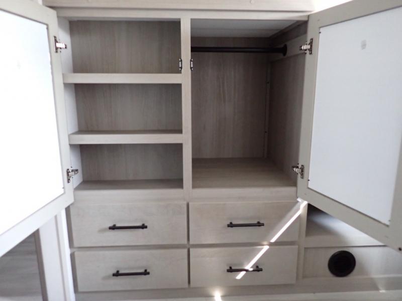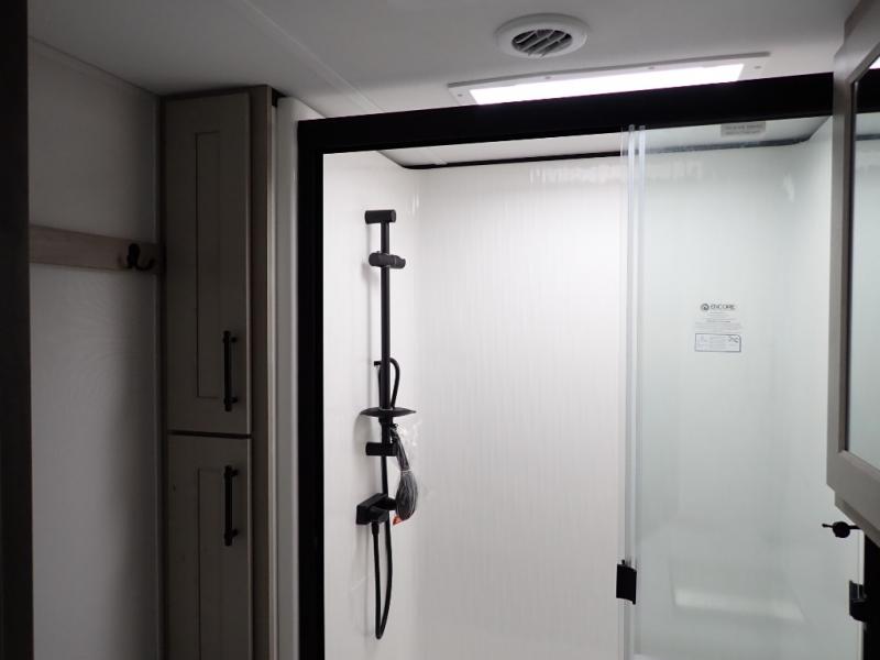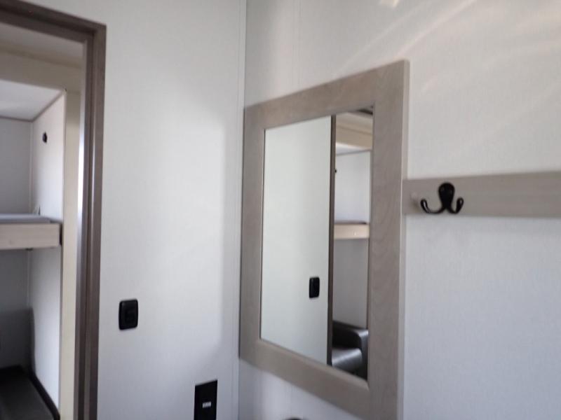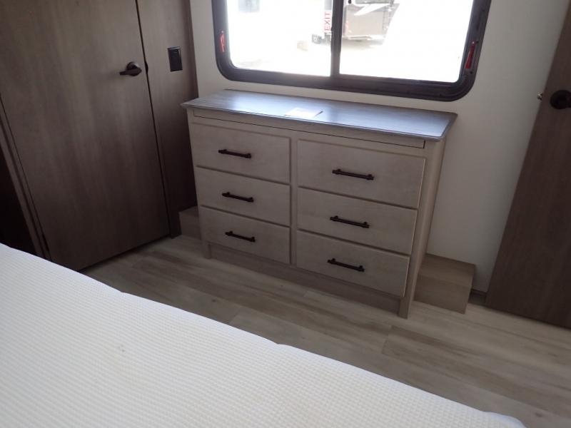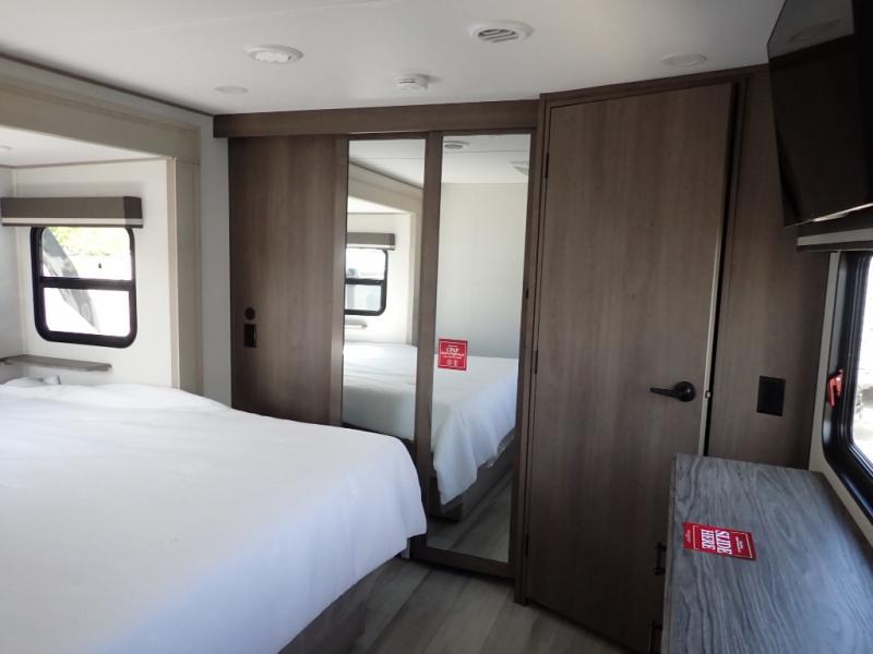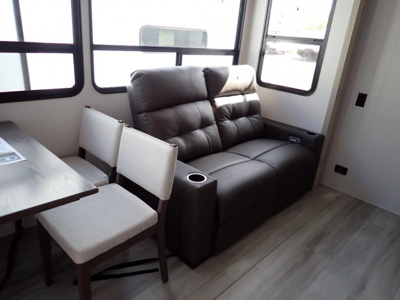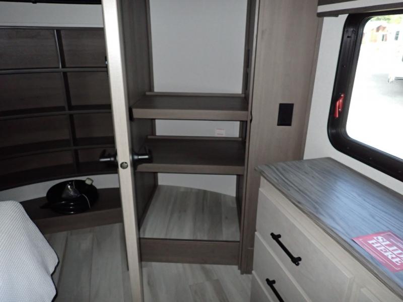 Grab the whole gang and head out in this fifth wheel featuring a private bunkhouse that sleeps five. This unit also features dual entry doors for added convenience with one set leading into a half bath, and quad slides for even more space in this widebody layout. The combined kitchen and living area featuring dual opposing slides offer space to dine and relax including theater seating for two opposite the entertainment center and fireplace. The chef in your group will appreciate the amenities for dreaming up dishes to feed everyone, and the outside griddle, sink and beverage cooler provides even more options. In front, a private bedroom and full bath with a queen bed or optional king, your choice. You can even add a washer and dryer with a space in front prepped for both if you like.