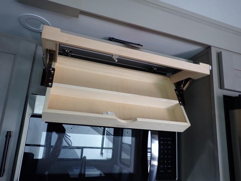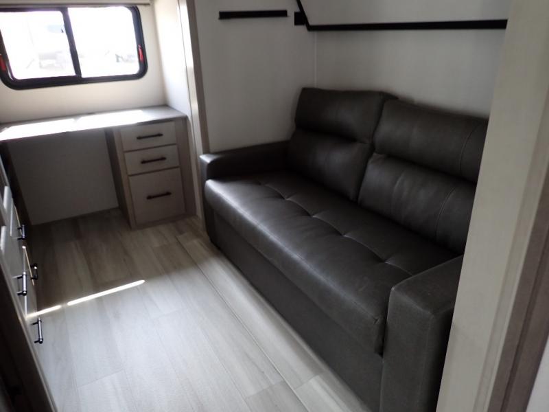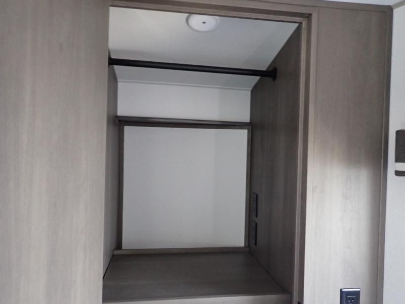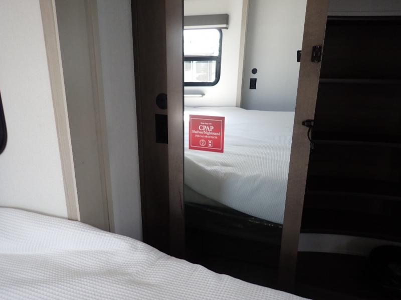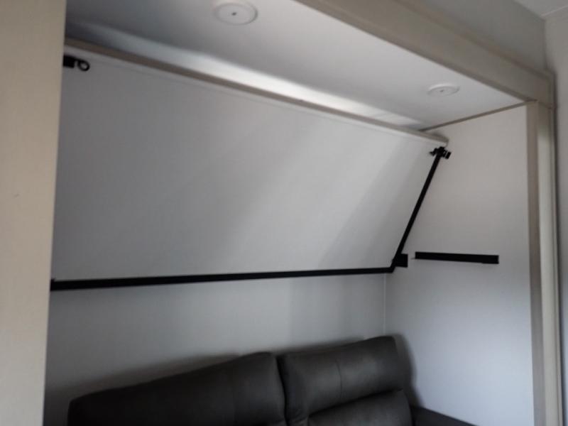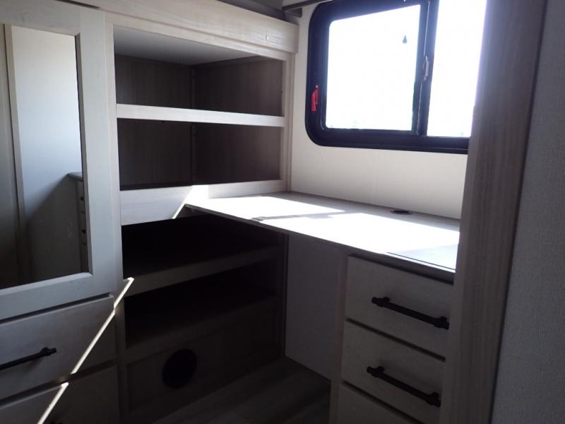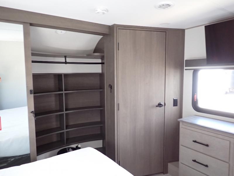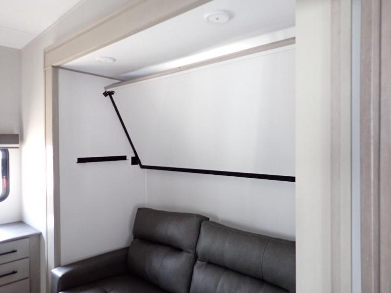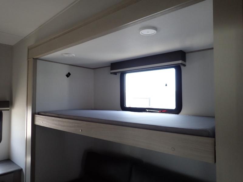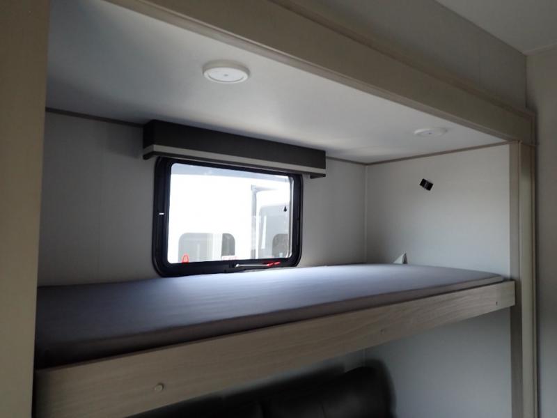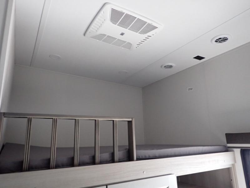 Grab the whole gang and head out in this fifth wheel featuring a private bunkhouse that sleeps five. This unit also features dual entry doors for added convenience with one set leading into a half bath, and quad slides for even more space in this widebody layout. The combined kitchen and living area featuring dual opposing slides offer space to dine and relax including theater seating for two opposite the entertainment center and fireplace. The chef in your group will appreciate the amenities for dreaming up dishes to feed everyone, and the outside griddle, sink and beverage cooler provides even more options. In front, a private bedroom and full bath with a queen bed or optional king, your choice. You can even add a washer and dryer with a space in front prepped for both if you like.