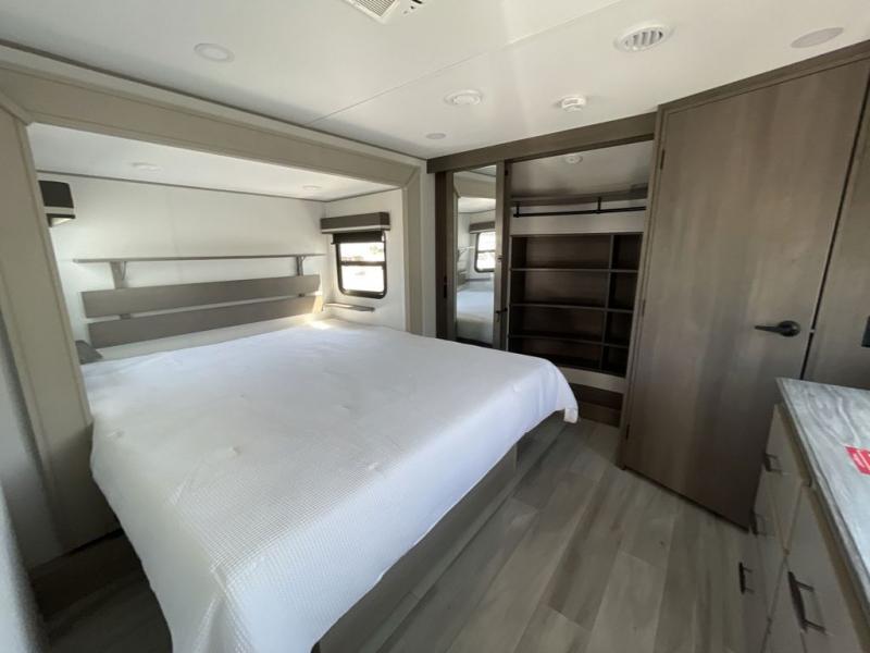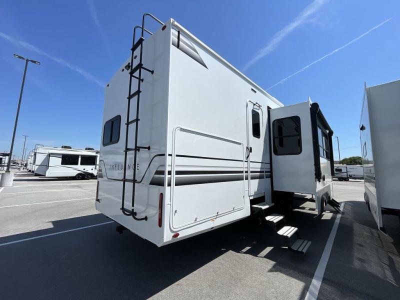 Any Grand Design Influence fifth wheel features five-sided aluminum cage construction with a walk-on roof and a fully enclosed underbelly with heated tanks and storage for all weather camping. For peace of mind, the MORryde CRE3000 Suspension system will provide safe and smooth towing, and the 101" widebody construction offers all the room you need and that is before multiple slides are fully engaged. You will appreciate the Keyed-Alike locks, slam-latch baggage doors with magnetic door catches, exterior security light, and SolidStep entry steps. On the inside, Congoleum flooring, premium roller shades for privacy, a hallway handrail for safety, and nightstands with USB ports to keep all of your electronics fully charged. You will also love the On Demand tankless water heater when showering, plus the added heat and ambiance from an electric fireplace, and so much more!