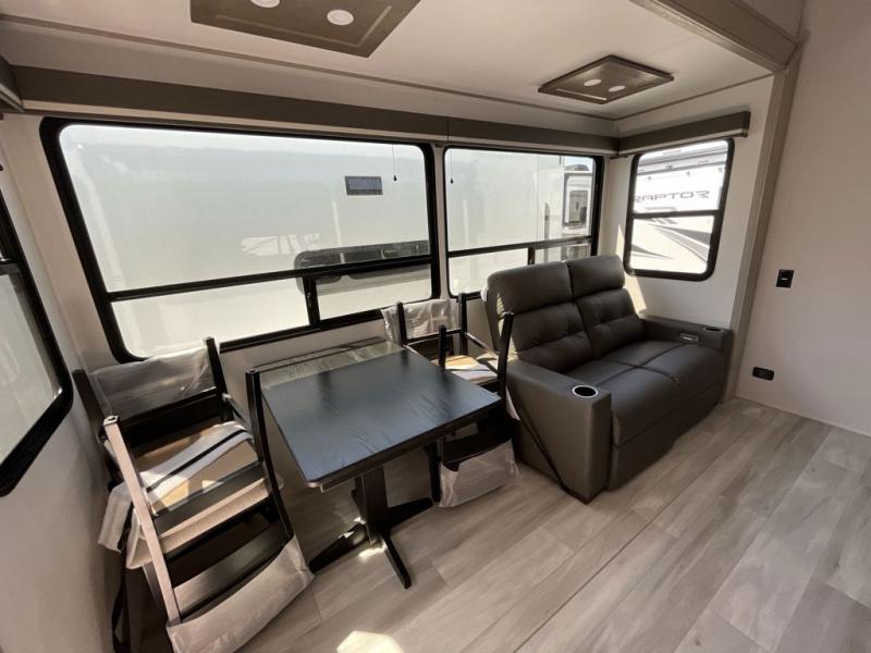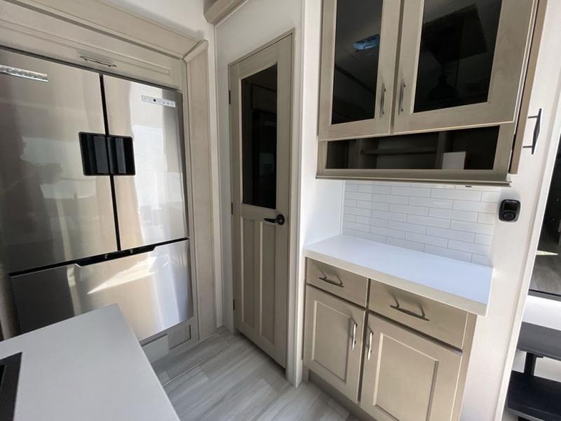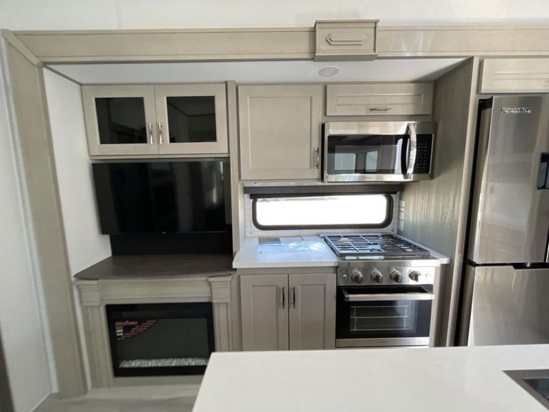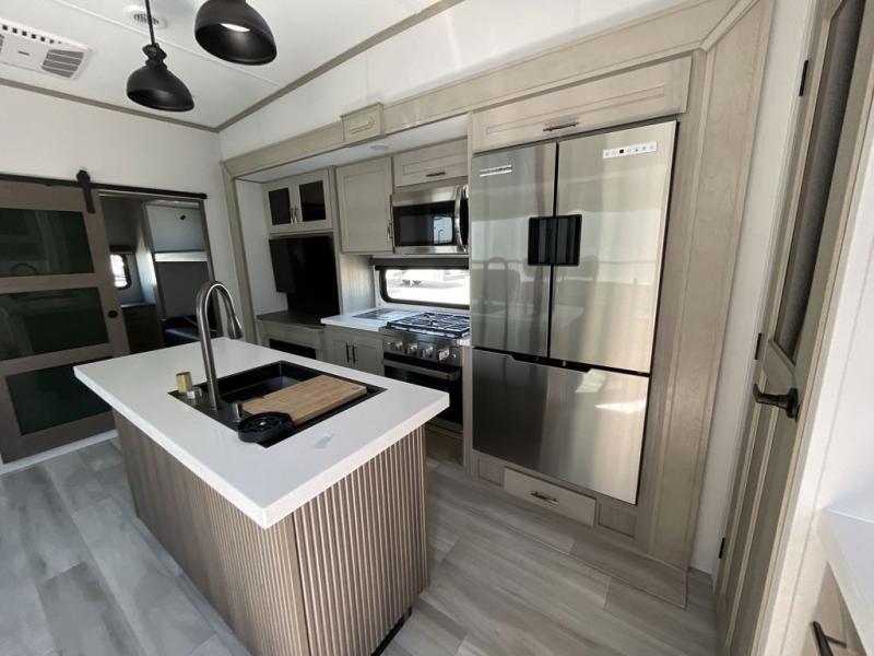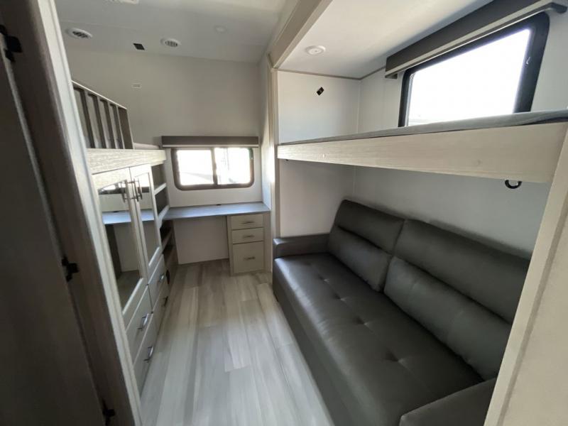 Grab the whole gang and head out in this fifth wheel featuring a private bunkhouse that sleeps five. This unit also features dual entry doors for added convenience with one set leading into a half bath, and quad slides for even more space in this widebody layout. The combined kitchen and living area featuring dual opposing slides offer space to dine and relax including theater seating for two opposite the entertainment center and fireplace. The chef in your group will appreciate the amenities for dreaming up dishes to feed everyone, and the outside griddle, sink and beverage cooler provides even more options. In front, a private bedroom and full bath with a queen bed or optional king bed, your choice. You can even add a washer and dryer with a space in front prepped for both if you like.