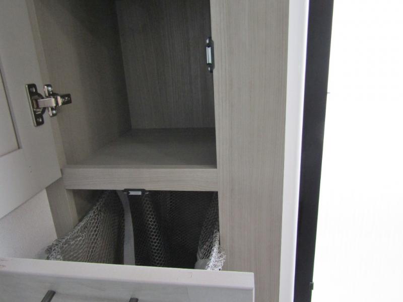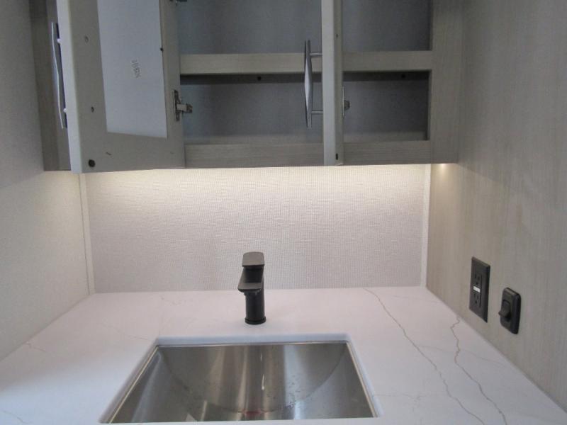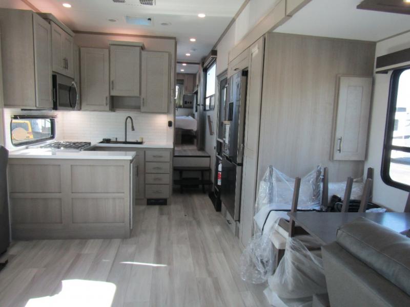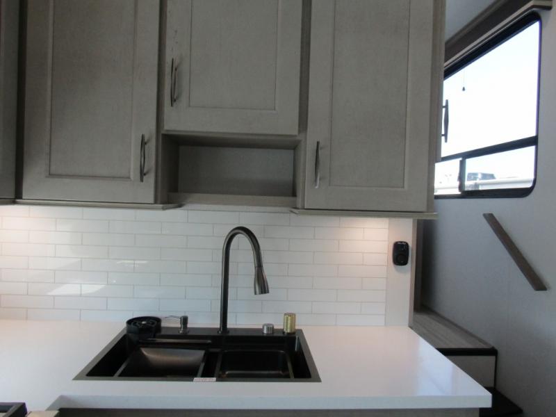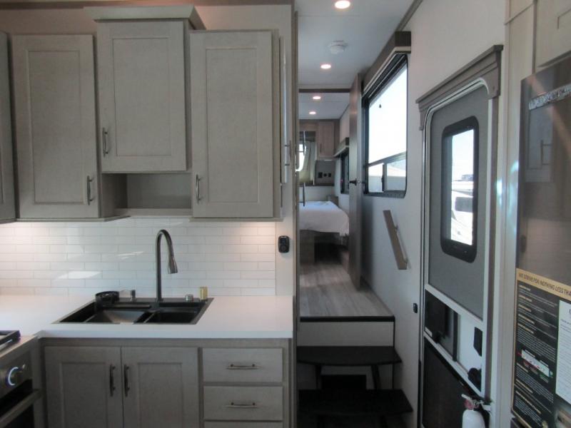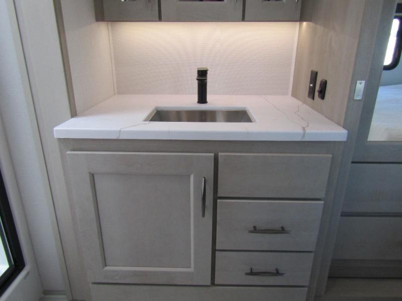 The living area is perfect for relaxing and entertaining. An L-shaped reclining sofa faces an electric fireplace and entertainment center. The free-standing dinette and gourmet kitchen make meal prep and dining easy. The kitchen includes a 16 cu. ft. 12V refrigerator with inverter prep and 330W solar panel, solid countertops, and a pull-out pet dish. Options like the Influence Residential Living Package, Elite Kitchen Package, and dual patio awnings elevate comfort indoors and out. Triple 15K BTU A/C units with heat pump, 12V tank heaters, Weather-Tek protection, and 4-season insulation ensure you stay comfortable year-round.