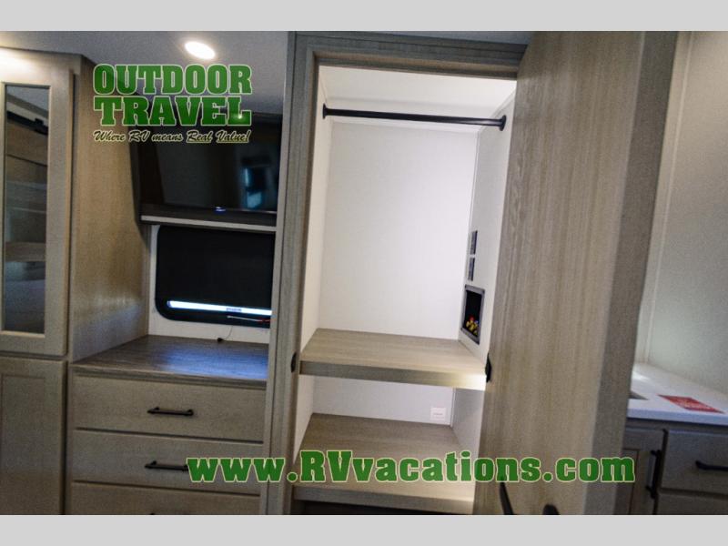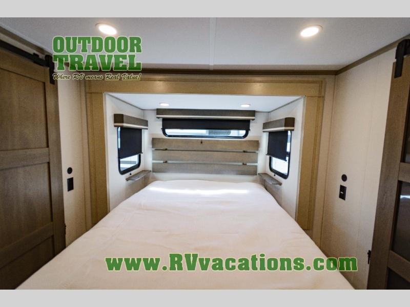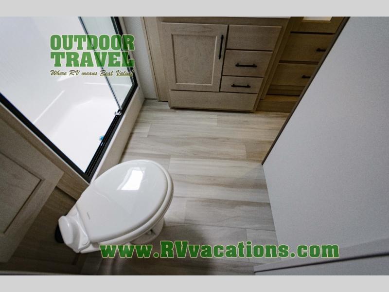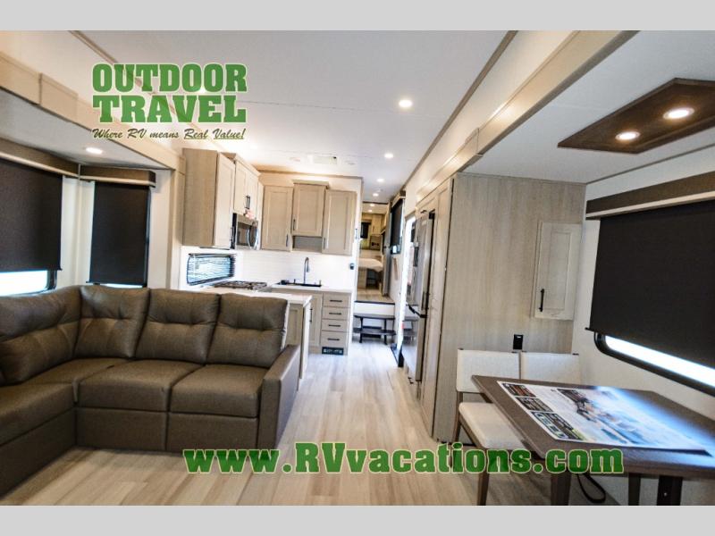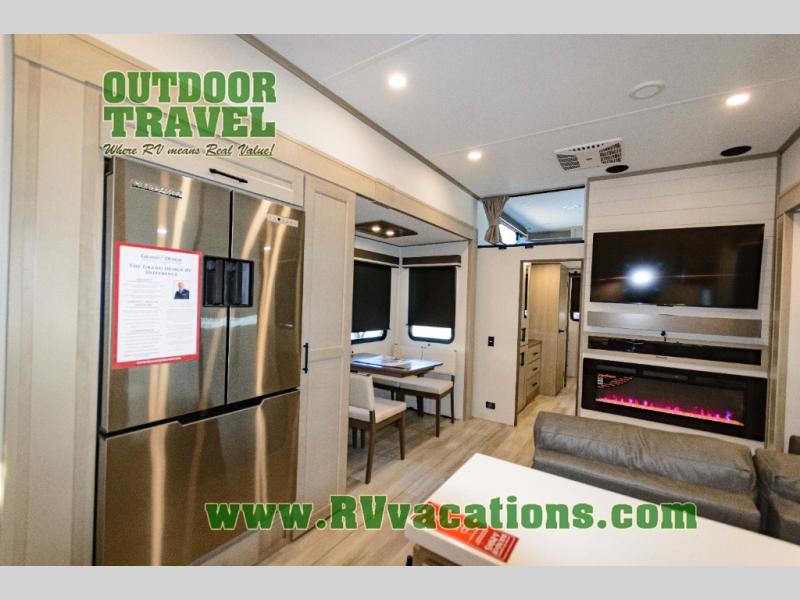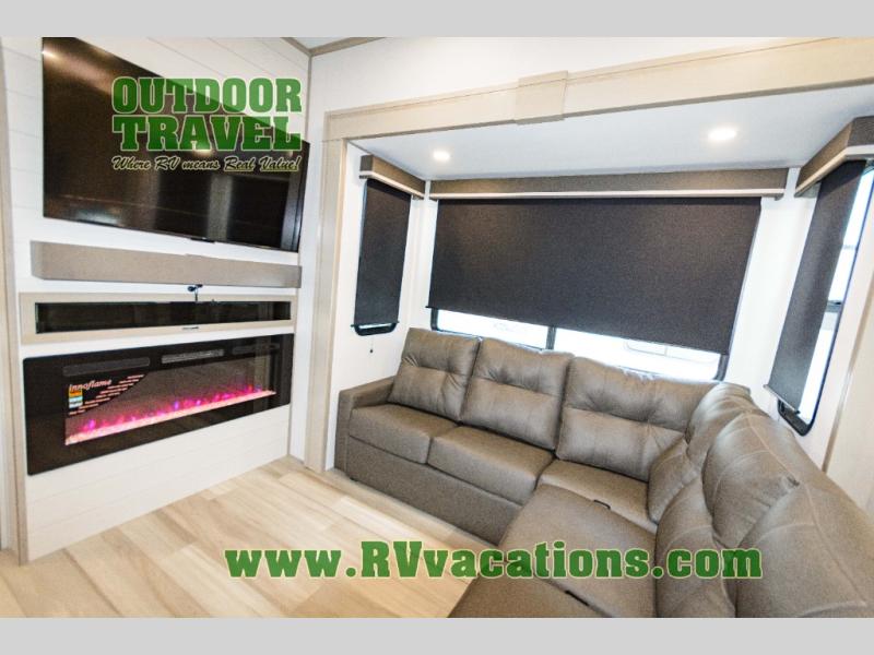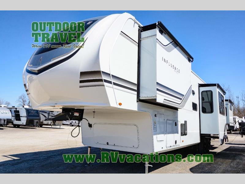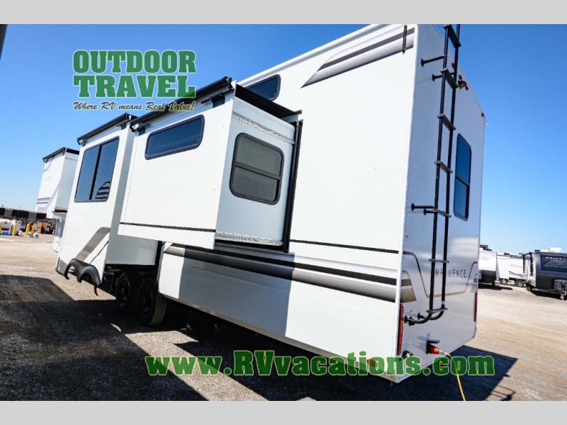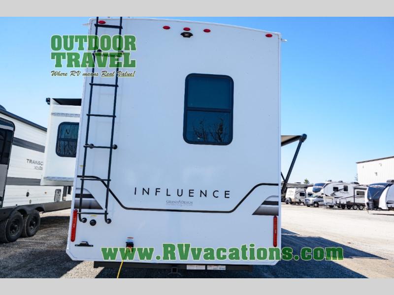 Any Grand Design Influence fifth wheel features five-sided aluminum cage construction with a walk-on roof and a fully enclosed underbelly with heated tanks and storage for all weather camping. For peace of mind, the MORryde CRE3000 Suspension system will provide safe and smooth towing, and the 101" widebody construction offers all the room you need and that is before multiple slides are fully engaged. You will appreciate the Keyed-Alike locks, slam-latch baggage doors with magnetic door catches, exterior security light, and SolidStep entry steps. On the inside, Congoleum flooring, premium roller shades for privacy, a hallway handrail for safety, and nightstands with USB ports to keep all of your electronics fully charged. You will also love the On Demand tankless water heater when showering, plus the added heat and ambiance from an electric fireplace, and so much more!