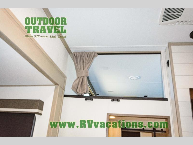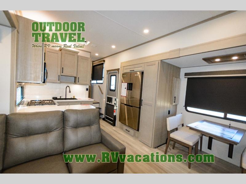 Grab the whole gang and head out in this fifth wheel featuring two private bedrooms, two full baths, and quad slides for even more space in this widebody layout. The living area featuring dual opposing slides offers space to dine and relax including an L-shaped sofa with recliners opposite the entertainment center and fireplace. You'll also love the full kitchen with ample counter space, a spice rack above the microwave, a pull-out pet dish, and more convenient features. The front master bedroom includes a queen bed with an optional king bed, a private entrance into the dual entry bath, plus a slide out with the wardrobe and bath sink. And your guests can take the second master bedroom with a folding queen bed slide, washer and dryer prep, a full rear bath, and even a loft above for more sleeping space!