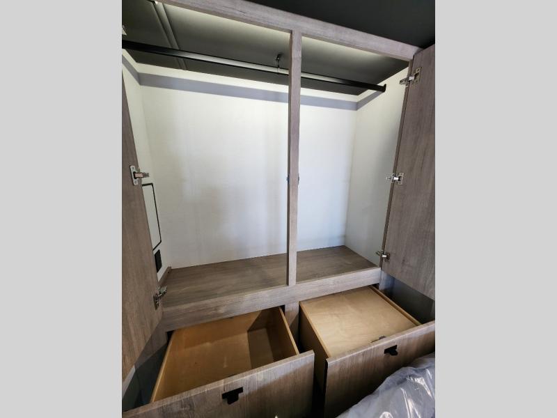 Head to your local state park or across the states in this spacious coach. Once you arrive at your destination, you can prepare a meal with the full kitchen amenities, including a cooktop, microwave oven, and a refrigerator. The power theater seating provides a place to relax, or you can choose the optional booth dinette if you need additional sleeping space. A full bath will let you clean up after a day outdoors, and the 70" x 80" king bed within the full-wall slide is sure to bring comfort. This model also includes a pantry beside the theater seats for snacks and a bedroom wardrobe to keep your clothes wrinkle-free!