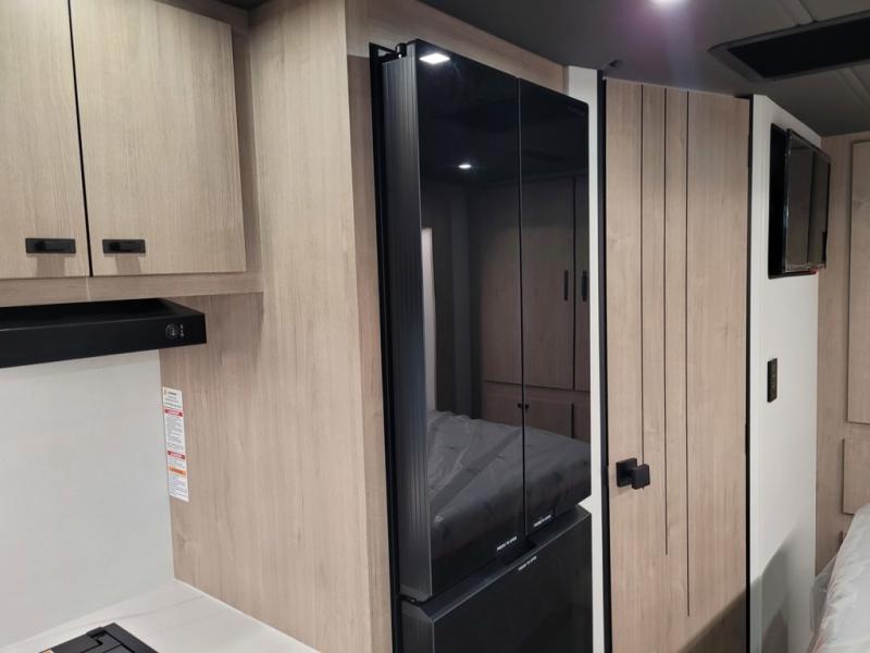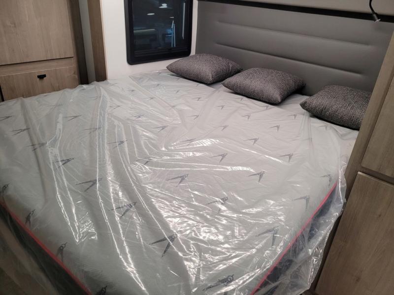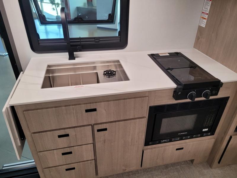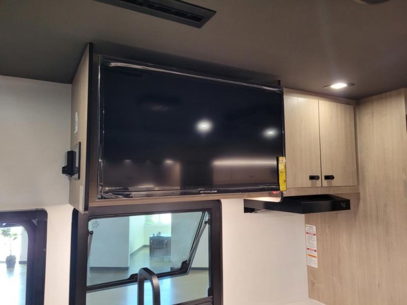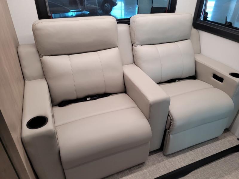Head to your local state park or across the states in this spacious coach that sleeps two. Once you arrive at your destination, you can prepare a meal with the full kitchen amenities, including a cooktop, microwave oven, and a refrigerator. The power theater seating provides a place to relax, or you can choose the optional booth dinette if you need additional sleeping space. A full bath will let you clean up after a day outdoors, and the 70" x 80" king bed within the full-wall slide is sure to bring comfort. This model also includes a pantry beside the theater seats for snacks and a bedroom wardrobe to keep your clothes wrinkle-free!