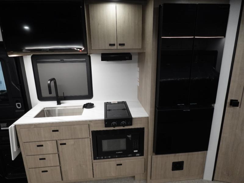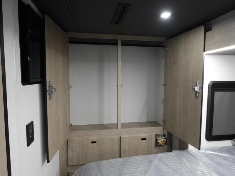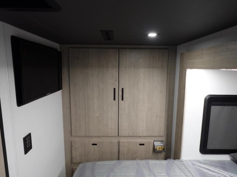 Head to your local state park or across the states in this spacious coach. Once you arrive at your destination, you can prepare a meal with the full kitchen amenities, including a cooktop, microwave oven, and a refrigerator. The power theater seating provides a place to relax. A full bath will let you clean up after a day outdoors, and the 70" x 80" king bed within the full-wall slide is sure to bring comfort. This model also includes a pantry beside the theater seats for snacks and a bedroom wardrobe to keep your clothes wrinkle-free!