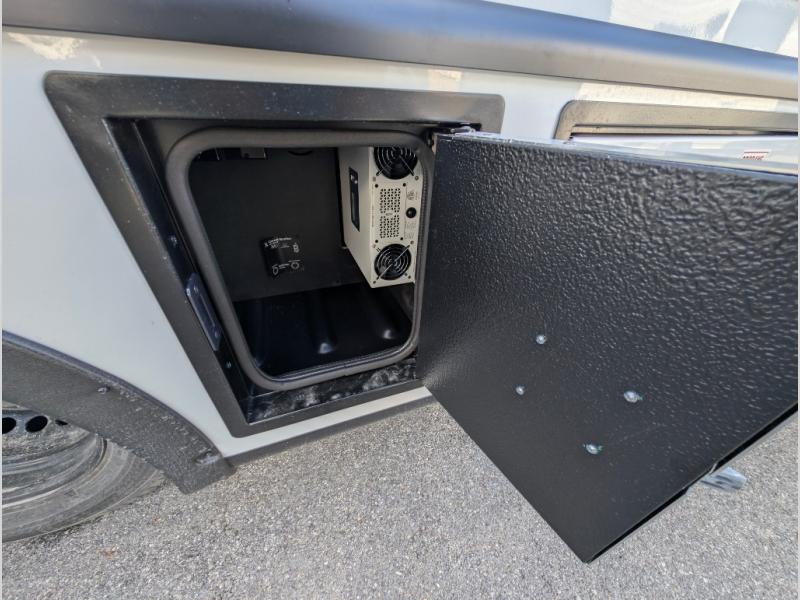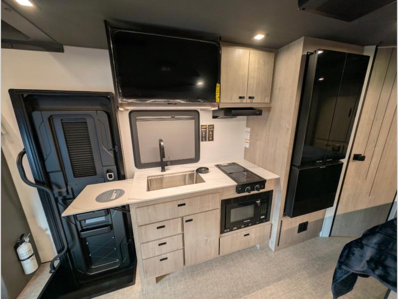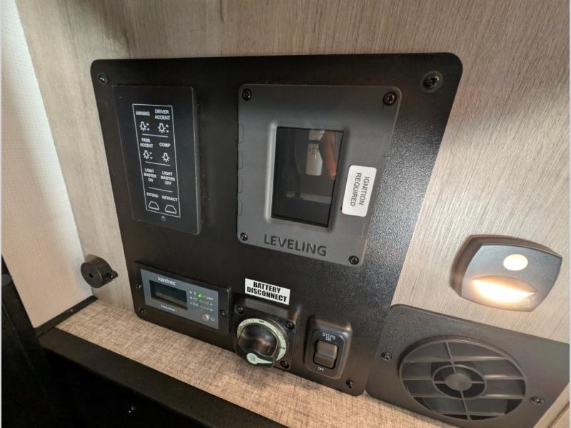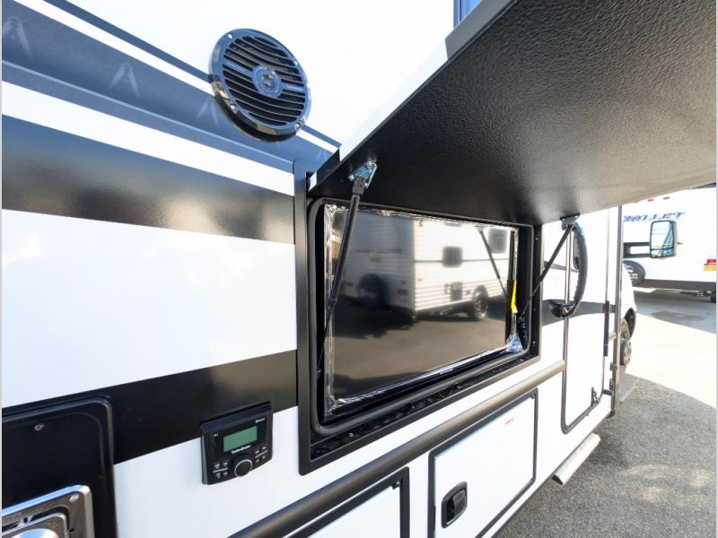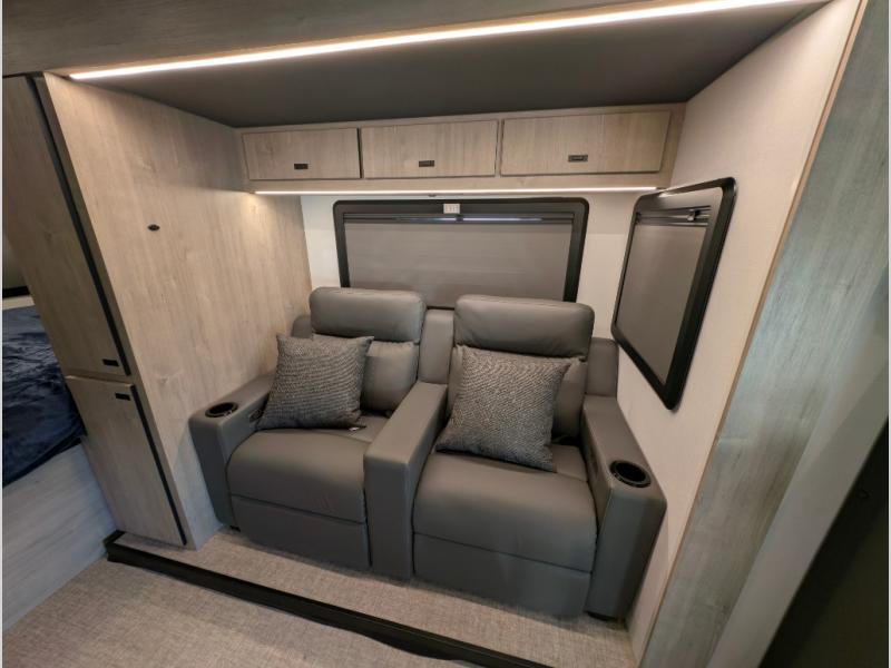 Head to your local state park or across the states in this spacious coach that sleeps two. Once you arrive at your destination, you can prepare a meal with the full kitchen amenities, including a cooktop, microwave oven, and a refrigerator. The power theater seating provides a place to relax, or you can choose the optional booth dinette if you need additional sleeping space. A full bath will let you clean up after a day outdoors, and the 70" x 80" king bed within the full-wall slide is sure to bring comfort. This model also includes a pantry beside the theater seats for snacks and a bedroom wardrobe to keep your clothes wrinkle-free!