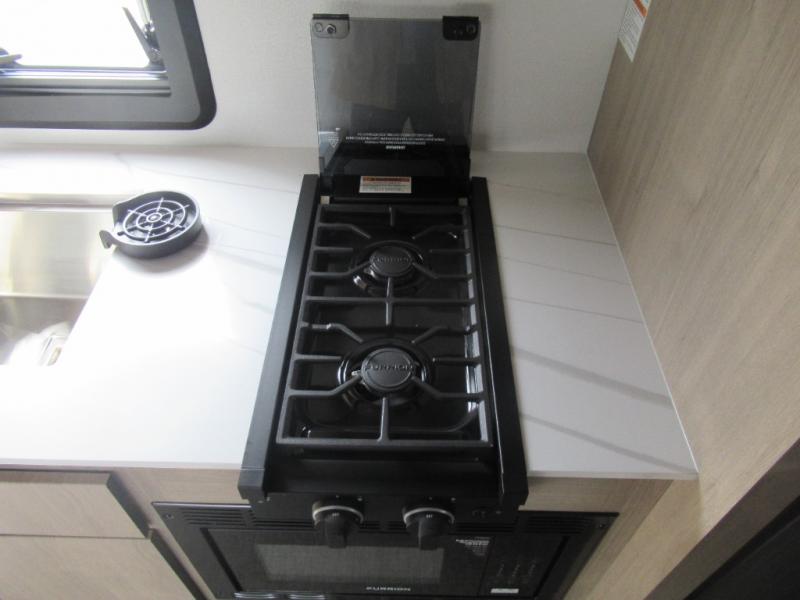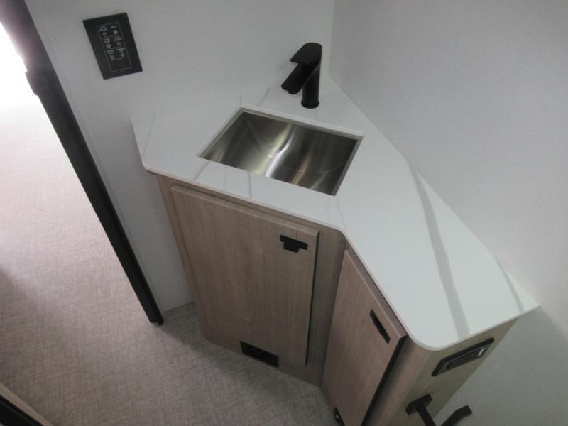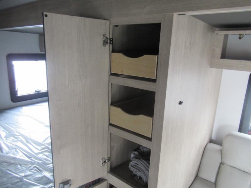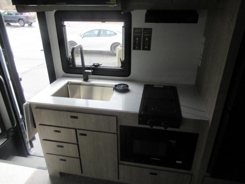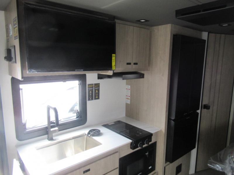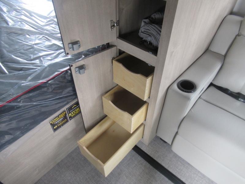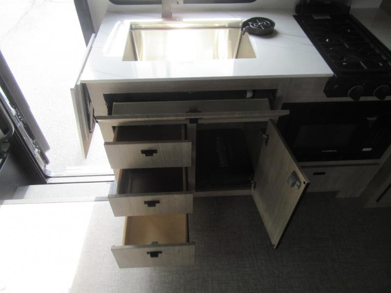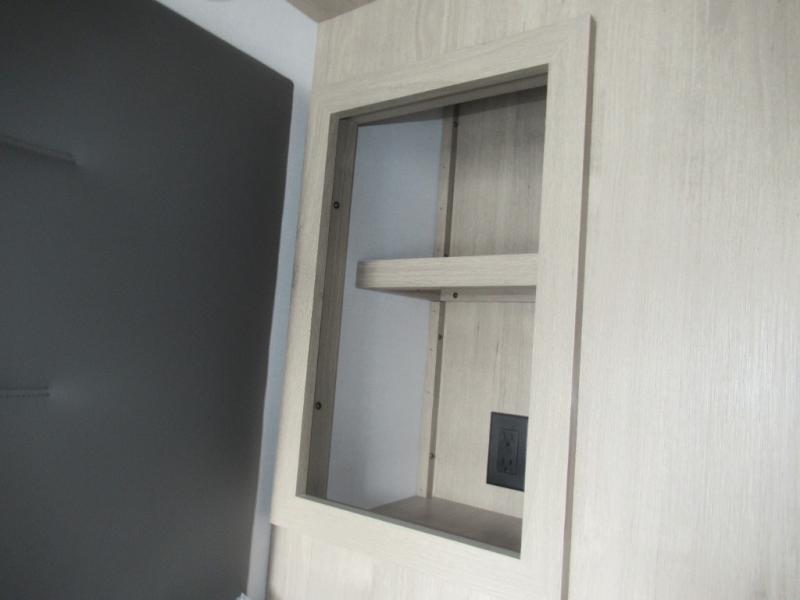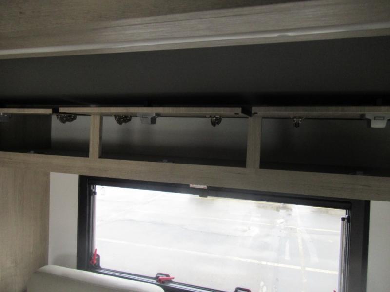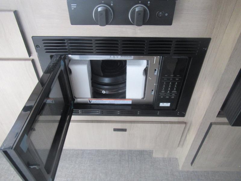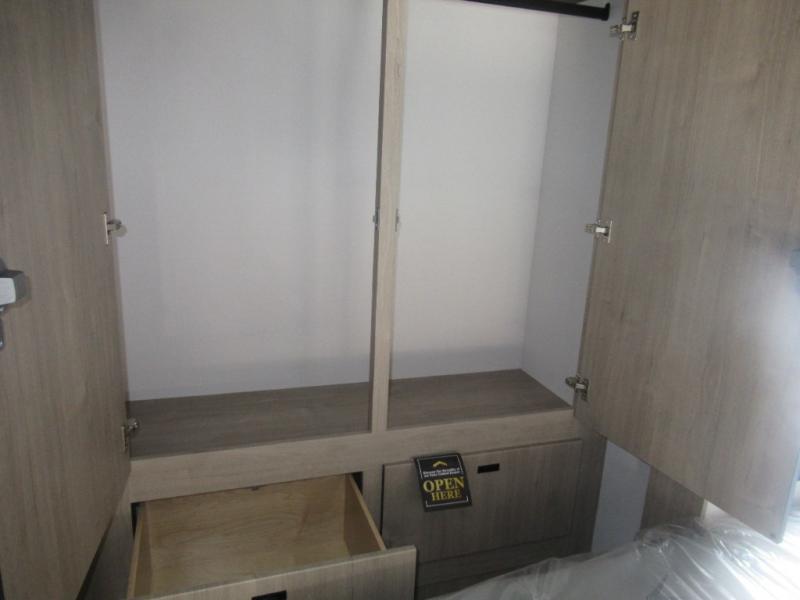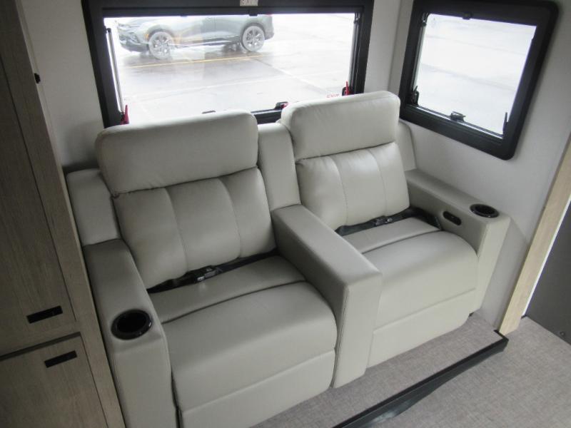 Head to your local state park or across the states in this spacious coach. Once you arrive at your destination, you can prepare a meal with the full kitchen amenities, including a cooktop, microwave oven, and a refrigerator. The power theater seating provides a place to relax, or you can choose the optional booth dinette if you need additional sleeping space. A full bath will let you clean up after a day outdoors, and the 70" x 80" king bed within the full-wall slide is sure to bring comfort. This model also includes a pantry beside the theater seats for snacks and a bedroom wardrobe to keep your clothes wrinkle-free!