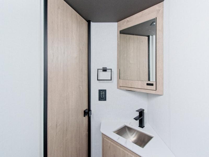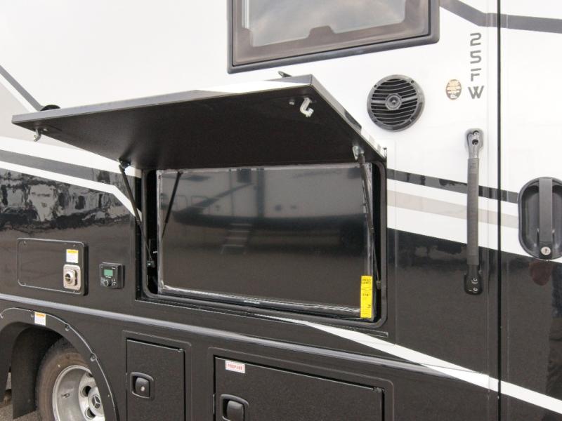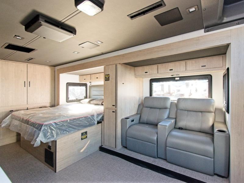 Experience luxury on the road with the Grand Design Lineage 25FW, featuring a spacious full-wall slide and premium power theater seating for unmatched comfort and convenience.