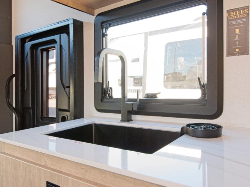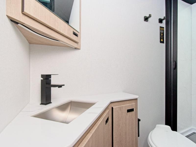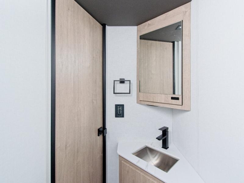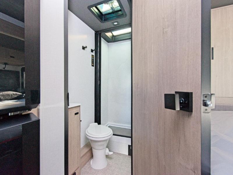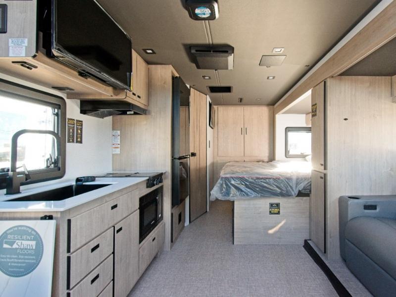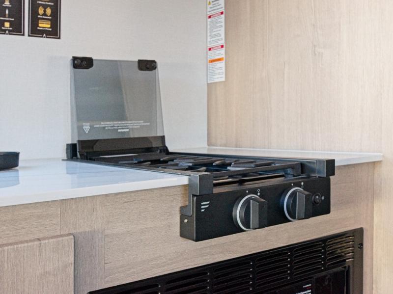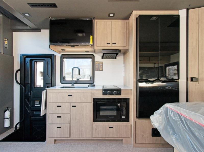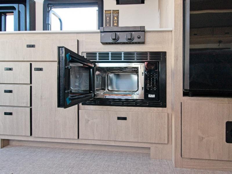 Inside, you'll find a fully equipped kitchen with a cooktop, microwave, and refrigerator—perfect for preparing meals on the go. Relax in the power theater seating, or opt for the booth dinette upgrade to add extra sleeping space. After a day of exploring, refresh in the full bath, then unwind on the 70" x 80" king-size bed nestled within the full-wall slide.