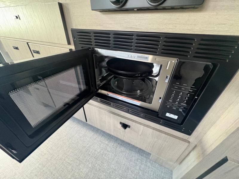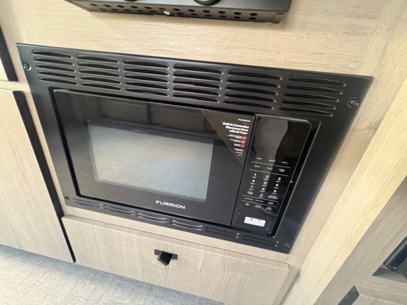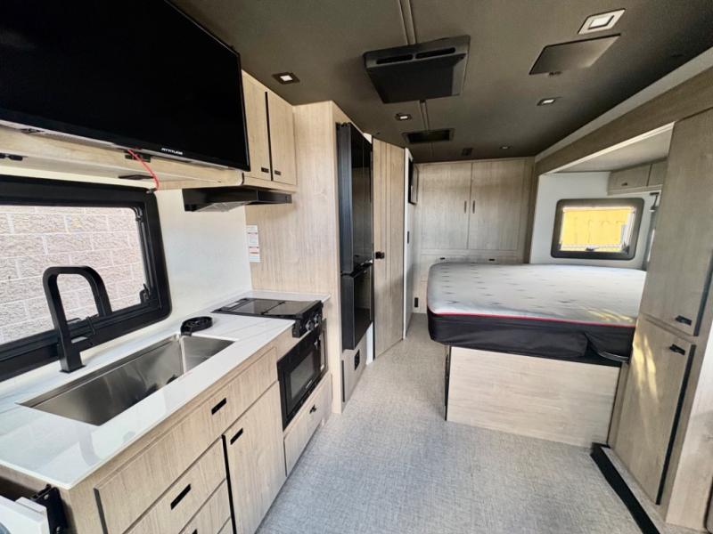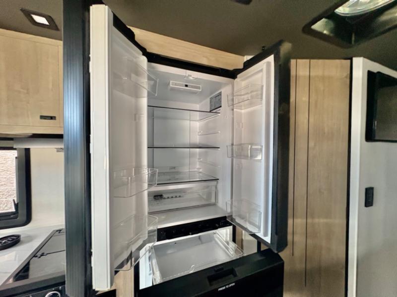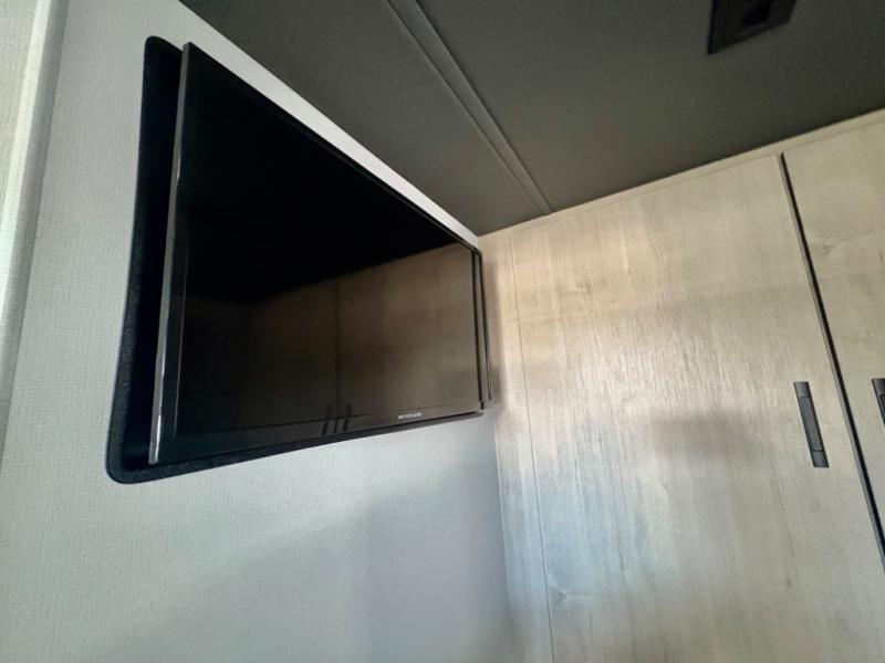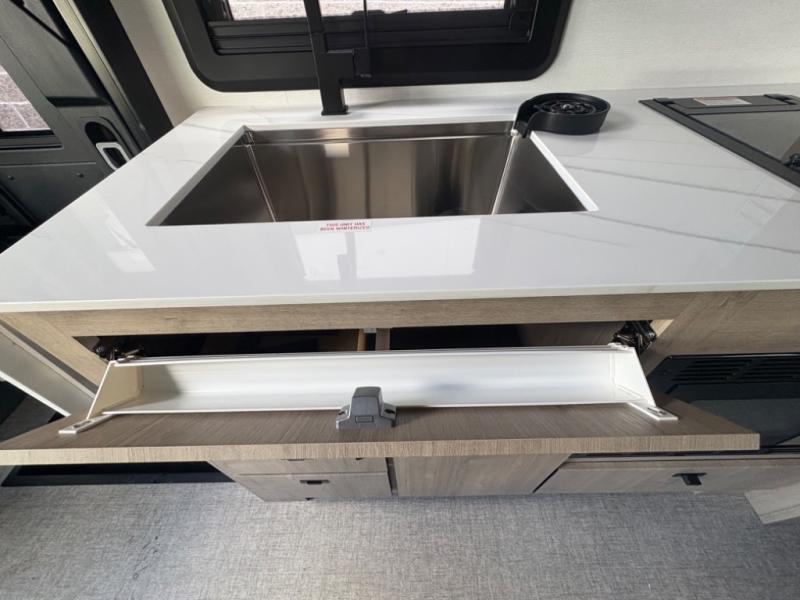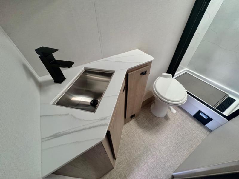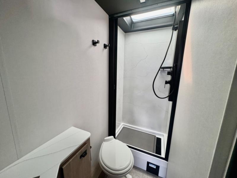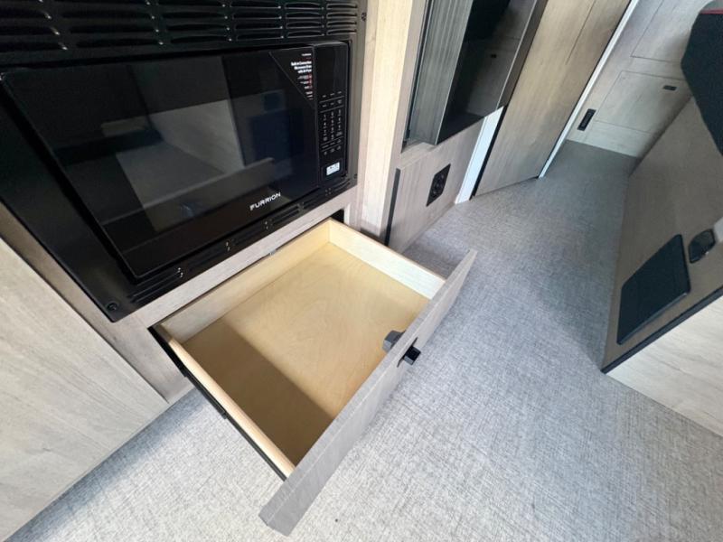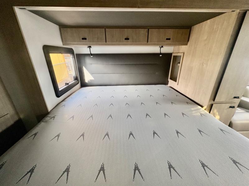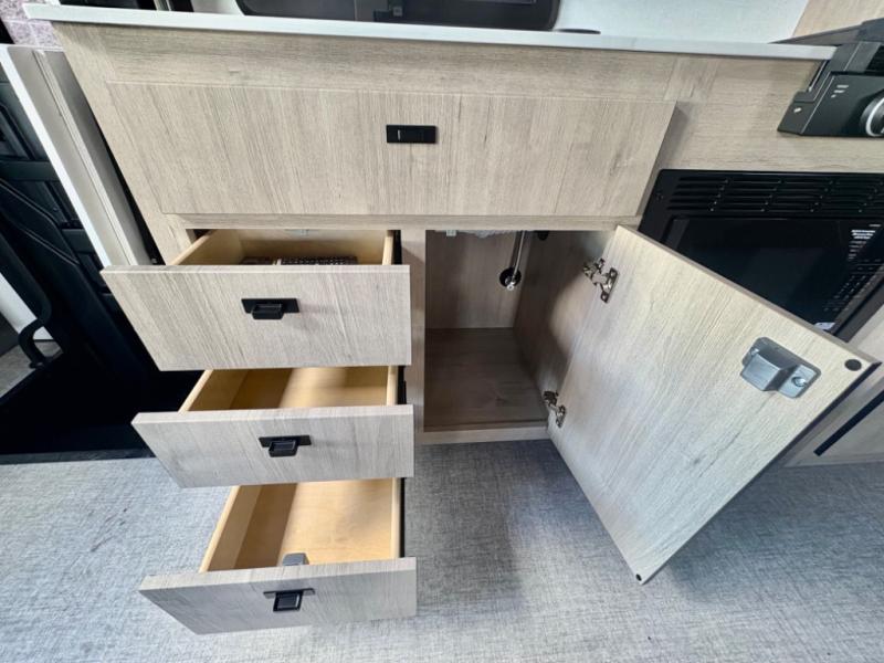 The modern kitchen is equipped with residential-style appliances, ample counter space, and generous cabinetry, making meal prep easy and enjoyable wherever you roam. The comfortable bedroom offers a relaxing retreat with practical storage, while the well-appointed bathroom provides everyday convenience on the road.