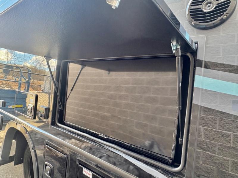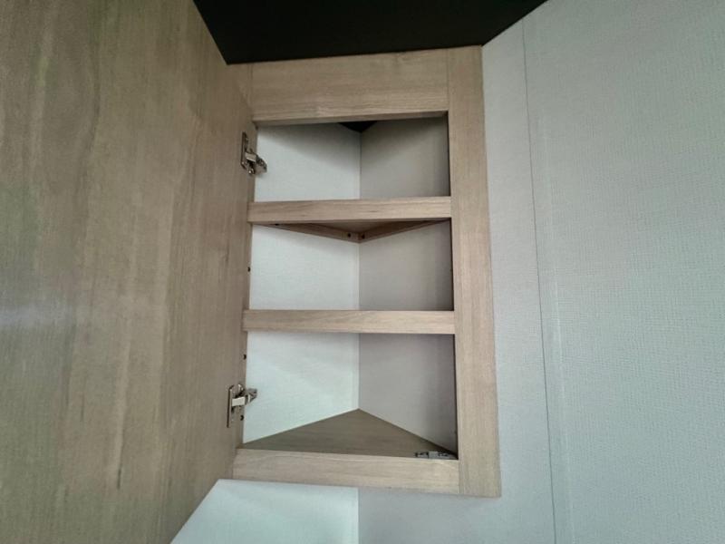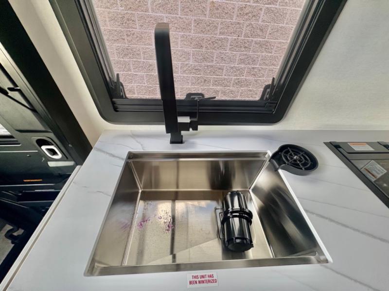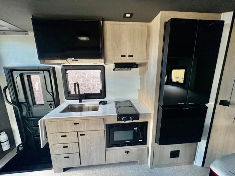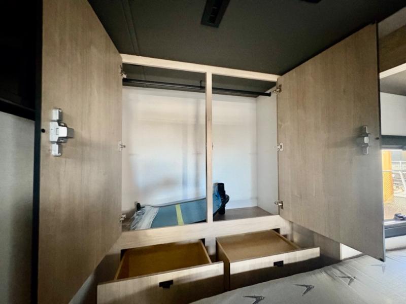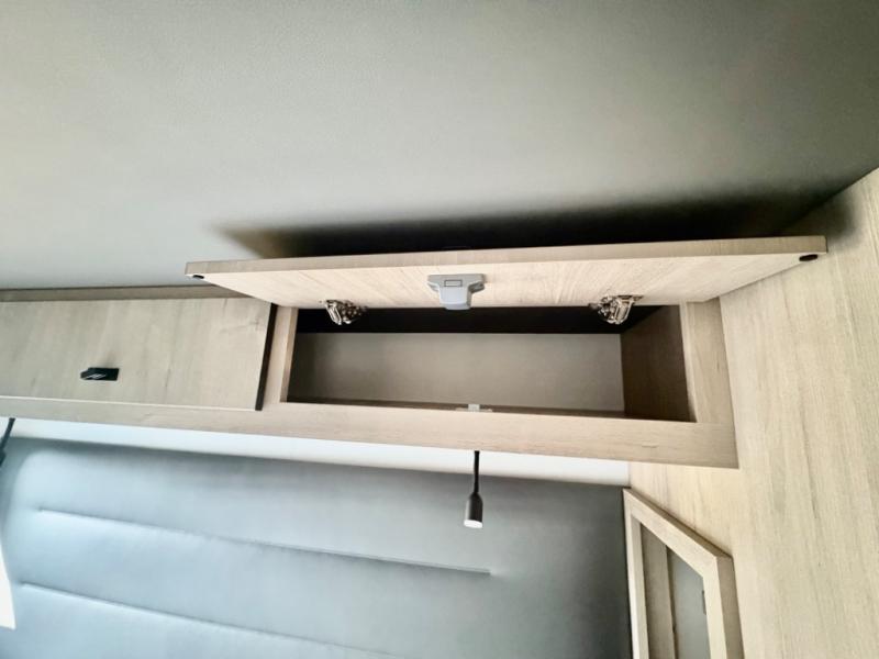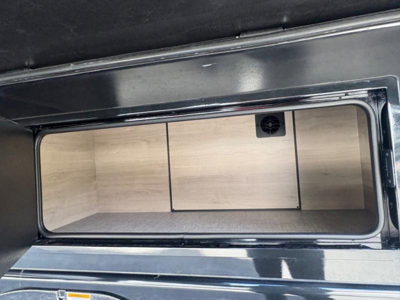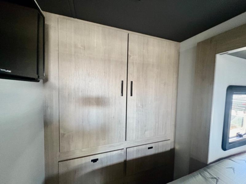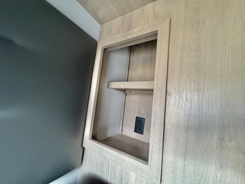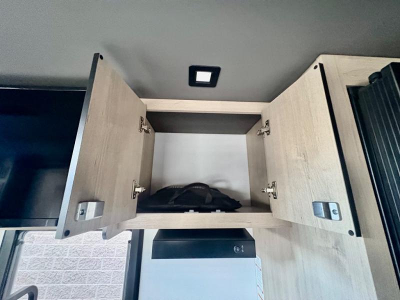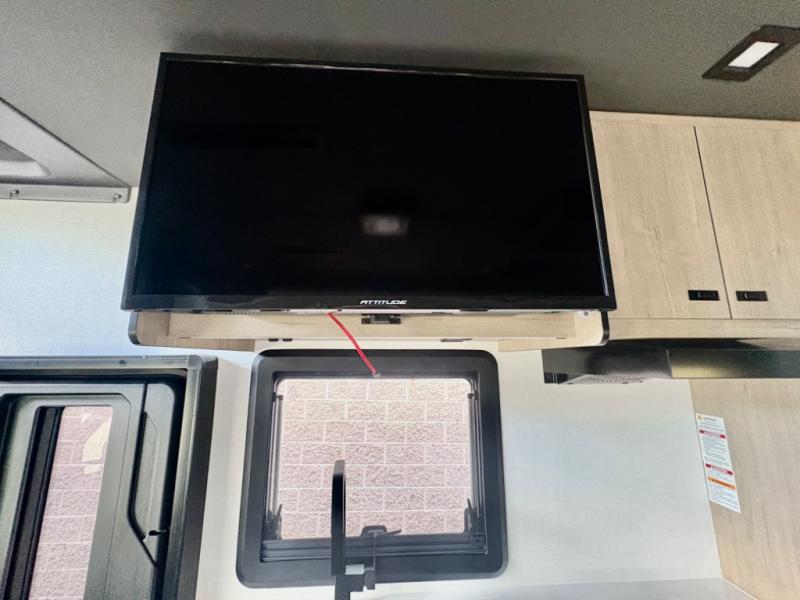 The modern kitchen is equipped with residential-style appliances, ample counter space, and generous cabinetry, making meal prep easy and enjoyable wherever you roam. The comfortable bedroom offers a relaxing retreat with practical storage, while the well-appointed bathroom provides everyday convenience on the road.