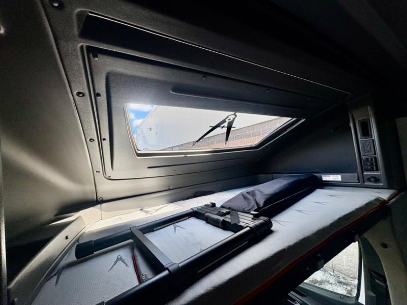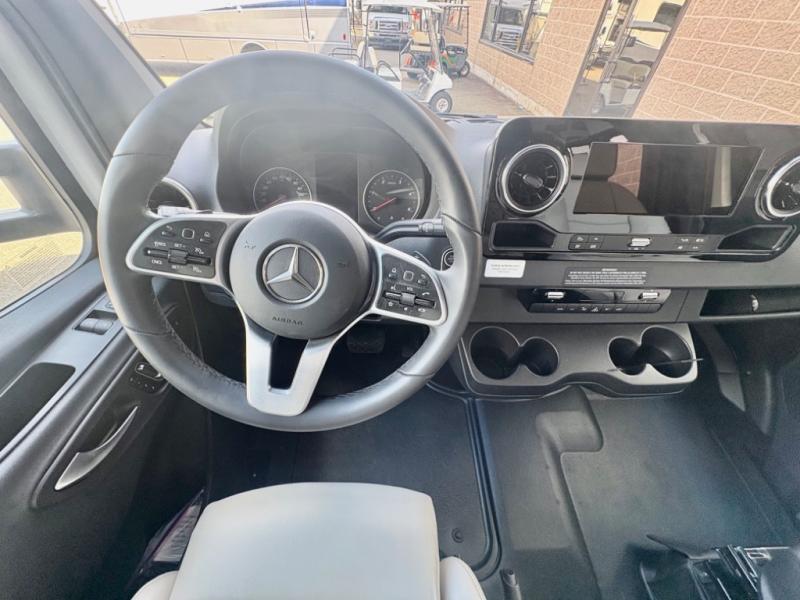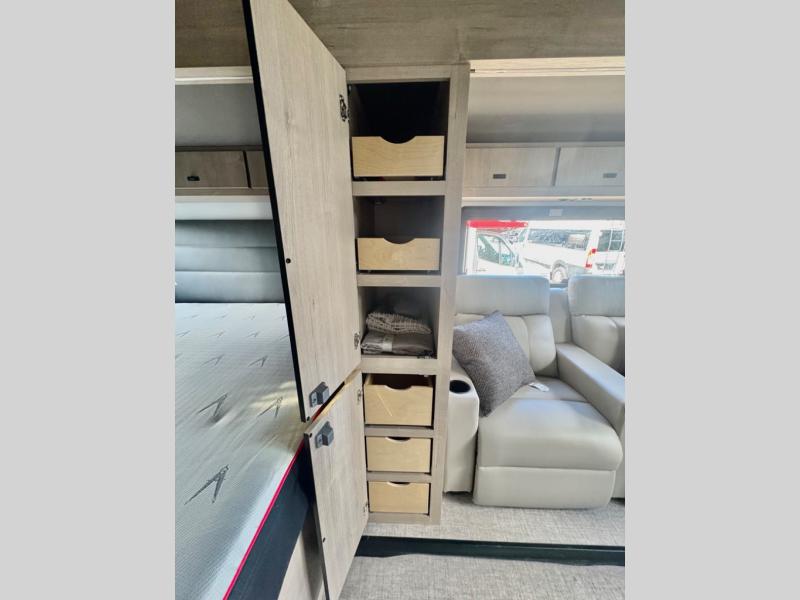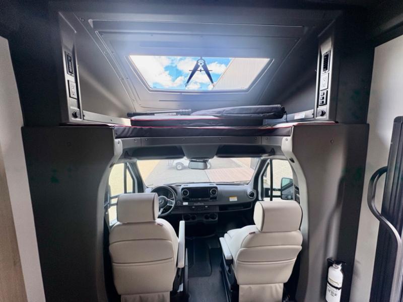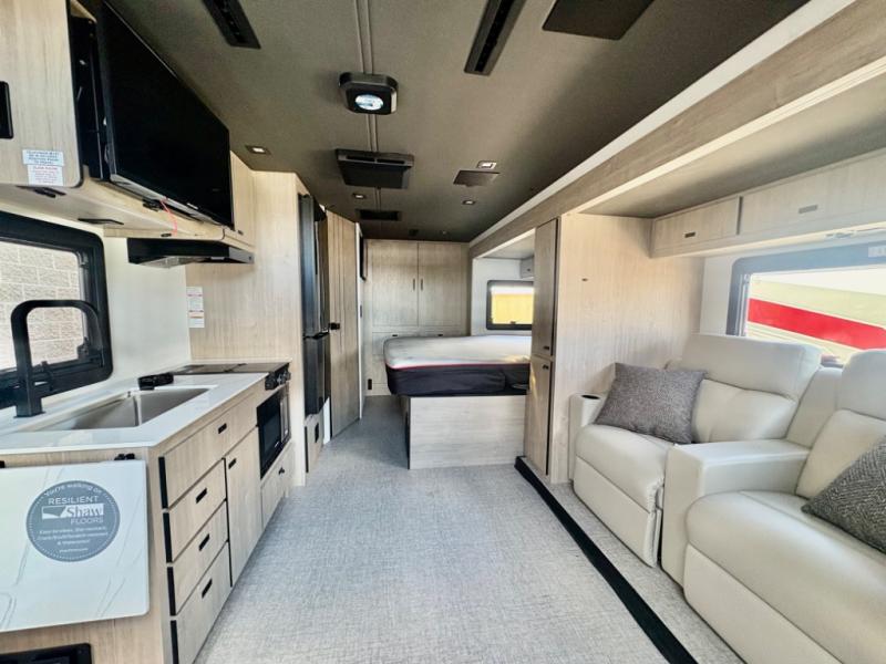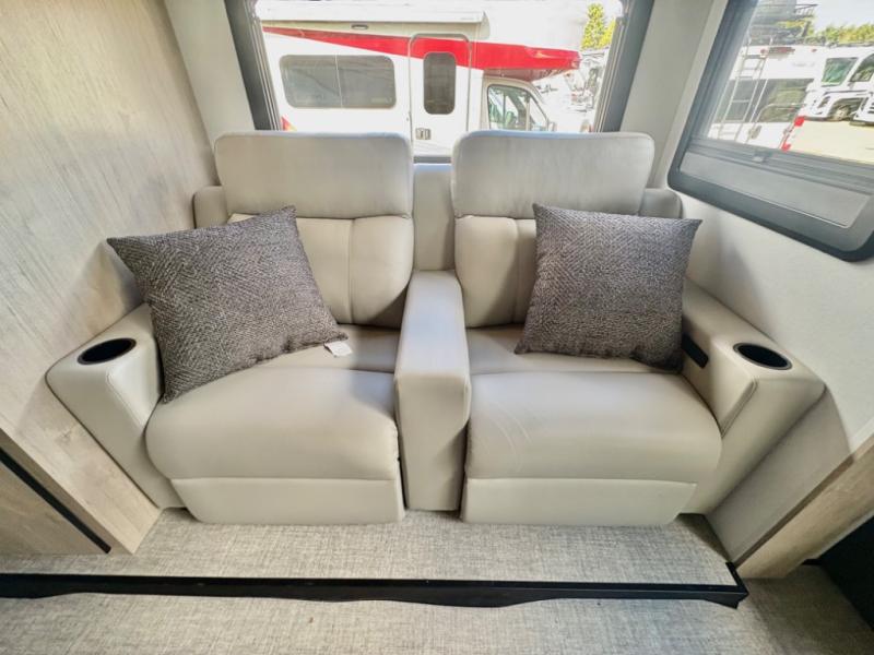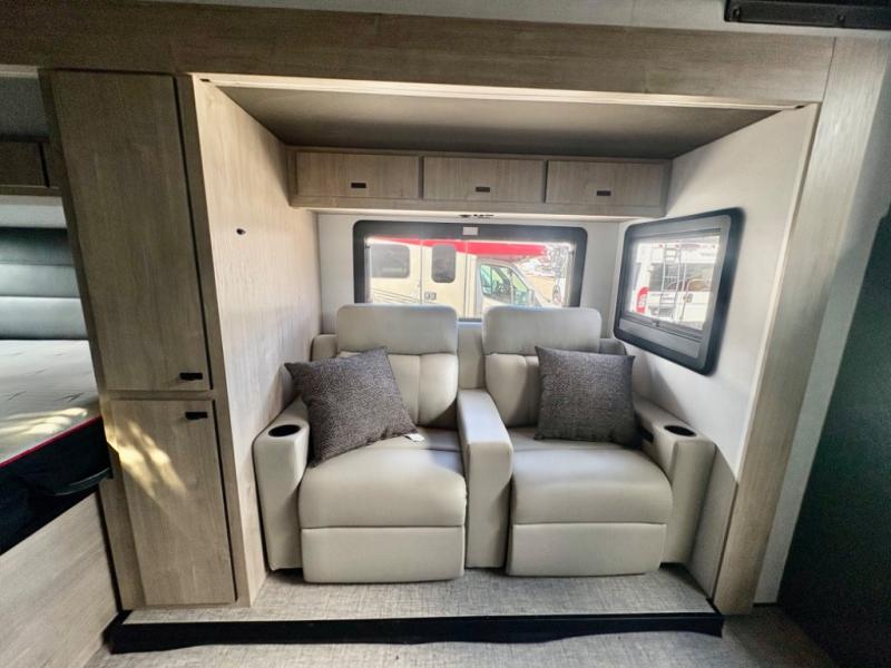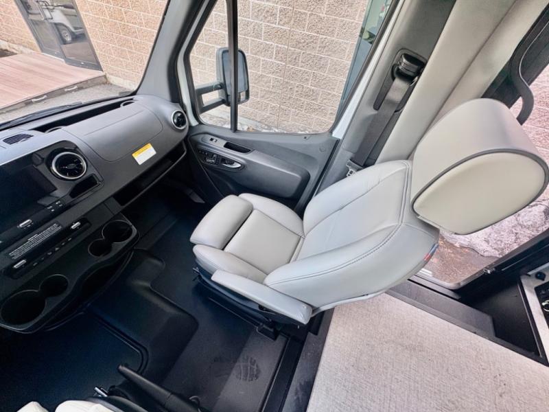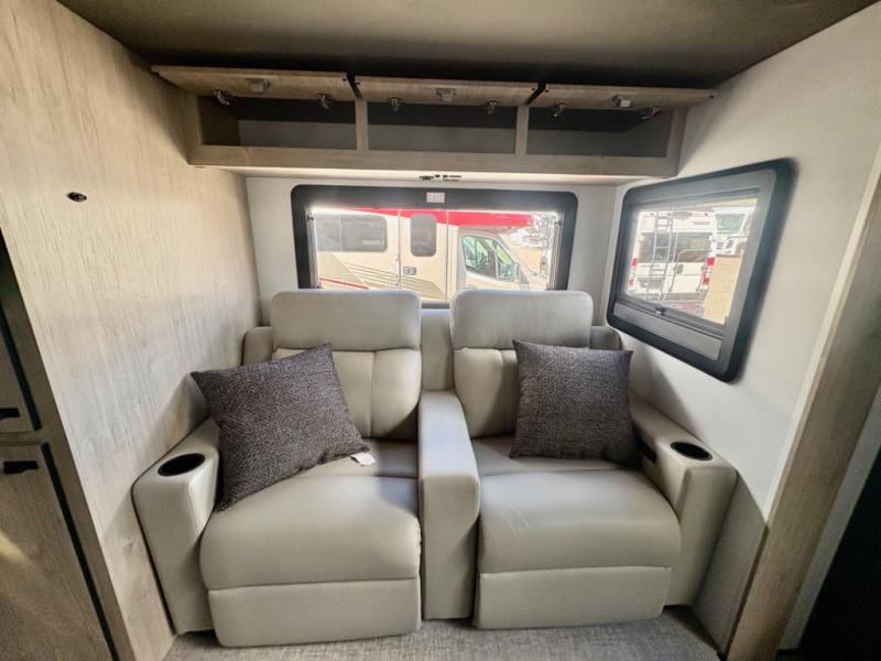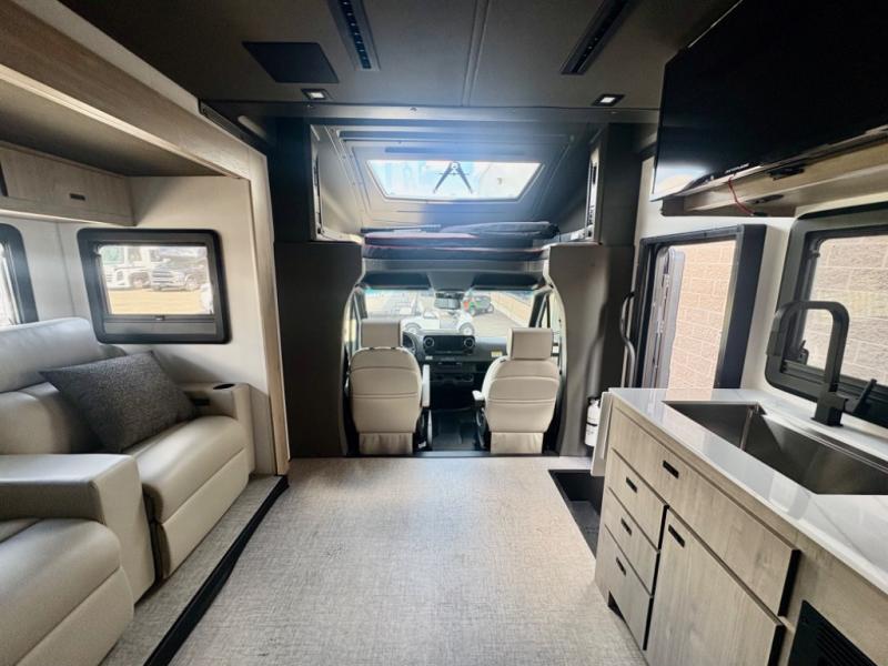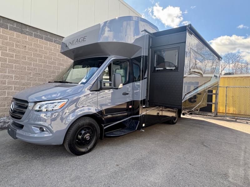 Travel in premium comfort with the 2025 Grand Design Lineage M 25FW, featuring a room-expanding full-wall slide and luxurious power theater seating built on a Mercedes-Benz Sprinter chassis.