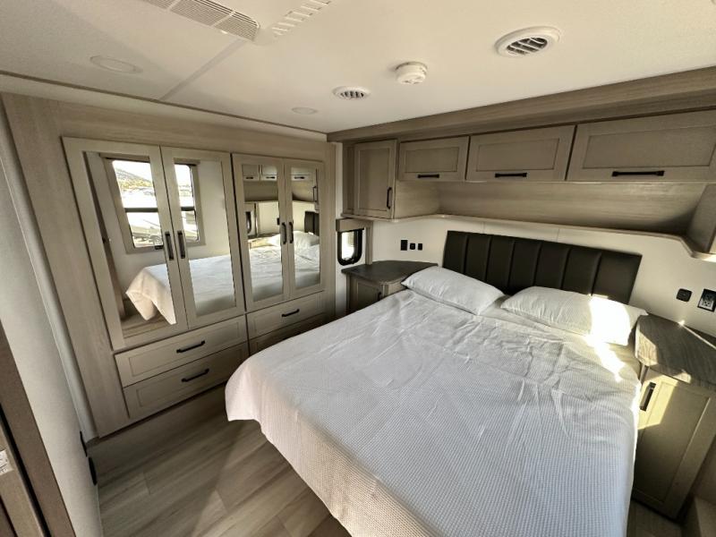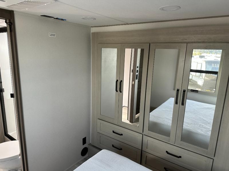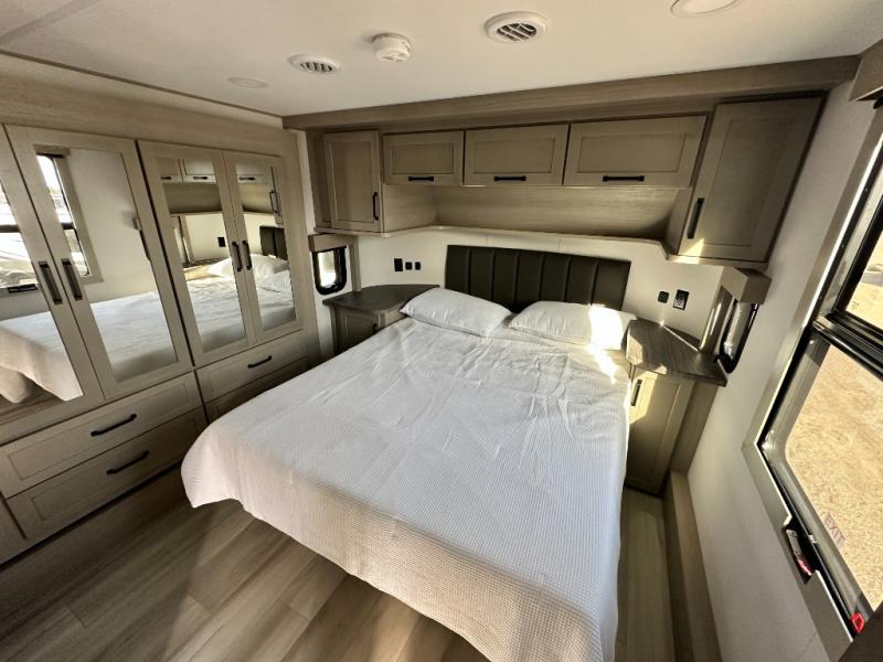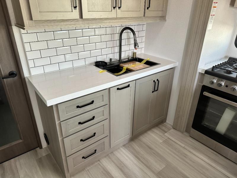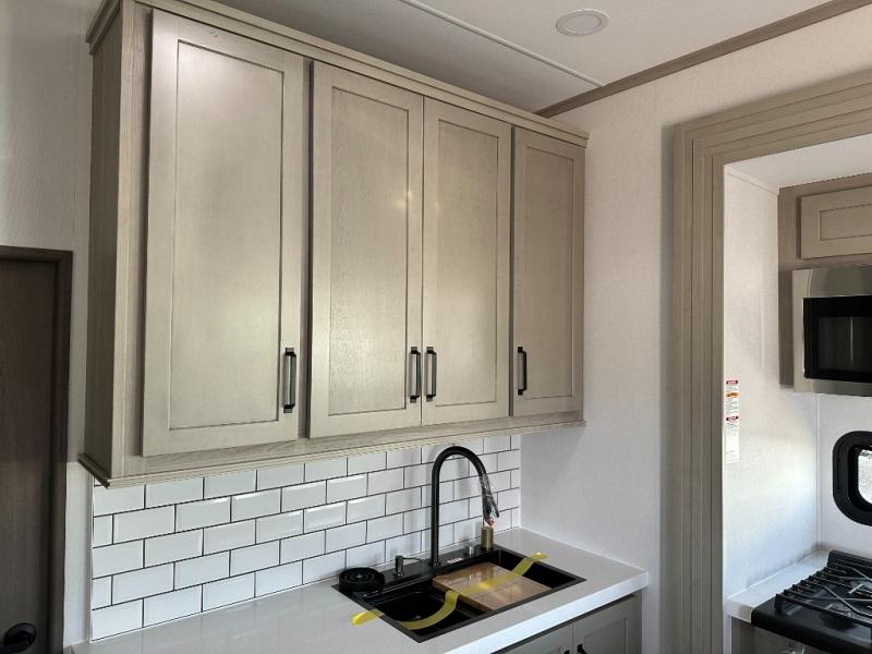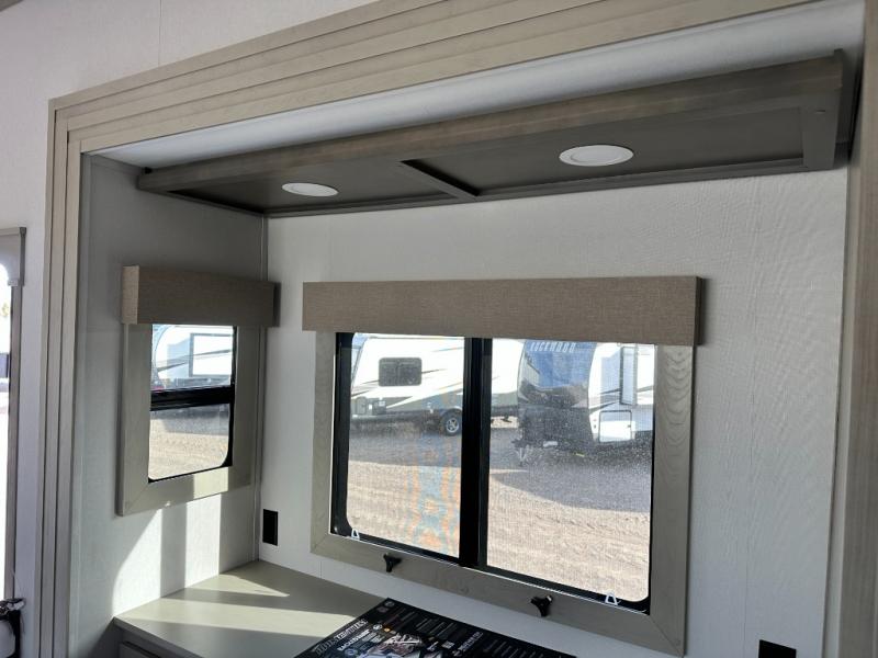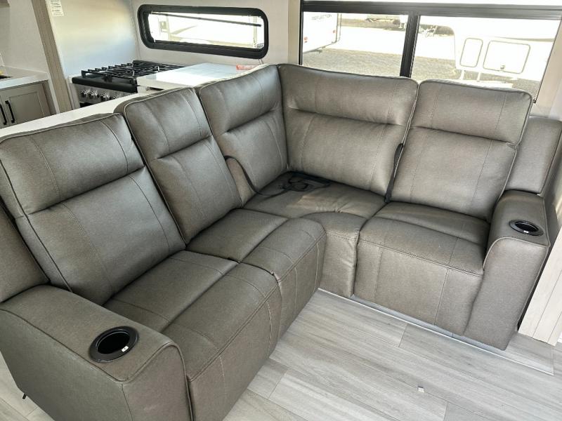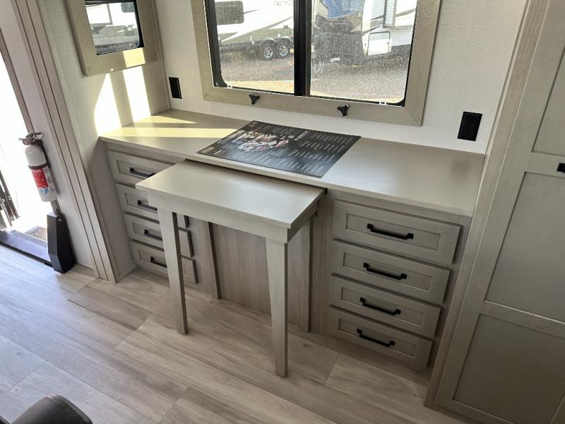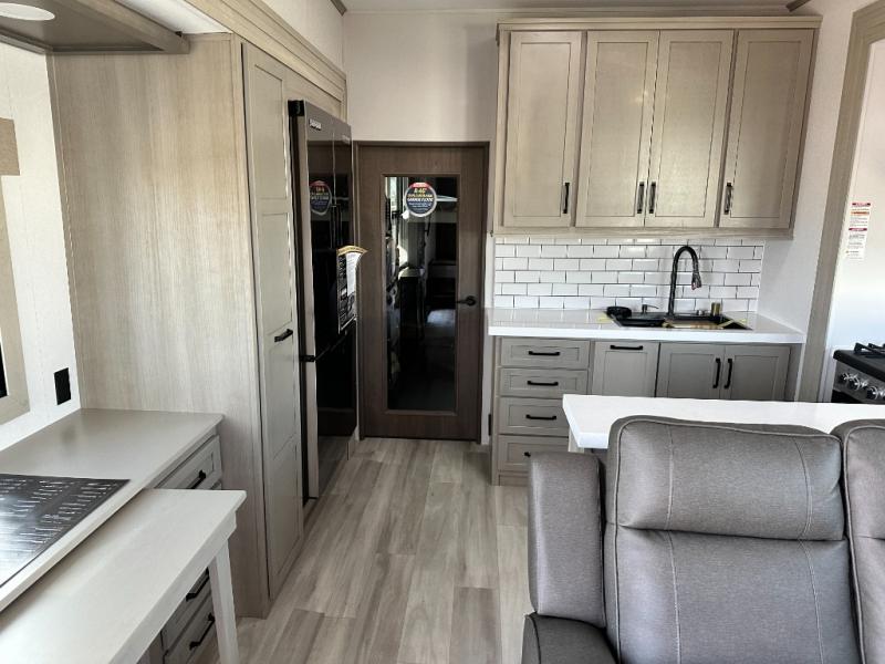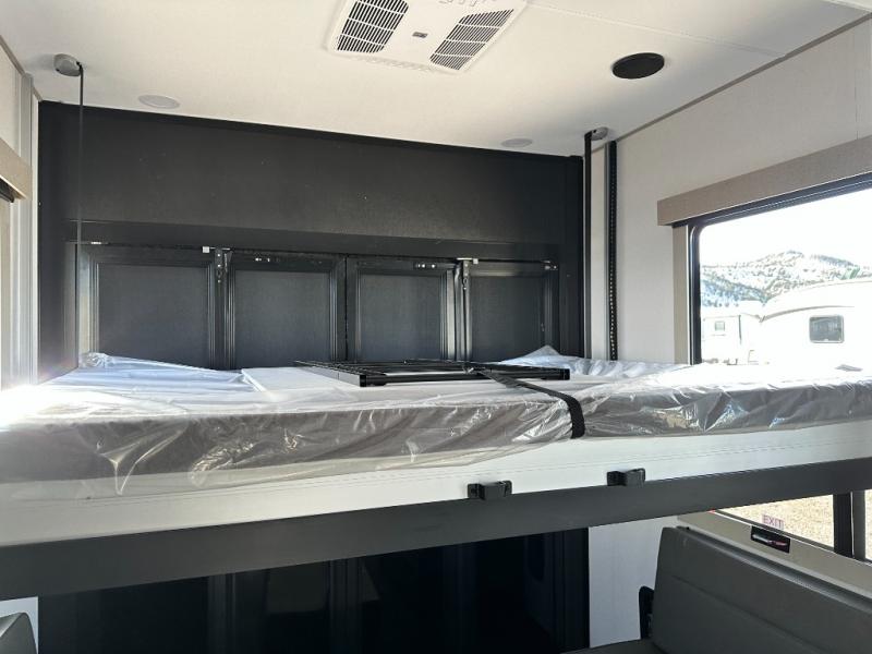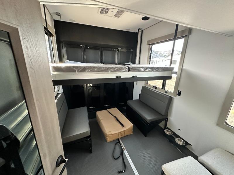 Spend your days at the campground kicking up mud with this toy hauler in tow! once you've unloaded your toys from the ramp door, you can use the 60 gallon fuel station to fill up and head out on a trail! The overhead bed provides a place for guests to sleep, and there is an optional Liftsuite System for more sleeping space if needed. There is even an optional half bath here if you choose to make this space more accommodating. Head to the middle kitchen and living area where you'll enjoy generous counter space to prep meals, a spacious 20 cu. ft. refrigerator, an L-shaped sofa with recline, plus a hybrid desk/dinette that will serve as a dining or working space. The dual entry bath creates a front master bedroom you are sure to love. There is a queen bed with an optional king bed, plenty of overhead storage, and a wardrobe slide to keep your things organized.