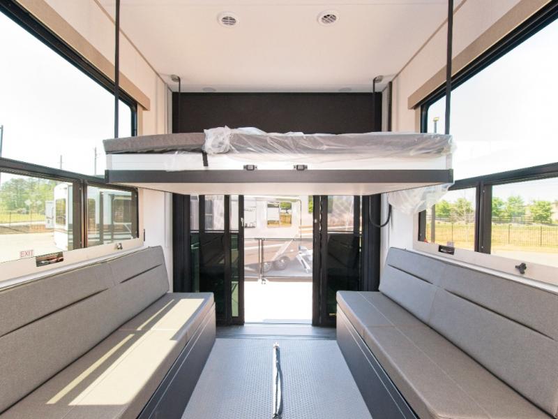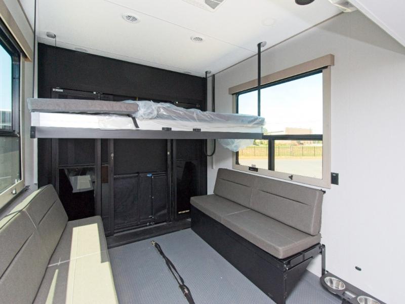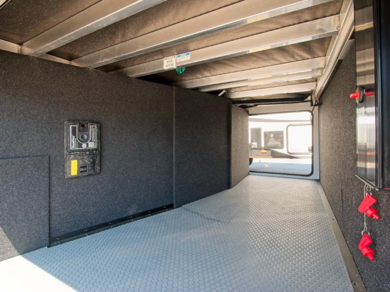 Inside, enjoy color-changing LED accent lighting, raised panel hardwood cabinet doors with hidden hinges, and a central vacuum system. Each toy hauler includes four packages: