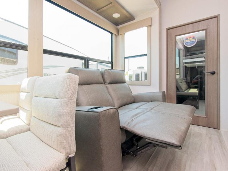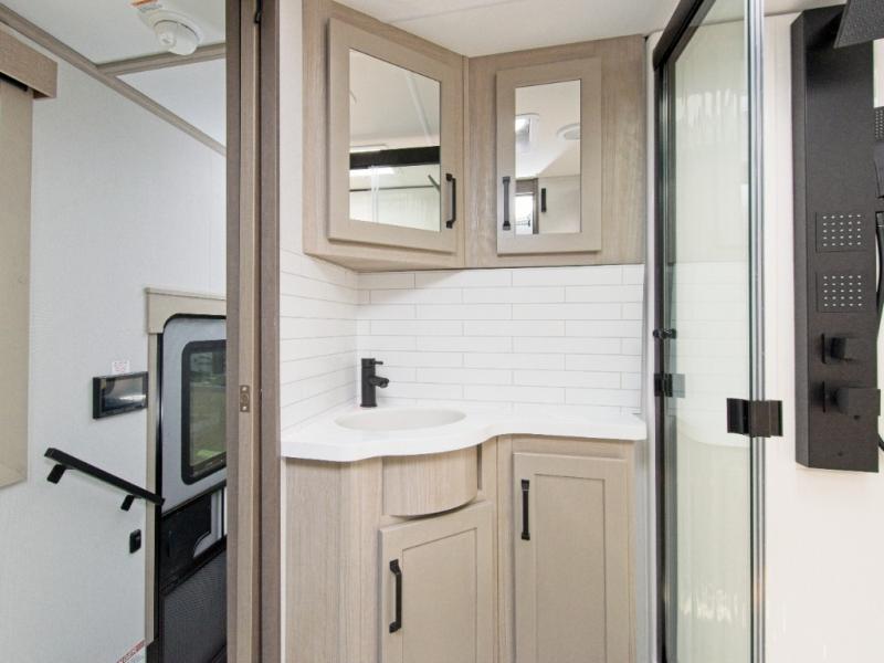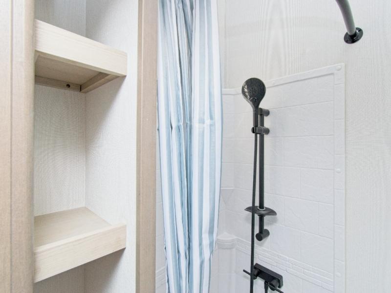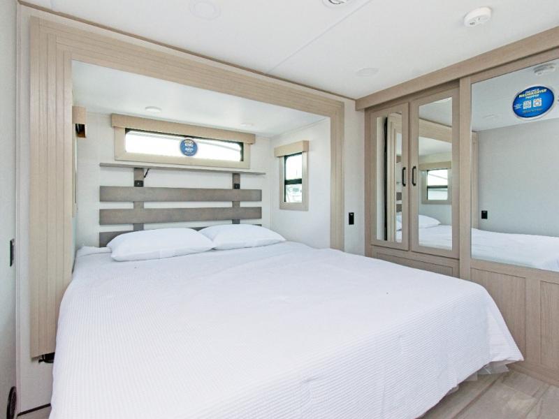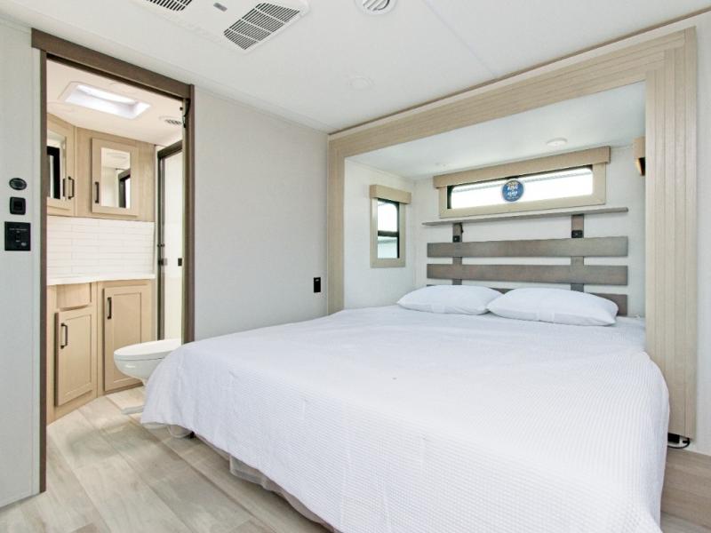 Head to the front of the fifth wheel to find a full bathroom with a one-piece fiberglass shower, glass door, and teak seat. Rest comfortably on your queen bed, or opt for a king bed in the front bedroom.