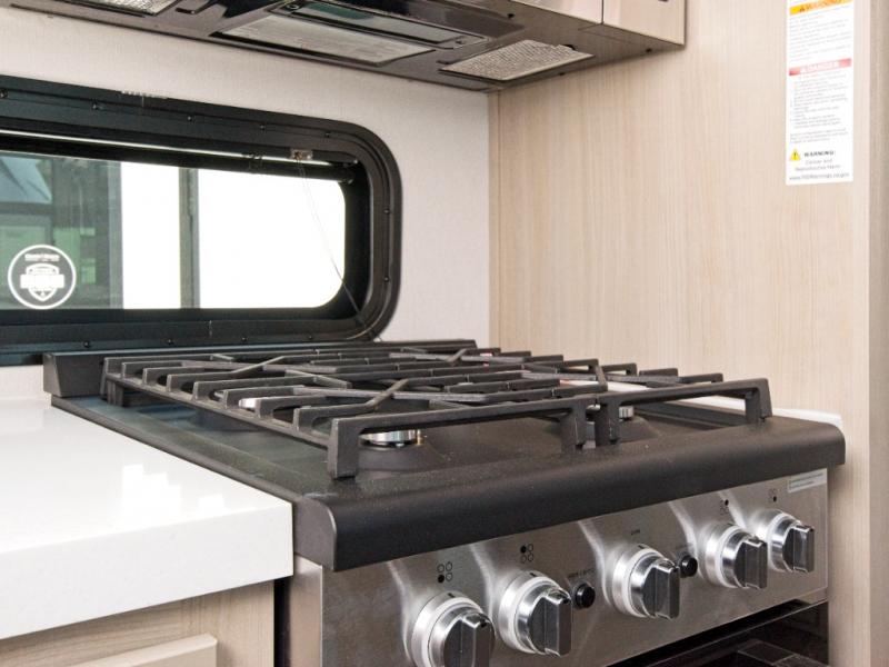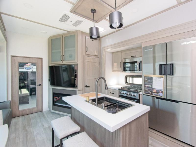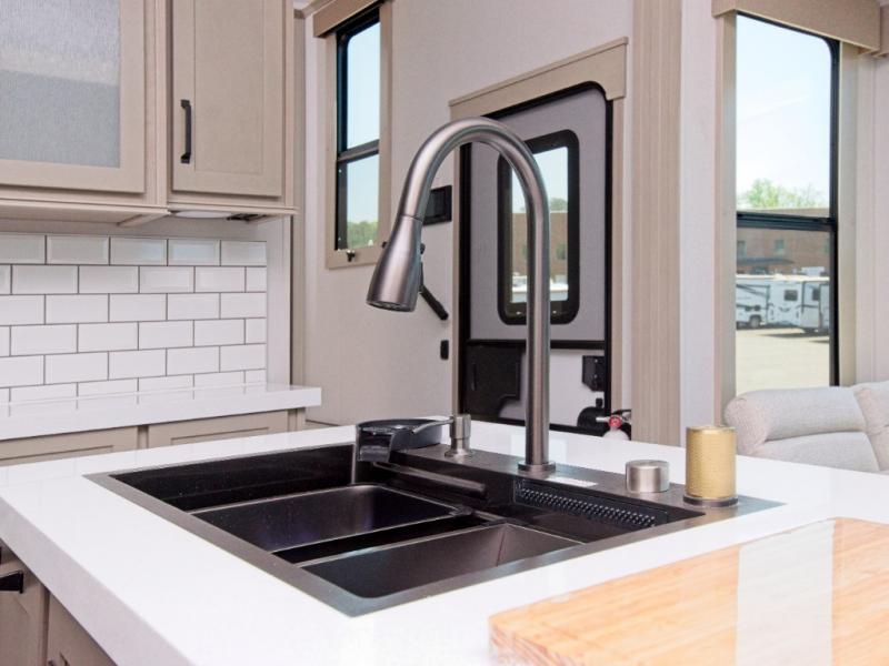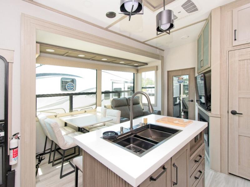Enjoy the full bathroom and LED TV in the garage, with the option to add Happi-Jac rollover sofas/table with a top bed. The main living area offers a 49" LED TV, a fireplace, theatre seating, and a free-standing dinette, along with full kitchen amenities. The new Smart Sink includes a removable cutting board, produce strainer, and glass rinser, making meal prep a breeze.