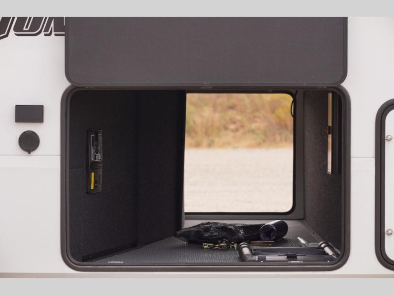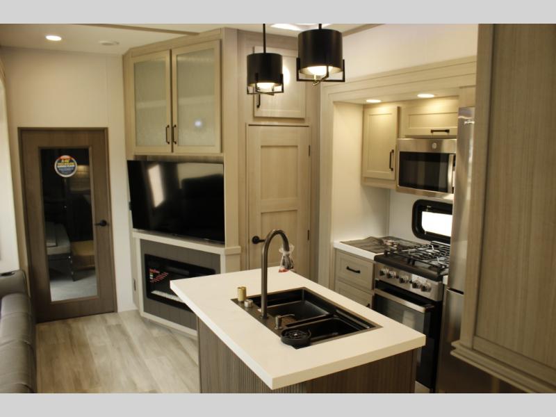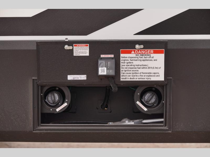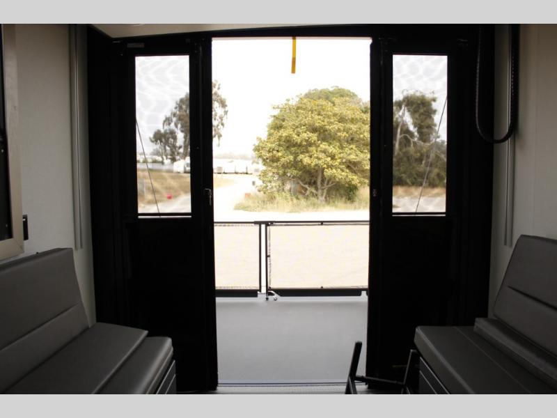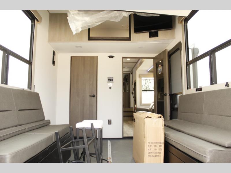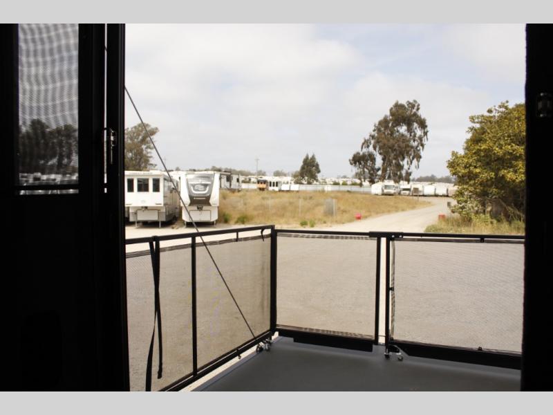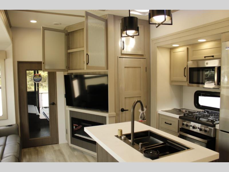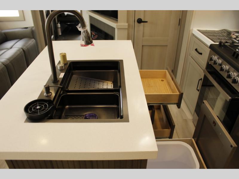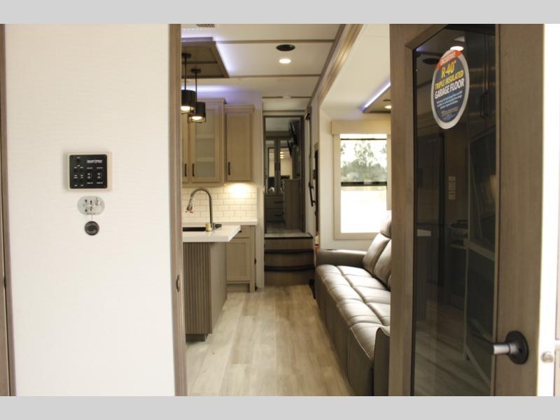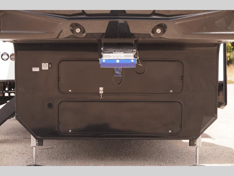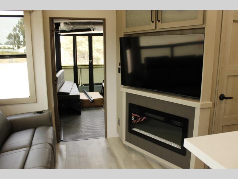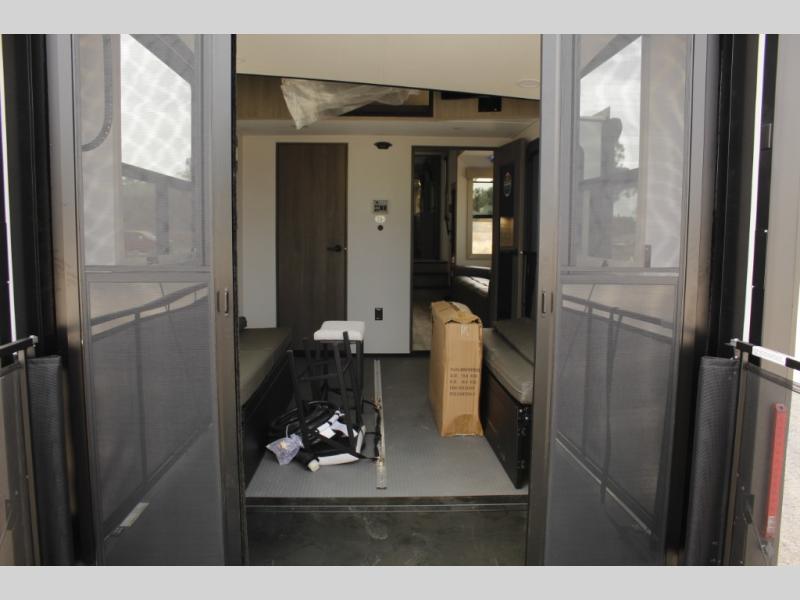 Load up your toys, your clothes and food and start your adventure as you smoothing tow this fifth wheel to your campsite. You will enjoy the Fast Ramp rear ramp door, the Ram-Air garage vents on both sides, and the 2,500 lb. rated flush-mount tie-downs to keep your toys secure. You will surely appreciate the full bathroom and LED TV, plus the option to add Happi-Jac rollover sofas/table with a top bed. The main area provides a living and kitchen area with a 49" LED TV and a fireplace, theatre seating and a free standing dinette, plus full kitchen amenities. There is also a new Smart Sink with a removable cutting board, produce strainer and glass rinser you are sure to love. Head up front to use the full bathroom with a one-piece fiberglass shower with a glass door and teak seat, and fall quickly to sleep on your own queen bed or choose a king option in the front bedroom.