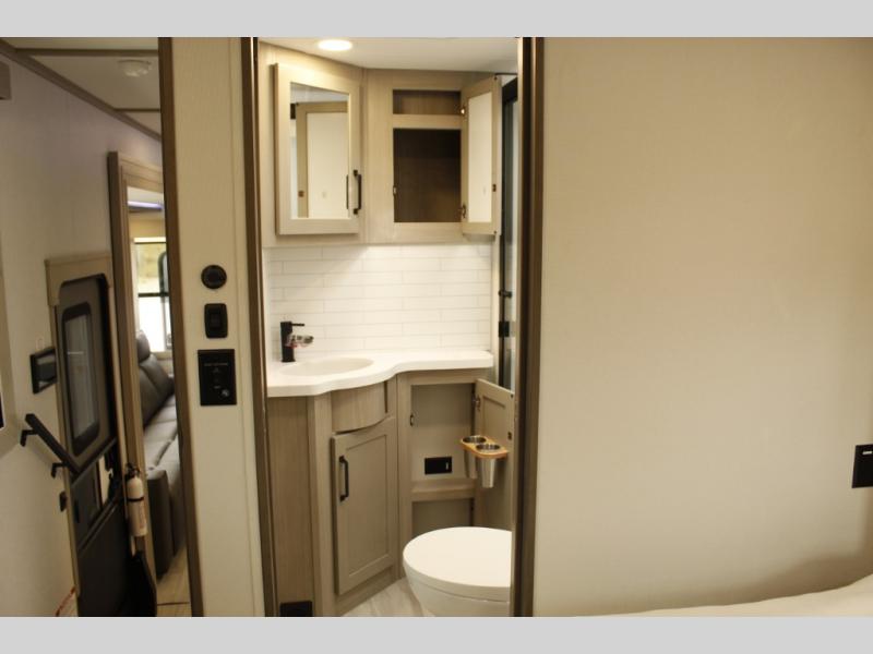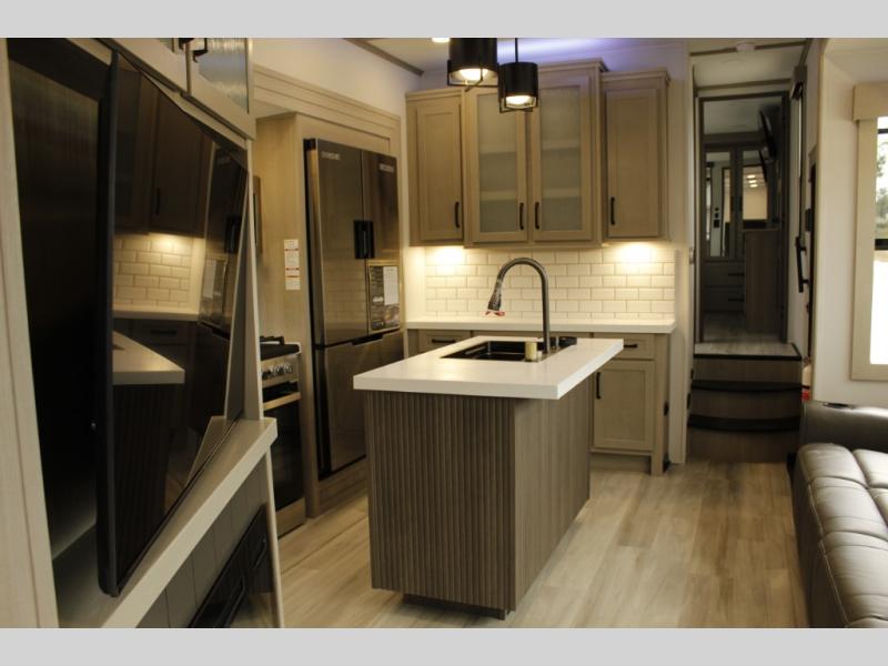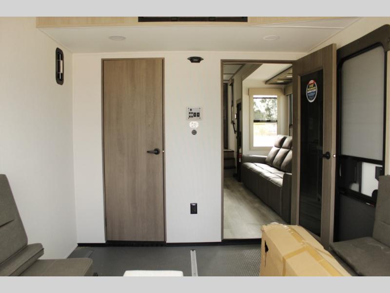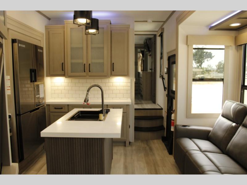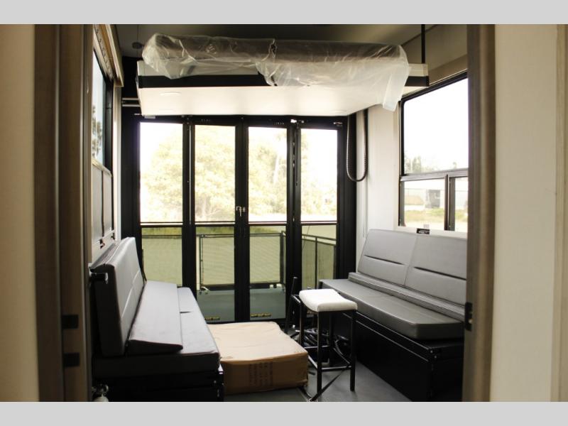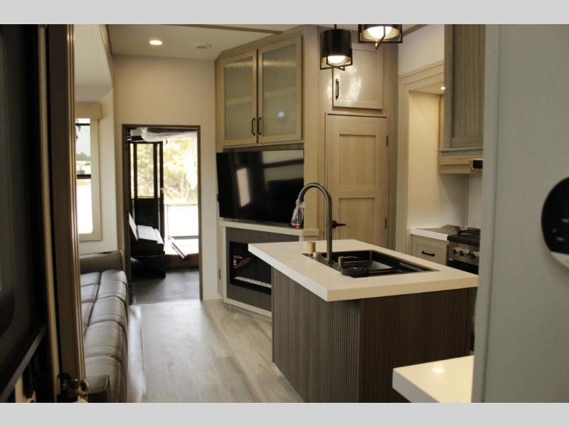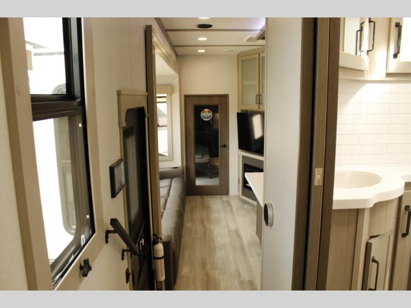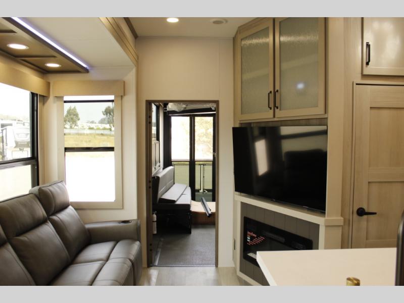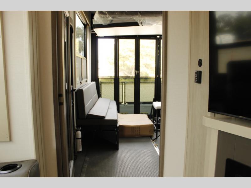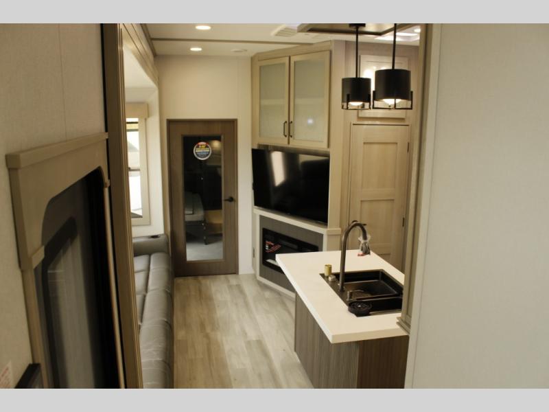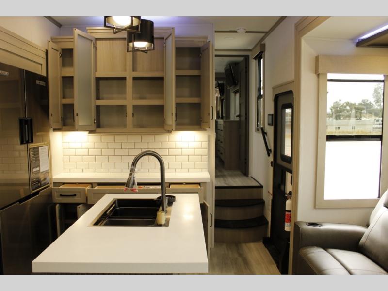 Load up your toys, your clothes and food and start your adventure as you smoothing tow this fifth wheel to your campsite. You will enjoy the Fast Ramp rear ramp door, the Ram-Air garage vents on both sides, and the 2,500 lb. rated flush-mount tie-downs to keep your toys secure. You will surely appreciate the full bathroom and LED TV, plus the option to add Happi-Jac rollover sofas/table with a top bed. The main area provides a living and kitchen area with a 49" LED TV and a fireplace, theatre seating and a free standing dinette, plus full kitchen amenities. There is also a new Smart Sink with a removable cutting board, produce strainer and glass rinser you are sure to love. Head up front to use the full bathroom with a one-piece fiberglass shower with a glass door and teak seat, and fall quickly to sleep on your own queen bed or choose a king option in the front bedroom.