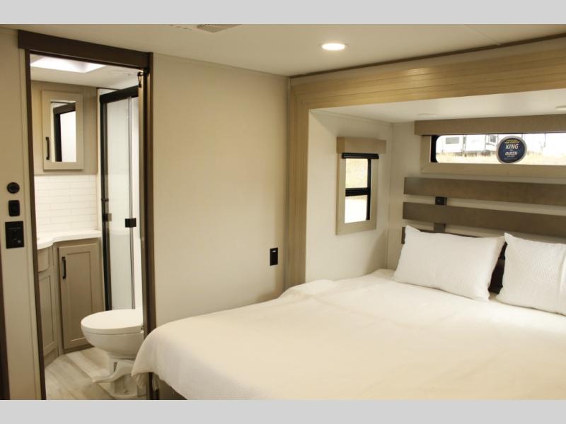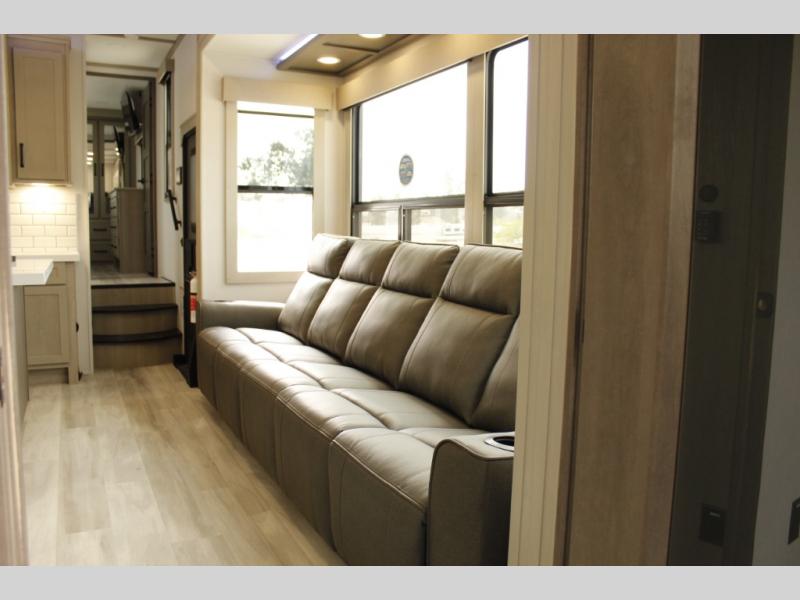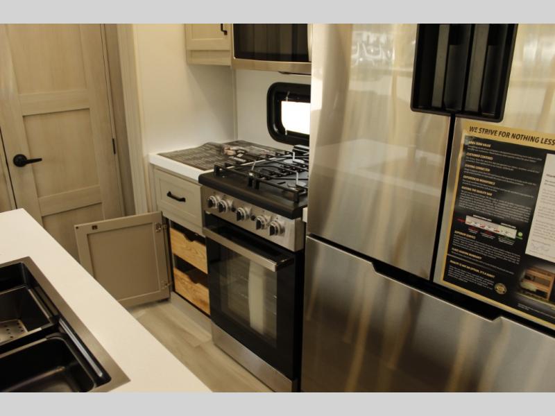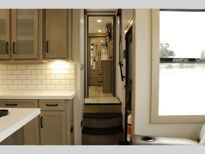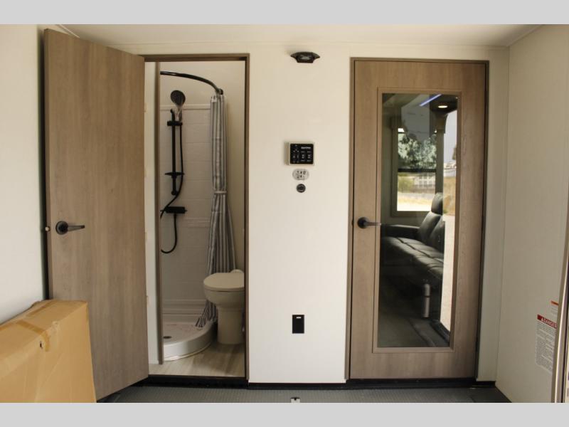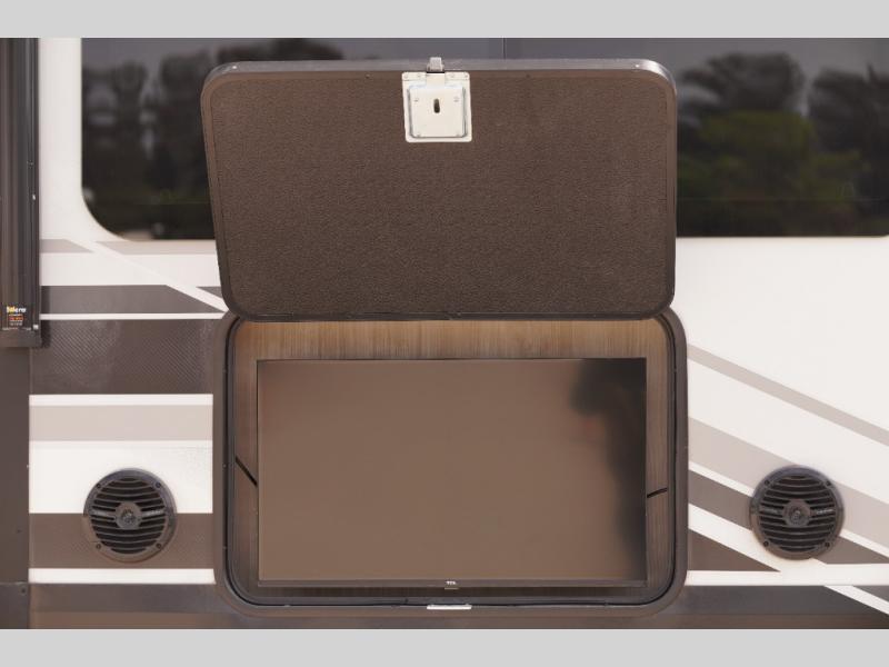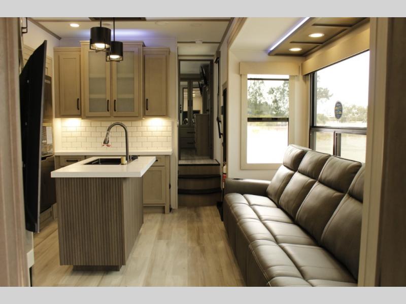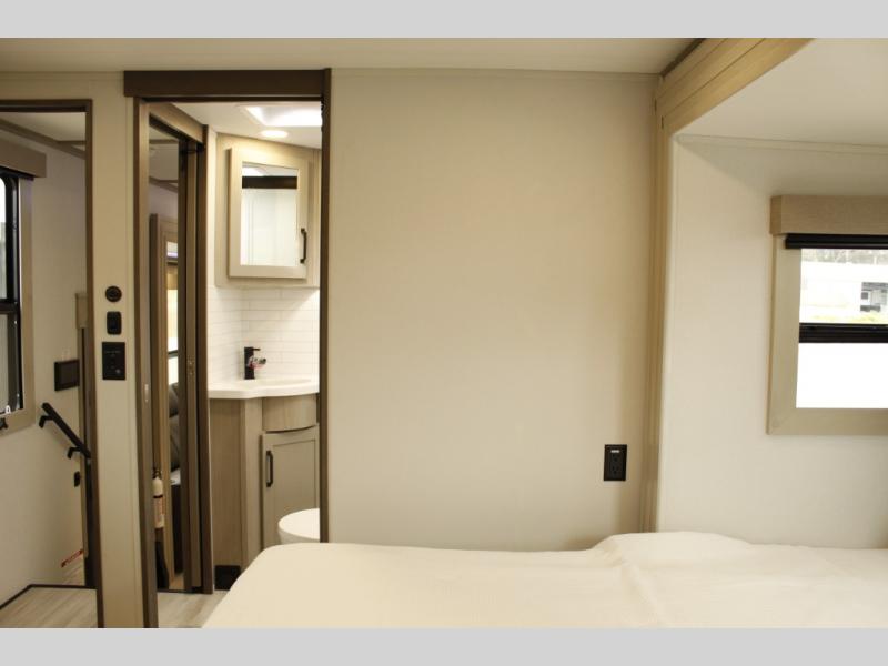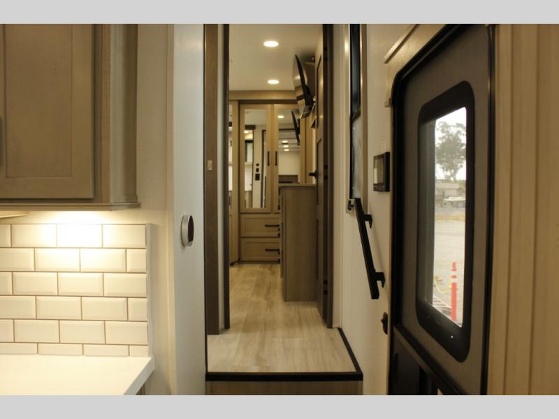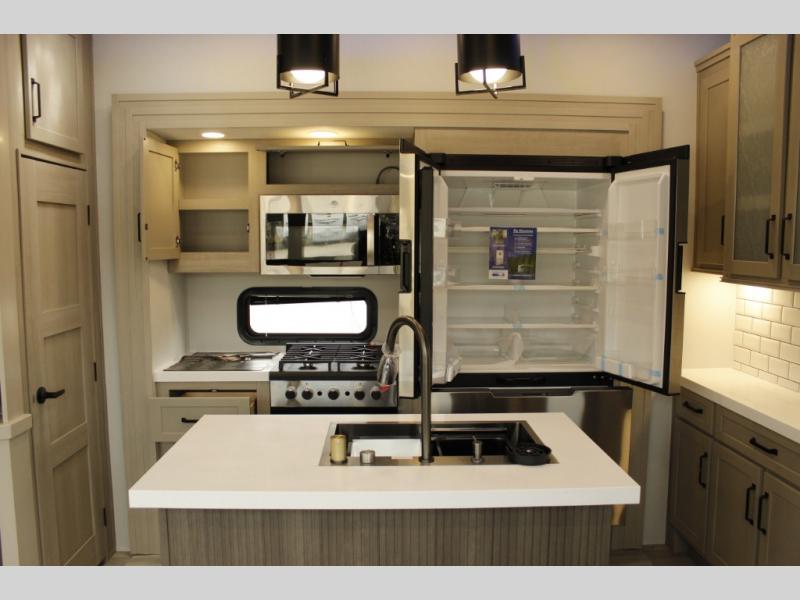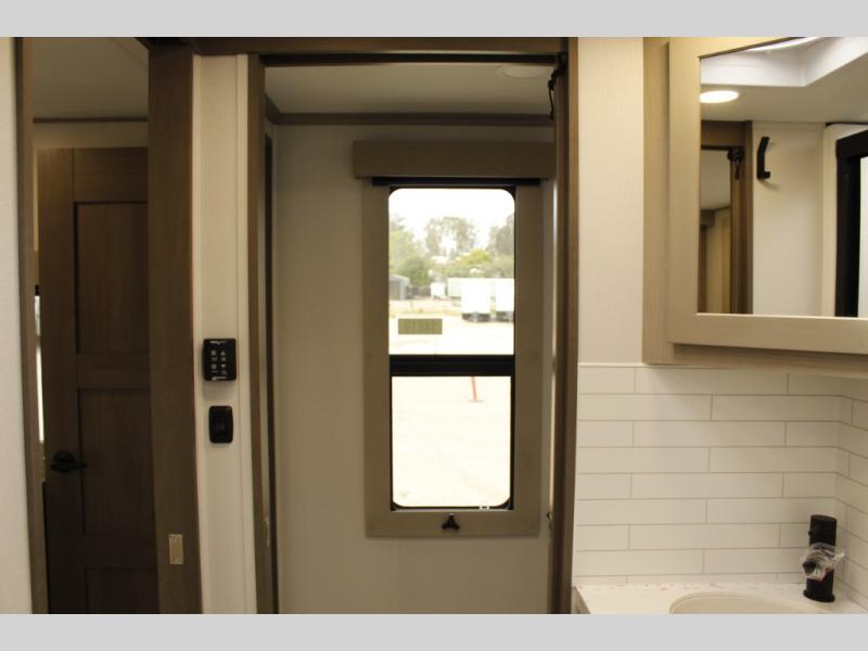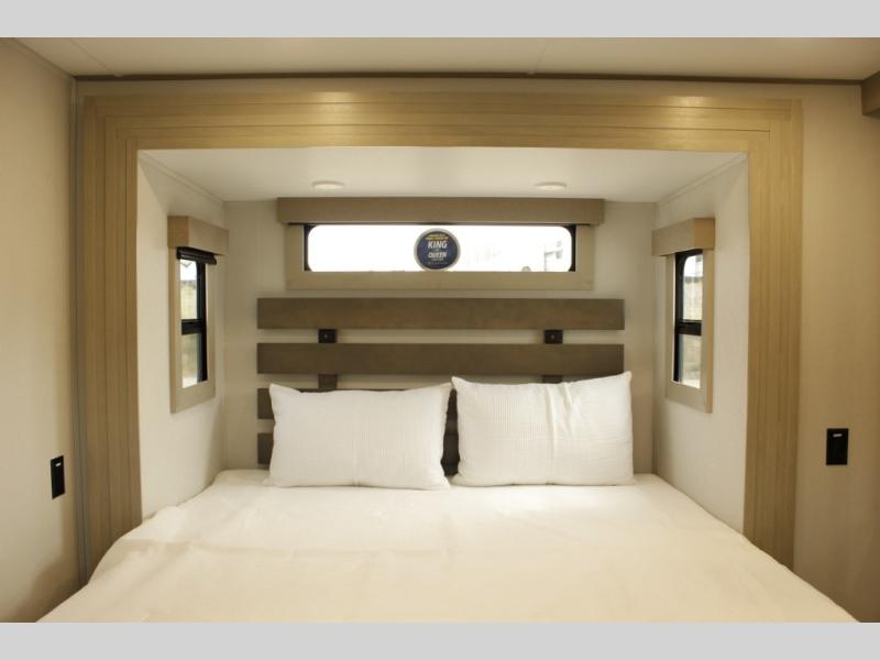 Load up your toys, your clothes and food and start your adventure as you smoothing tow this fifth wheel to your campsite. You will enjoy the Fast Ramp rear ramp door, the Ram-Air garage vents on both sides, and the 2,500 lb. rated flush-mount tie-downs to keep your toys secure. You will surely appreciate the full bathroom and LED TV, plus the option to add Happi-Jac rollover sofas/table with a top bed. The main area provides a living and kitchen area with a 49" LED TV and a fireplace, theatre seating and a free standing dinette, plus full kitchen amenities. There is also a new Smart Sink with a removable cutting board, produce strainer and glass rinser you are sure to love. Head up front to use the full bathroom with a one-piece fiberglass shower with a glass door and teak seat, and fall quickly to sleep on your own queen bed or choose a king option in the front bedroom.