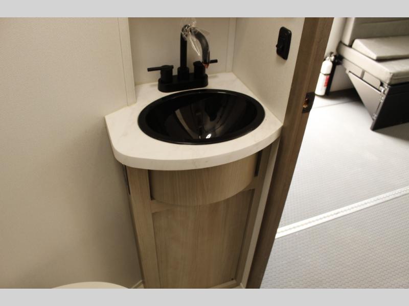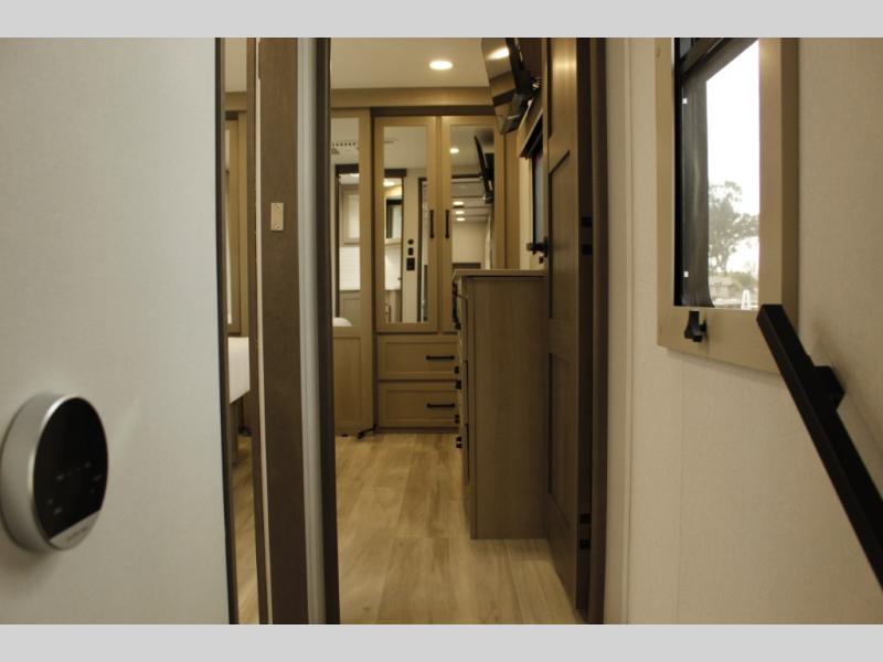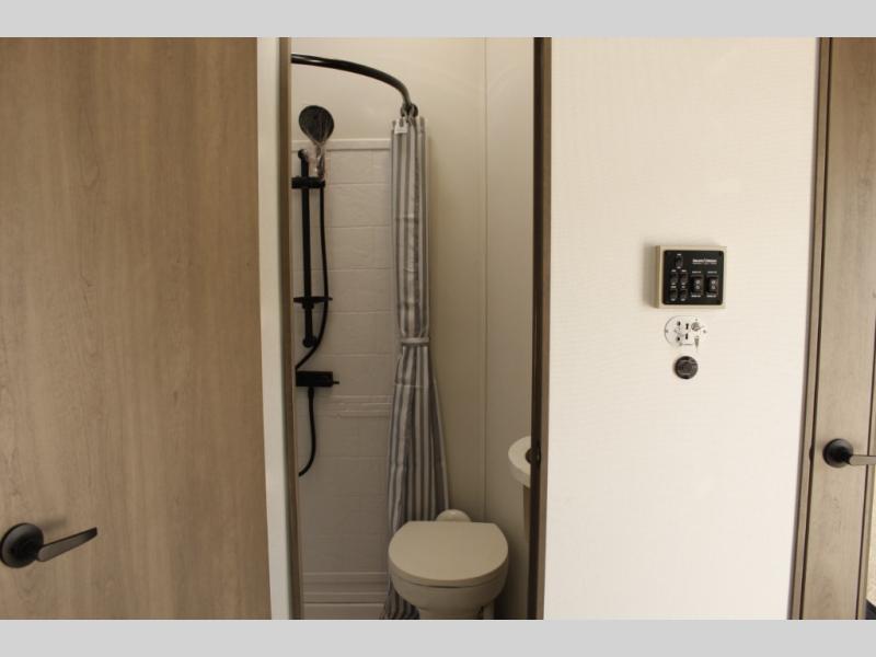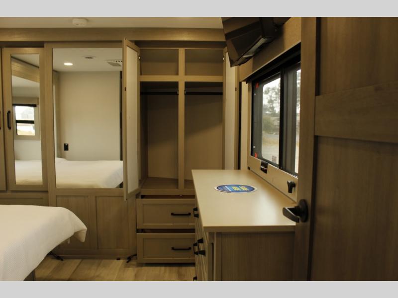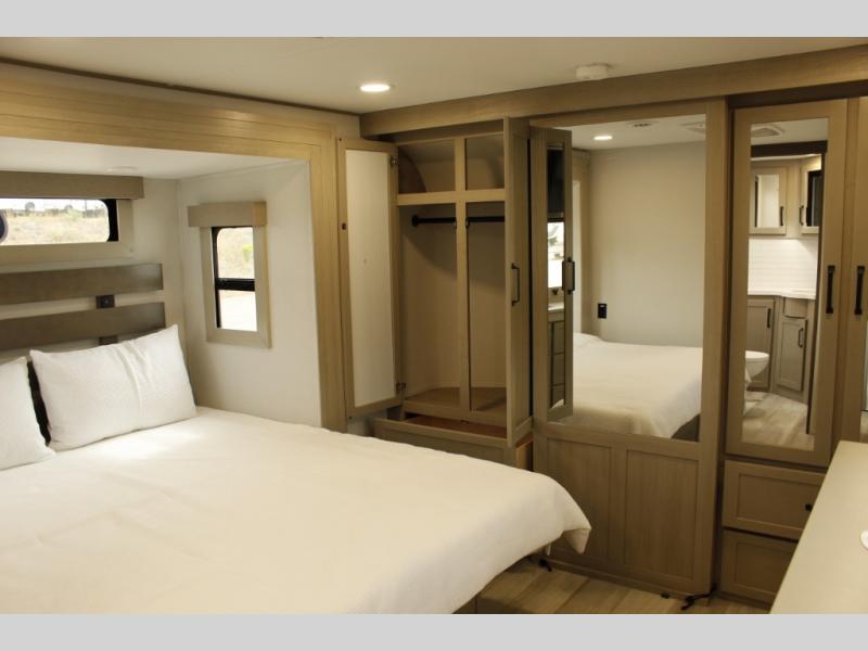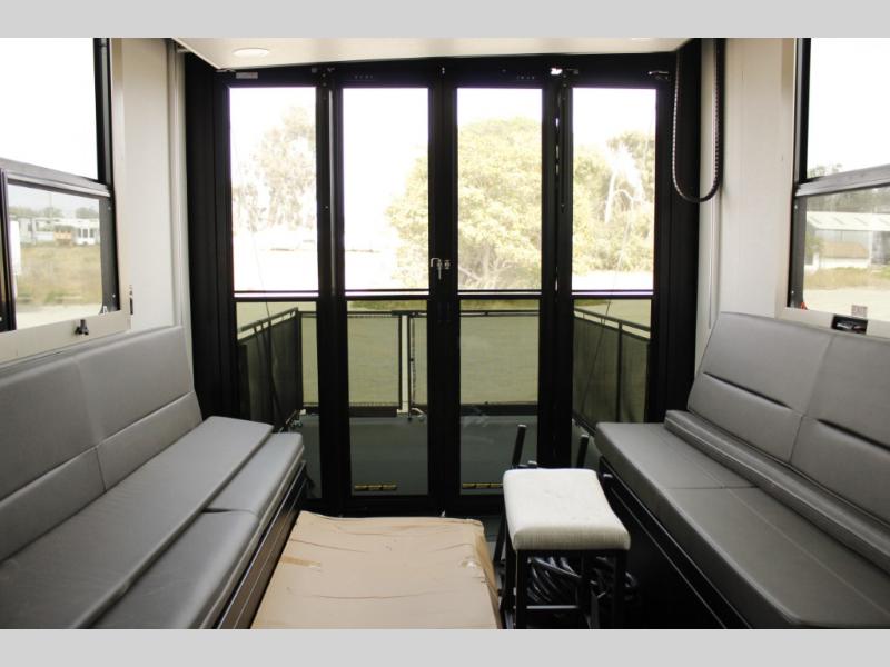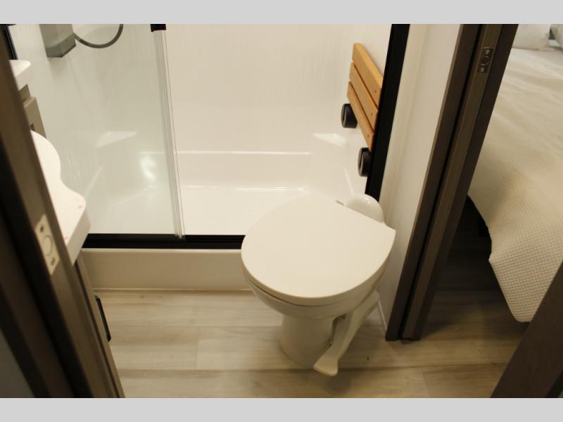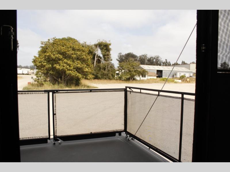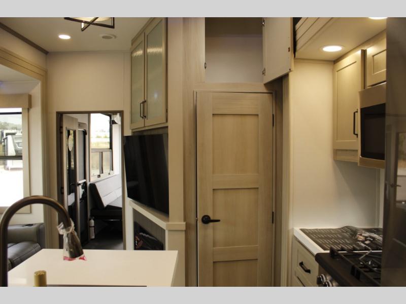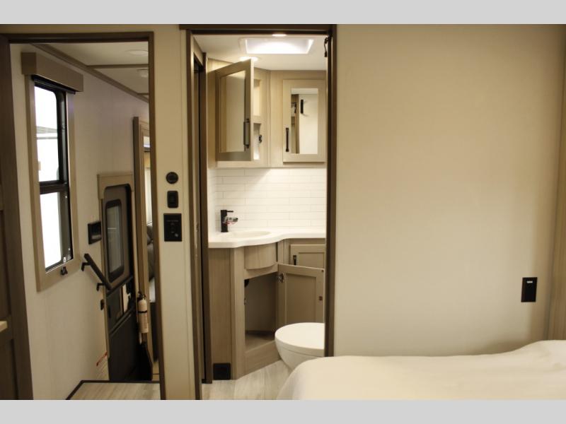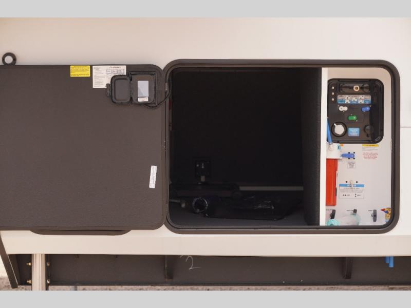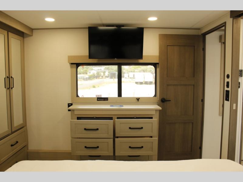 Load up your toys, your clothes and food and start your adventure as you smoothing tow this fifth wheel to your campsite. You will enjoy the Fast Ramp rear ramp door, the Ram-Air garage vents on both sides, and the 2,500 lb. rated flush-mount tie-downs to keep your toys secure. You will surely appreciate the full bathroom and LED TV, plus the option to add Happi-Jac rollover sofas/table with a top bed. The main area provides a living and kitchen area with a 49" LED TV and a fireplace, theatre seating and a free standing dinette, plus full kitchen amenities. There is also a new Smart Sink with a removable cutting board, produce strainer and glass rinser you are sure to love. Head up front to use the full bathroom with a one-piece fiberglass shower with a glass door and teak seat, and fall quickly to sleep on your own queen bed or choose a king option in the front bedroom.