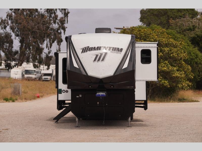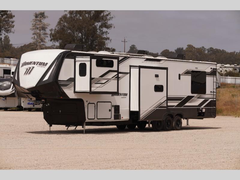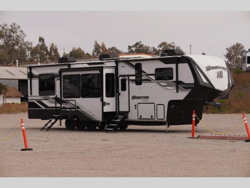 The Momentum fifth wheel toy haulers by Grand Design are built for four seasons of travel with your off-road toys and include luxurious accommodations throughout for extreme living! Each is constructed to a superior standard with the thermal roof design, the full-laminated walls, and the triple insulated garage floor. The MORryde CRE3000 suspension system and rubber pin box, plus the upgraded axle hangers provide the performance and smooth towing you desire, while the interior offers luxury such as color changing LED accent lighting, raised panel hardwood cabinet doors with hidden hinges, and a central vacuum system. Each toy hauler also includes four packages, including the Garage Package with Tuff-Ply gas and oil resistant flooring, the Weather-Tek Package with a Stealth AC System, and the Interior Luxury Package with solid surface countertops!