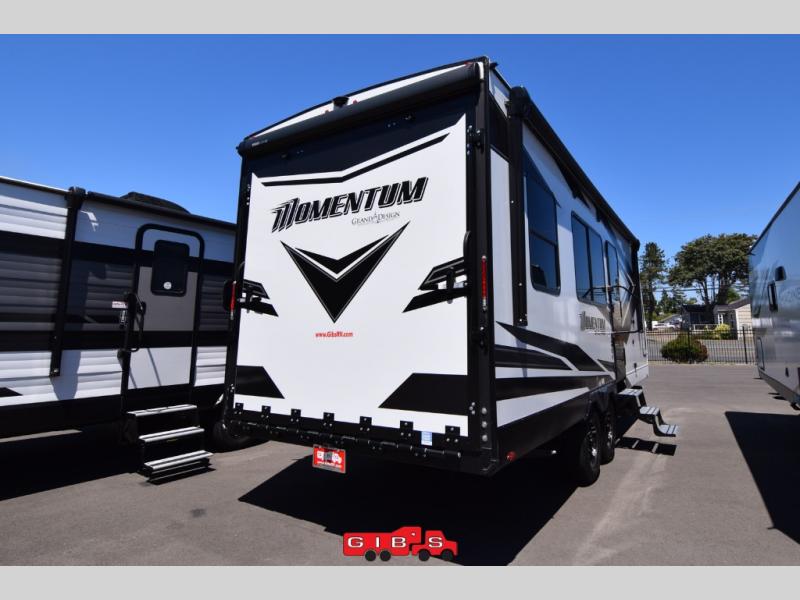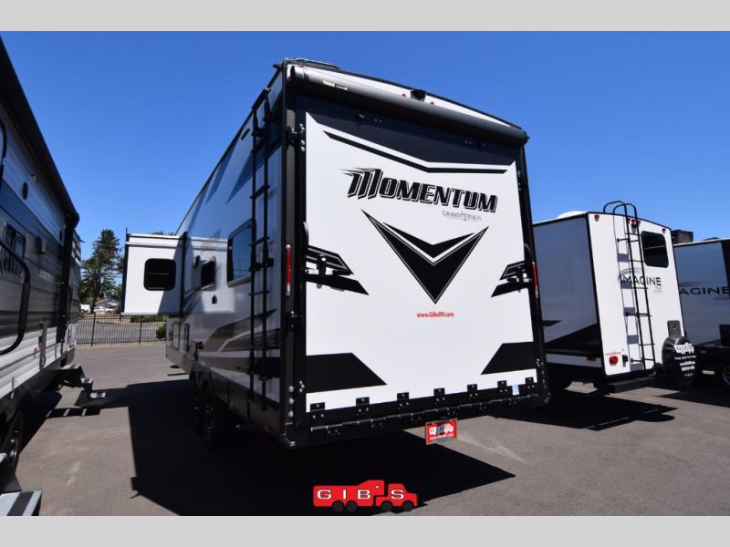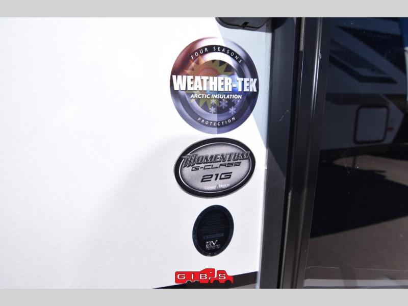 Are you looking for adventure and fun? The Momentum G-Class toy hauler by Grand Design will help you find it! You can explore during any season you choose with the Insulation Package that includes a heated and enclosed underbelly with suspended tanks, a high-capacity furnace, a moisture barrier floor enclosure, and cabinet-mounted heat ducts. Each model includes a fuel station with an interior and exterior gauge, a dovetail rear rend, and 2,500-LB tie-downs anchored into the chassis. Throughout the Momentum G-Class interior, you'll enjoy many comfortable features like large panoramic windows, a shower skylight, USB chargers in the bedroom, and residential cabinetry.