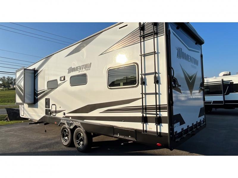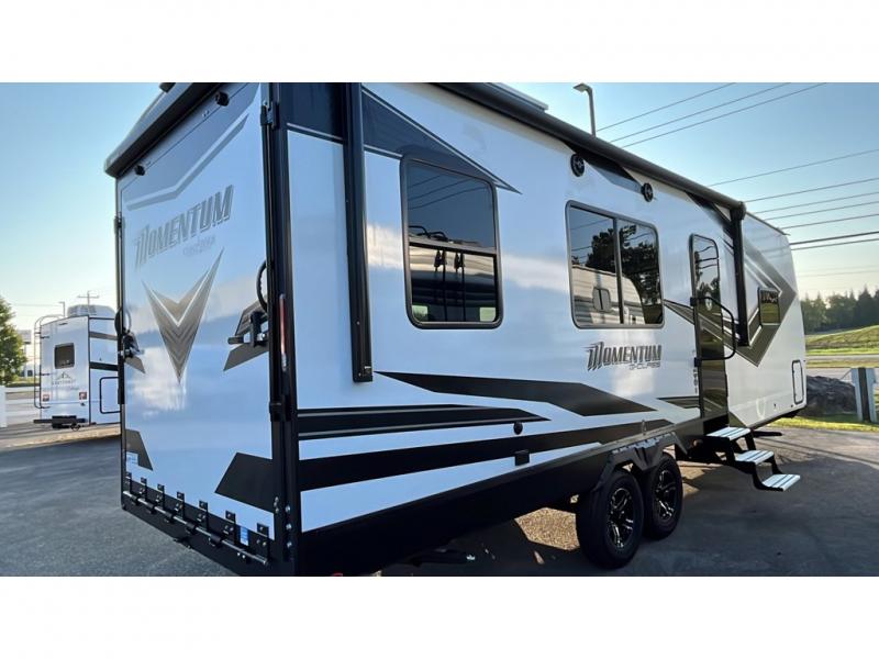 Are you looking for adventure and fun? The Momentum G-Class toy hauler by Grand Design will help you find it! You can explore during any season you choose with the Insulation Package that includes a heated and enclosed underbelly with suspended tanks, a high-capacity furnace, a moisture barrier floor enclosure, and cabinet-mounted heat ducts. Each model includes a fuel station with an interior and exterior gauge, a dovetail rear rend, and 2,500-LB tie-downs anchored into the chassis. Throughout the Momentum G-Class interior, you'll enjoy many comfortable features like large panoramic windows, a shower skylight, USB chargers in the bedroom, and residential cabinetry.