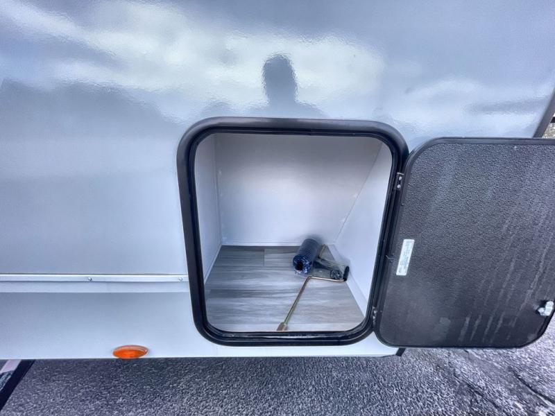 Clean up after a day of adventure in the full bath with walk-in shower, skylight, and dual entry, and fuel your toys for the next day with the 30-gallon fuel station outside. Pets are welcome with a convenient flip-up pet dish, and exterior storage keeps your gear organized and accessible.