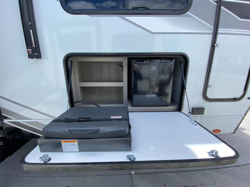 Just imagine you are unloading your toys at your favorite destination from 16' 6" of cargo space in this Momentum G-Class toy hauler. The chef of the family will love having the option to cook indoors or outdoors at the outside kitchen that includes an exterior refrigerator for cold drinks. You will have Happi-Jac rollover sofas and a third rollover sofa for your guests to sleep on, while you take the queen bed slide out in the front bedroom. And an optional top bed can be added above the sofas if you need more sleeping space!