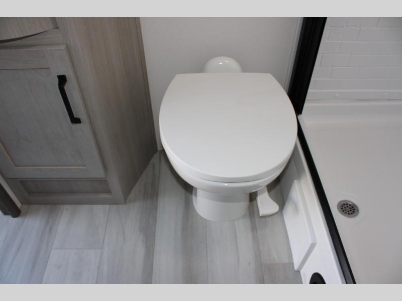 The front bedroom features a queen bed slide that opens up floor space and storage, giving you a quiet, private place to recharge. Direct access to the bathroom adds to the convenience, so there’s no stumbling around in the dark.