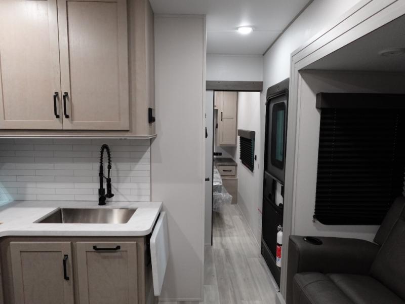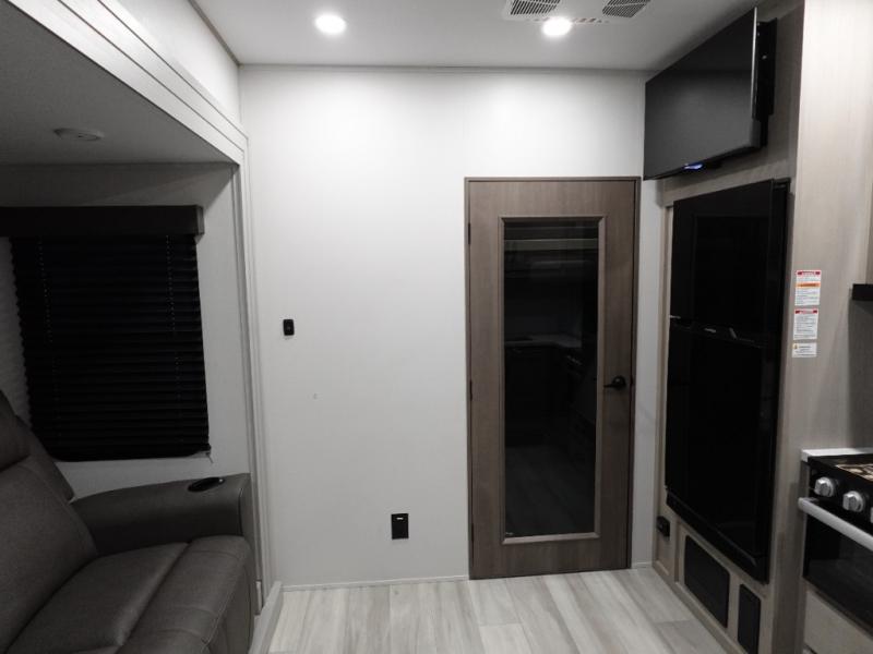 Start your engines for a fun weekend with your toys and your family in this Momentum G-Class toy hauler. The 11' separate garage includes Happi-Jac rollover sofas with a table and a top bed, plus a flip-up pet dish for your furry friends! There is even a second entry door which leads directly into the garage so that you don't have to walk through the entire trailer just to get to your cargo. In the front of this unit, you will have your own master suite that has private access to the residential walk-in shower in the dual-entry bathroom. The main living and kitchen area offers everything you need and would want, including theater seating and a TV with storage above the refrigerator!