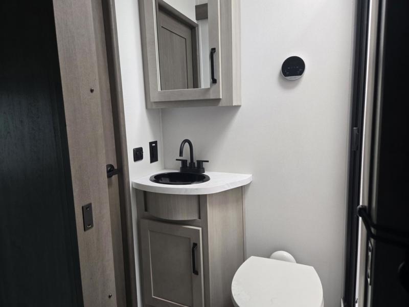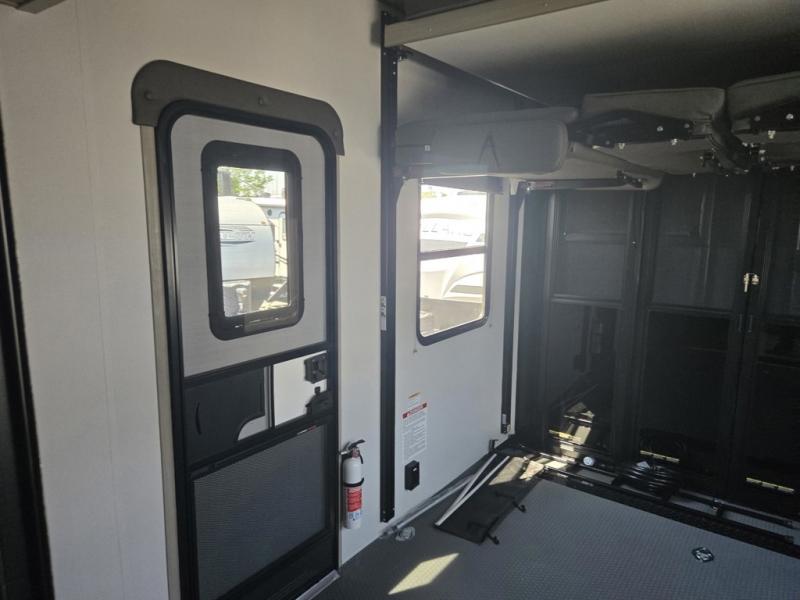 Start your engines for a fun weekend with your toys and your family in this Momentum G-Class toy hauler. The 11' separate garage includes Happi-Jac rollover sofas with a table and an optional top bed, plus a flip-up pet dish for your furry friends! There is even a second entry door which leads directly into the garage so that you don't have to walk through the entire trailer just to get to your cargo. In the front of this unit, you will have your own master suite that has private access to the residential walk-in shower in the dual-entry bathroom. The main living and kitchen area offers everything you need and would want, including theater seating and a TV with storage above the refrigerator!