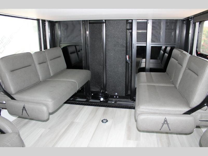Happi-Jac Rollover Sofas: The garage features Happi-Jac sofas with a table, providing a cozy space for dining or hanging out. Need extra sleeping space? Add the optional top bed above the sofas.