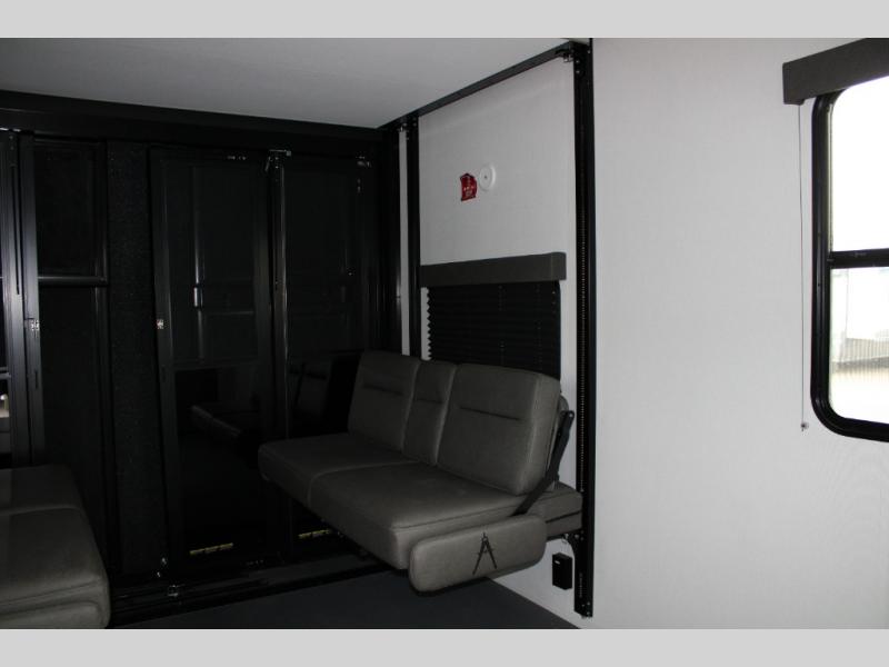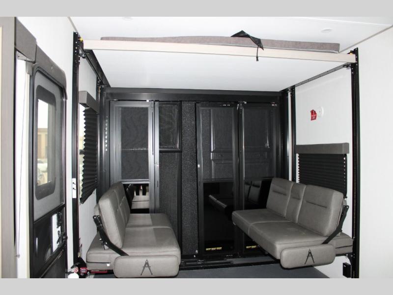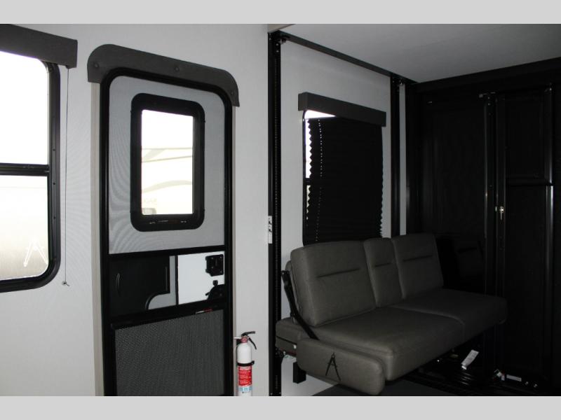 13' Separate Garage: Load up your ATVs, dirt bikes, or kayaks with ease. The garage includes Happi-Jac sofas with a table, offering a comfortable spot to relax or dine when the toys are out. Need more sleeping space? Opt for the top bed above the sofas.