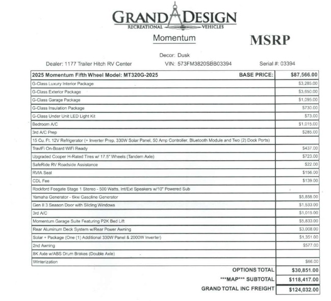 New 2025 Grand Design Momentum G-Class 320G Toy Hauler Fifth Wheel
