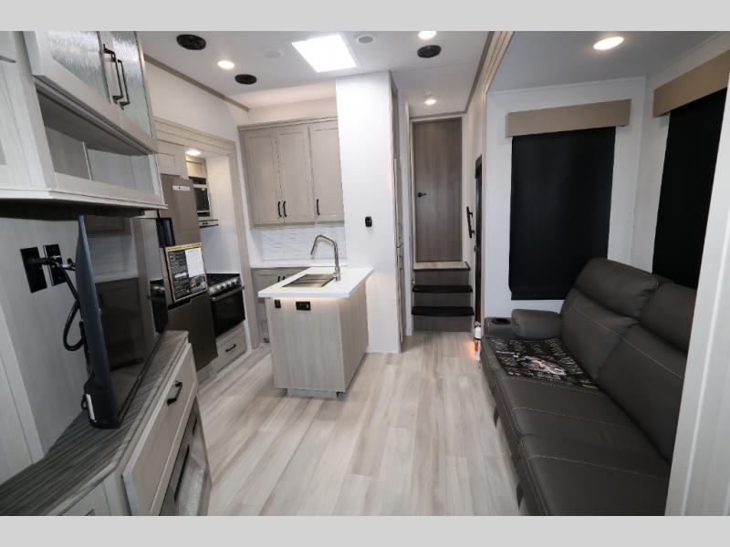 Are you looking for adventure and fun? The Momentum G-Class toy hauler by Grand Design will help you find it! You can explore during any season you choose with the Insulation Package that includes a heated and enclosed underbelly with suspended tanks, a high-capacity furnace, a moisture barrier floor enclosure, and cabinet-mounted heat ducts. Each model includes a fuel station with an interior and exterior gauge, a dovetail rear rend, and 2,500-LB tie-downs anchored into the chassis. Throughout the Momentum G-Class interior, you'll enjoy many comfortable features like large panoramic windows, a shower skylight, USB chargers in the bedroom, and residential cabinetry.